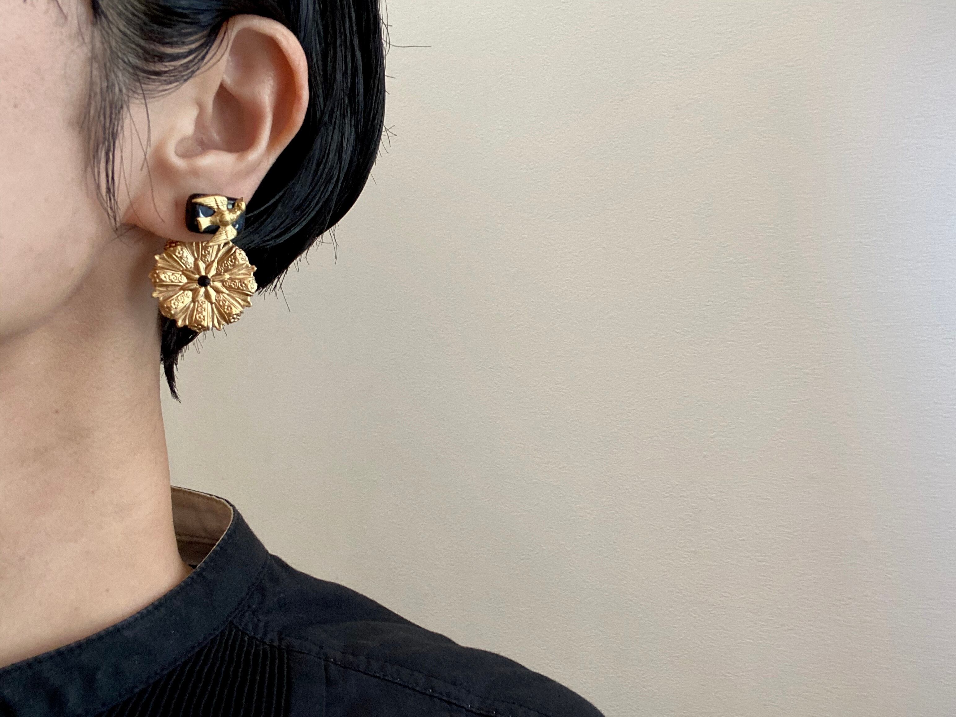 華やかな真鍮のお花にブラックのスワロフスキーを添えて統一感を持たせつつ、ほんの少しシャープに引き締めました。