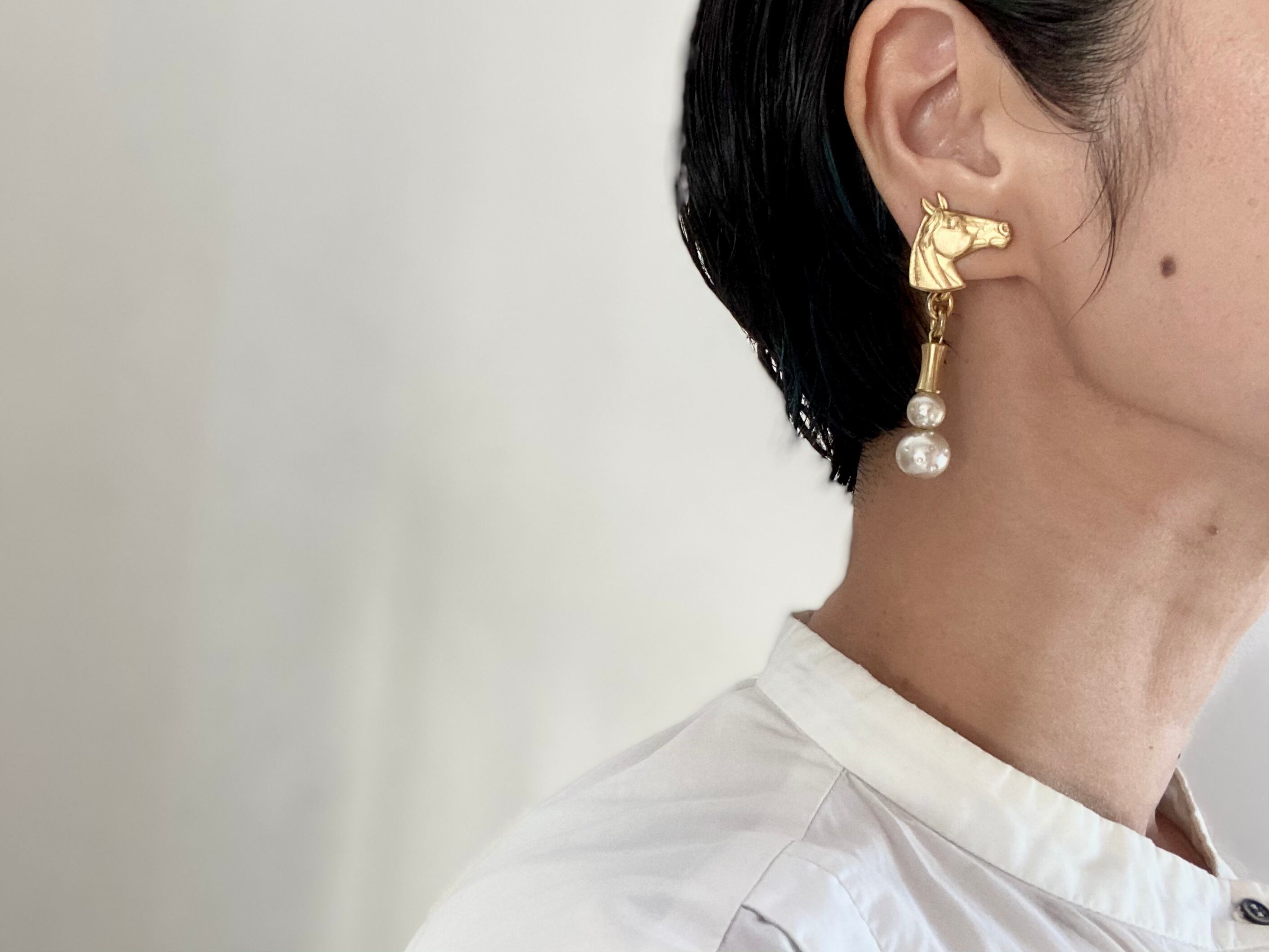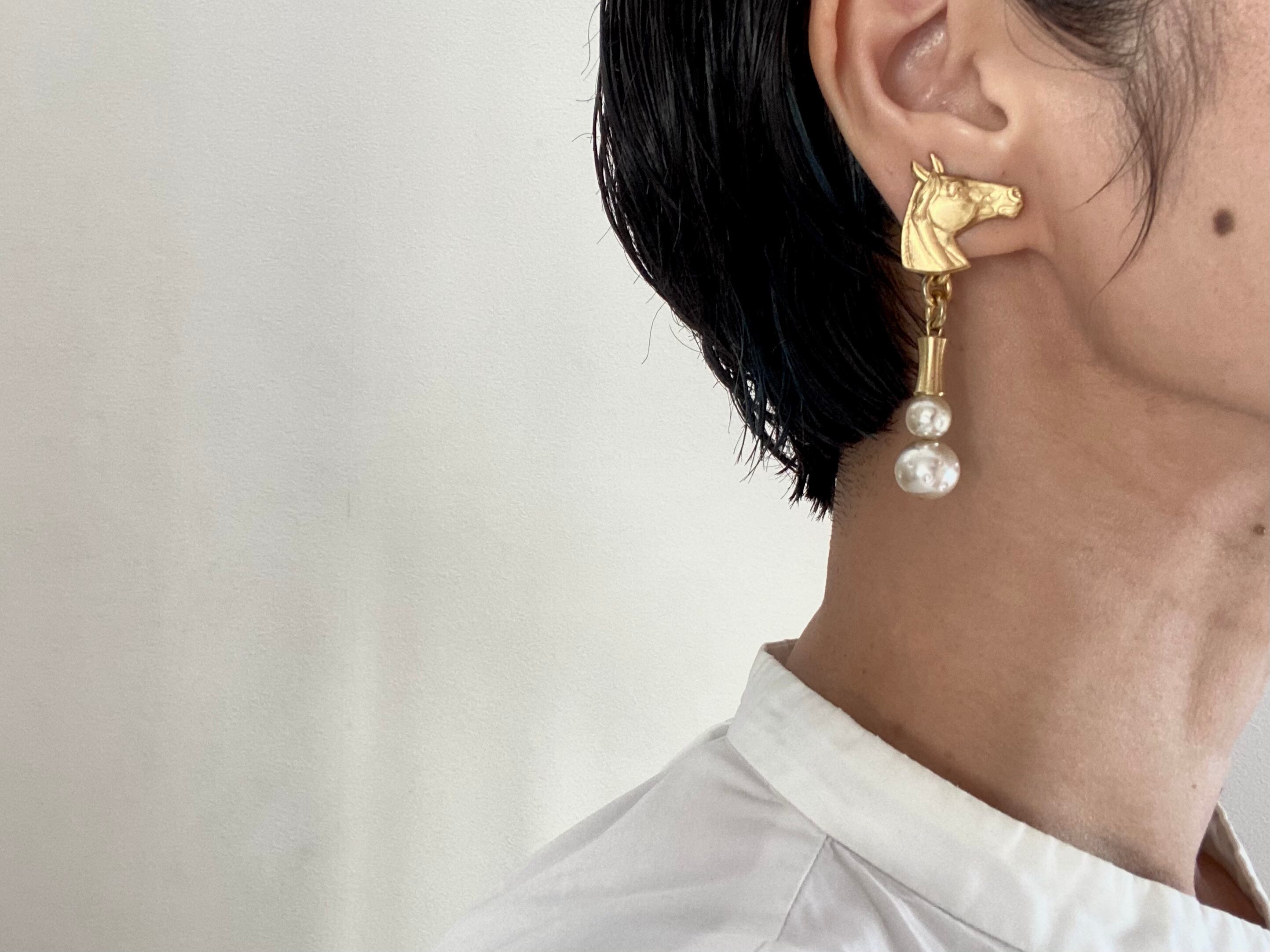 個性的な馬のパーツに負けないよう、対にはヴィンテージボタニカルパーツに小さなスワロフスキーを添えてアクセントを付けました。