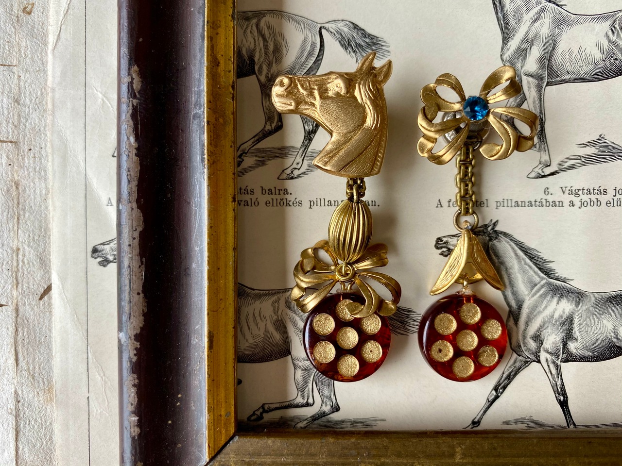 真鍮のリボンや馬のパーツがかわいらしいですが、水玉のドイツヴィンテージビーズが妖しい雰囲気を醸し出しています。