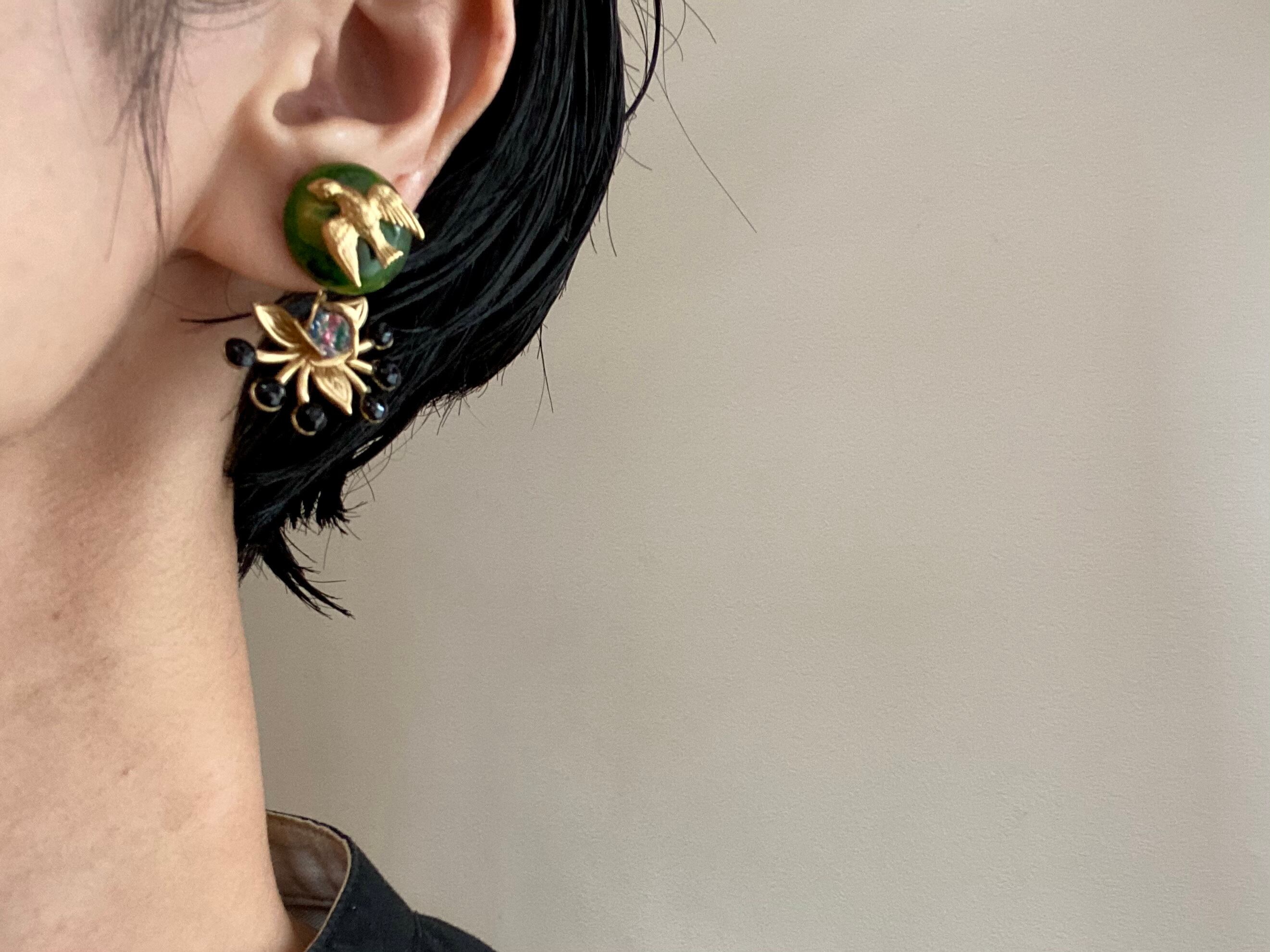 色鮮やかなヴィンテージスワロフスキーの周りをブラックのスワロフスキーで囲って妖しげな雰囲気を作りました。