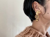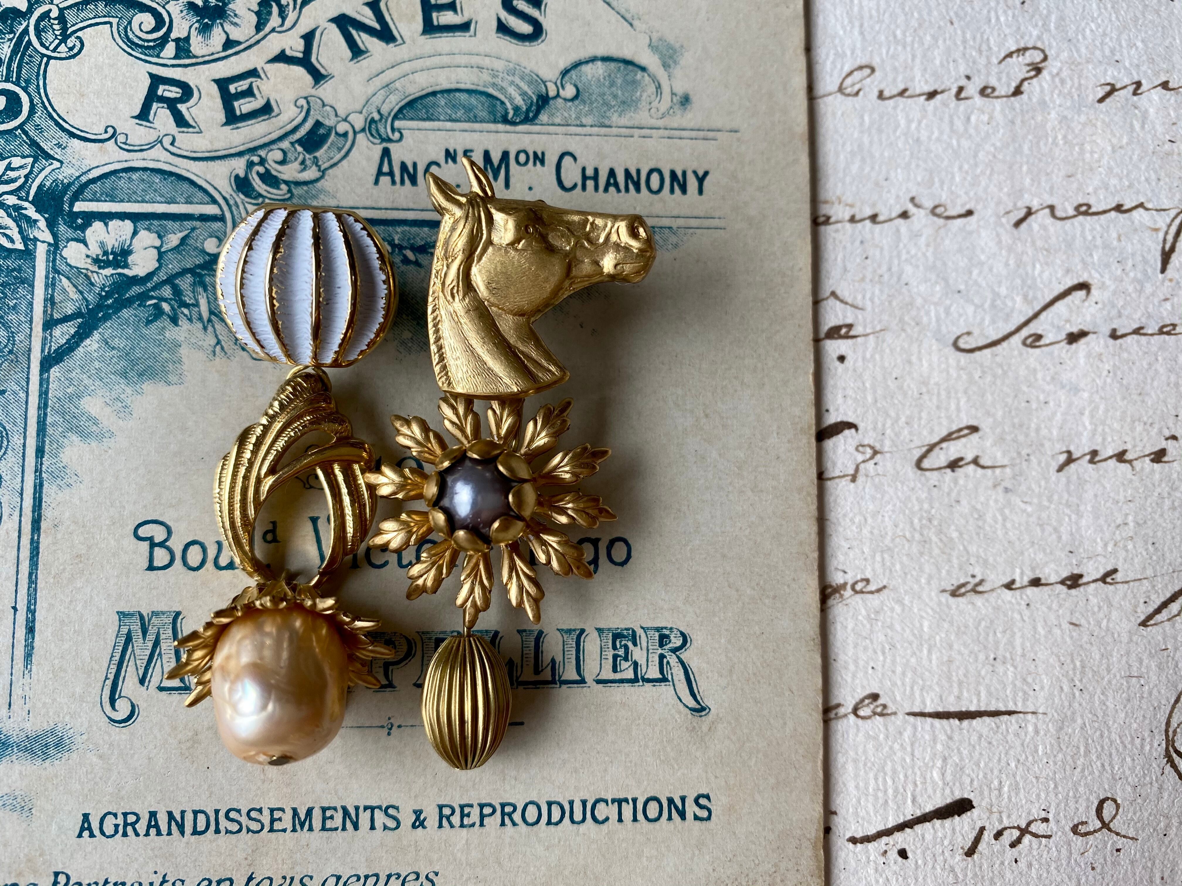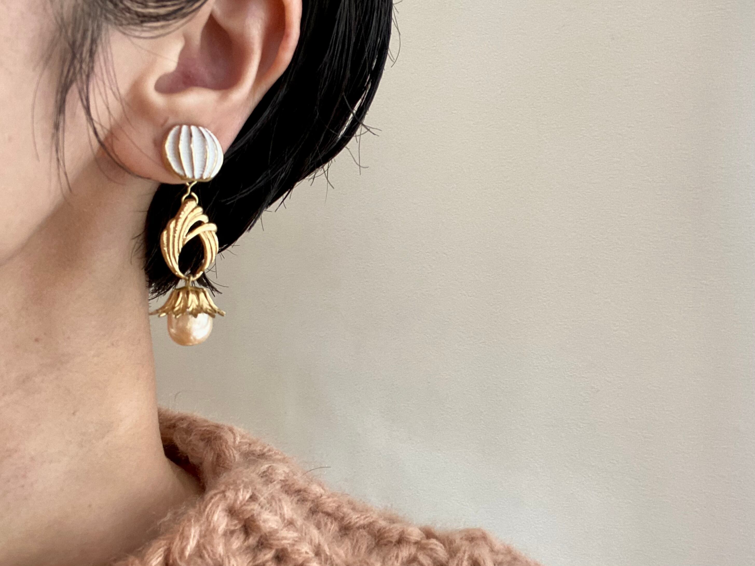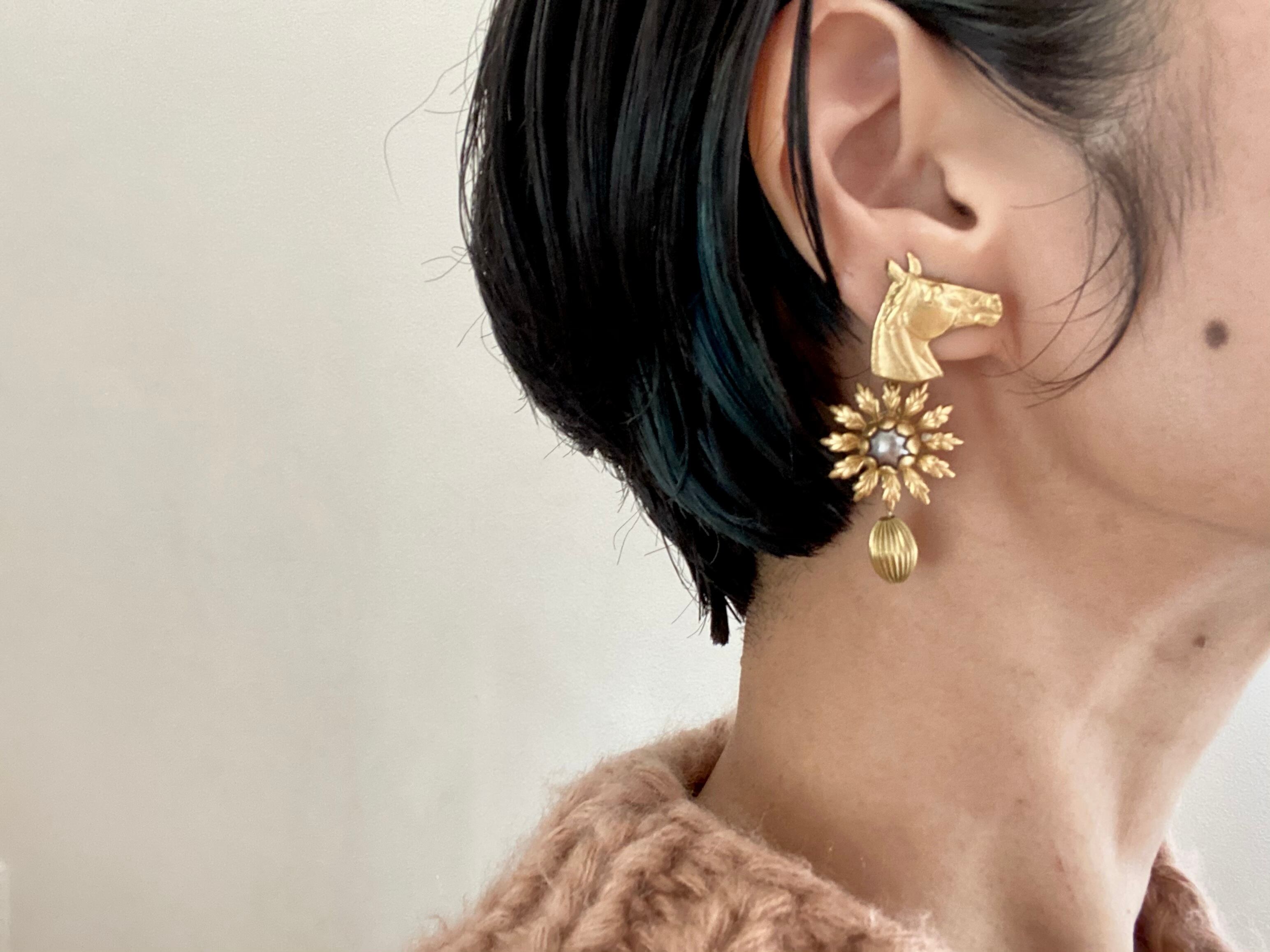 ヴィンテージパーツを組み合わせてアシンメトリーなピアスを作りました。