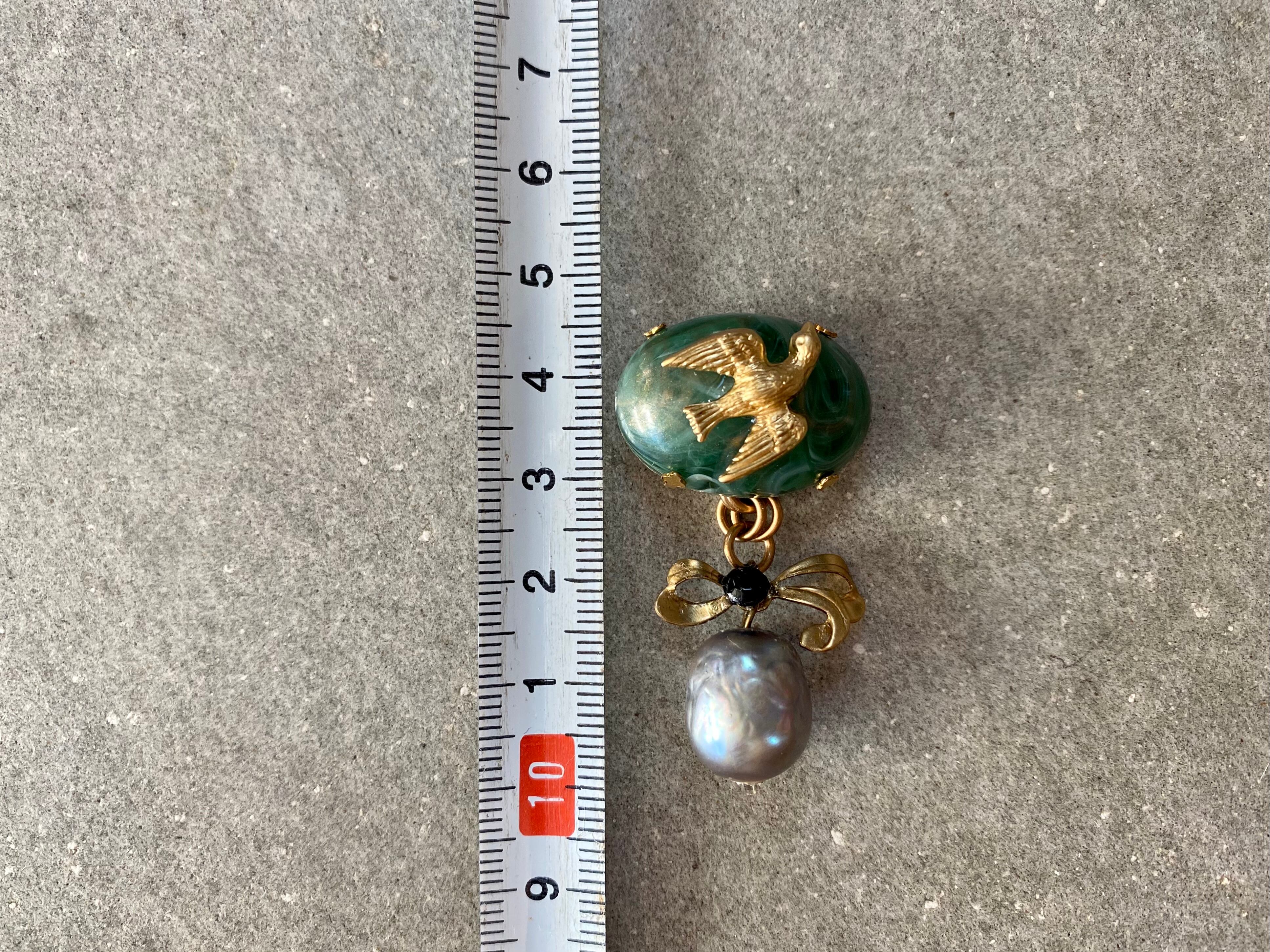 グリーンにゴールドのマーブルが入った、ドイツのヴィンテージカボションにミリアムハスケルのドーブを添えて、ブルーグレーのヴィンテージガラスパールを取り付けました。