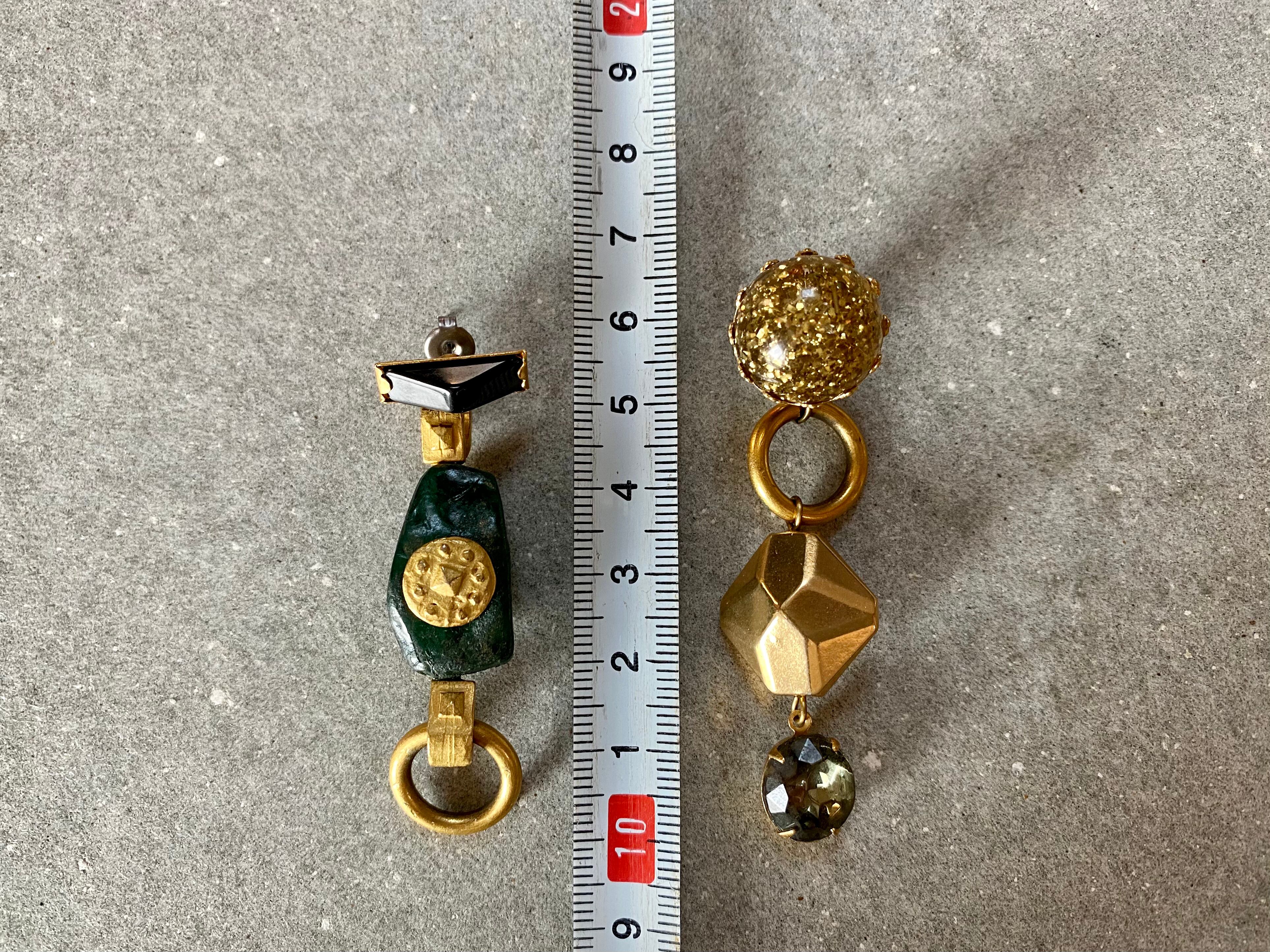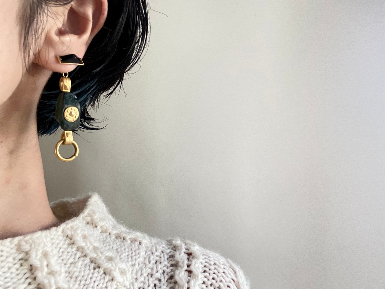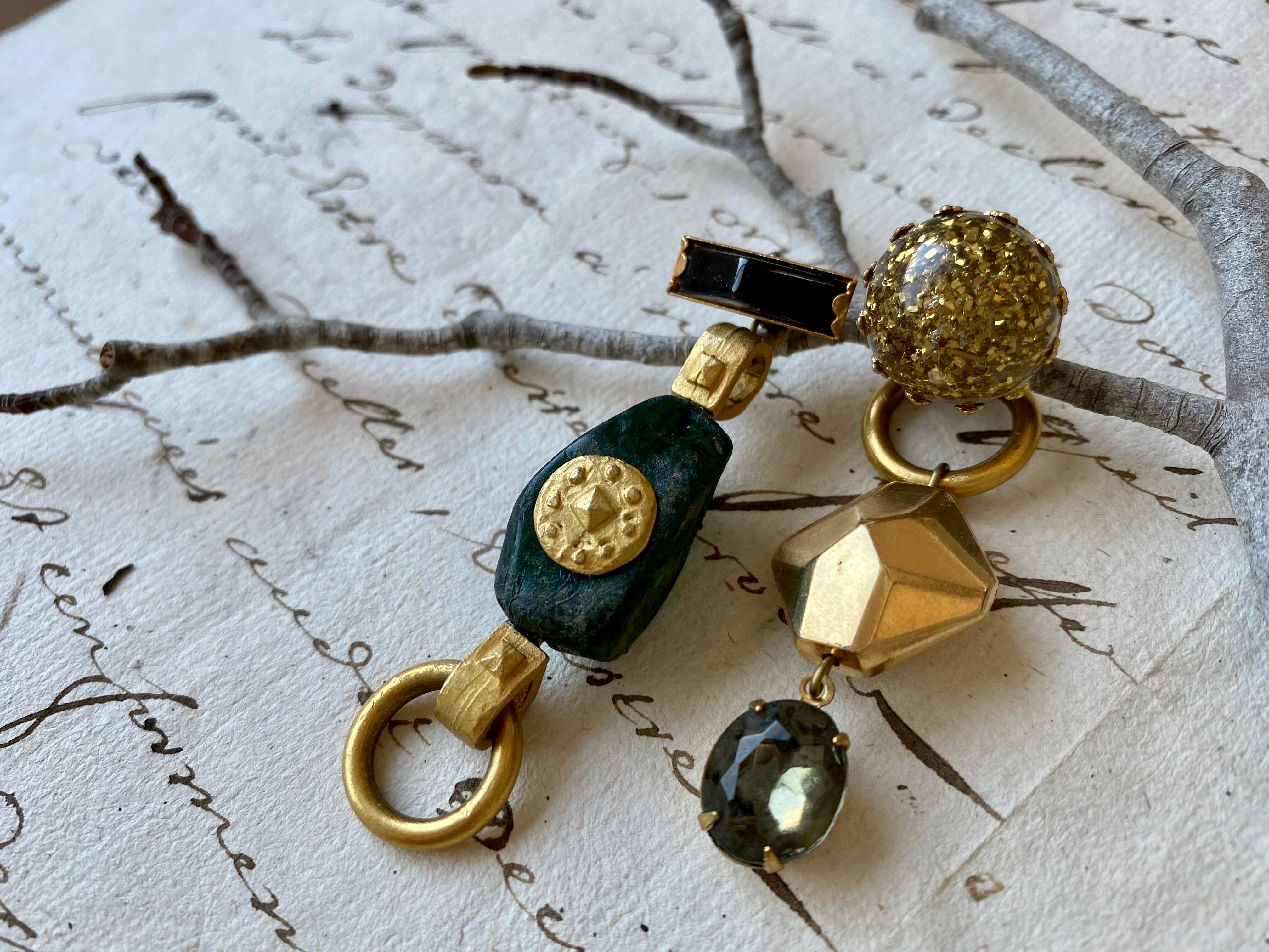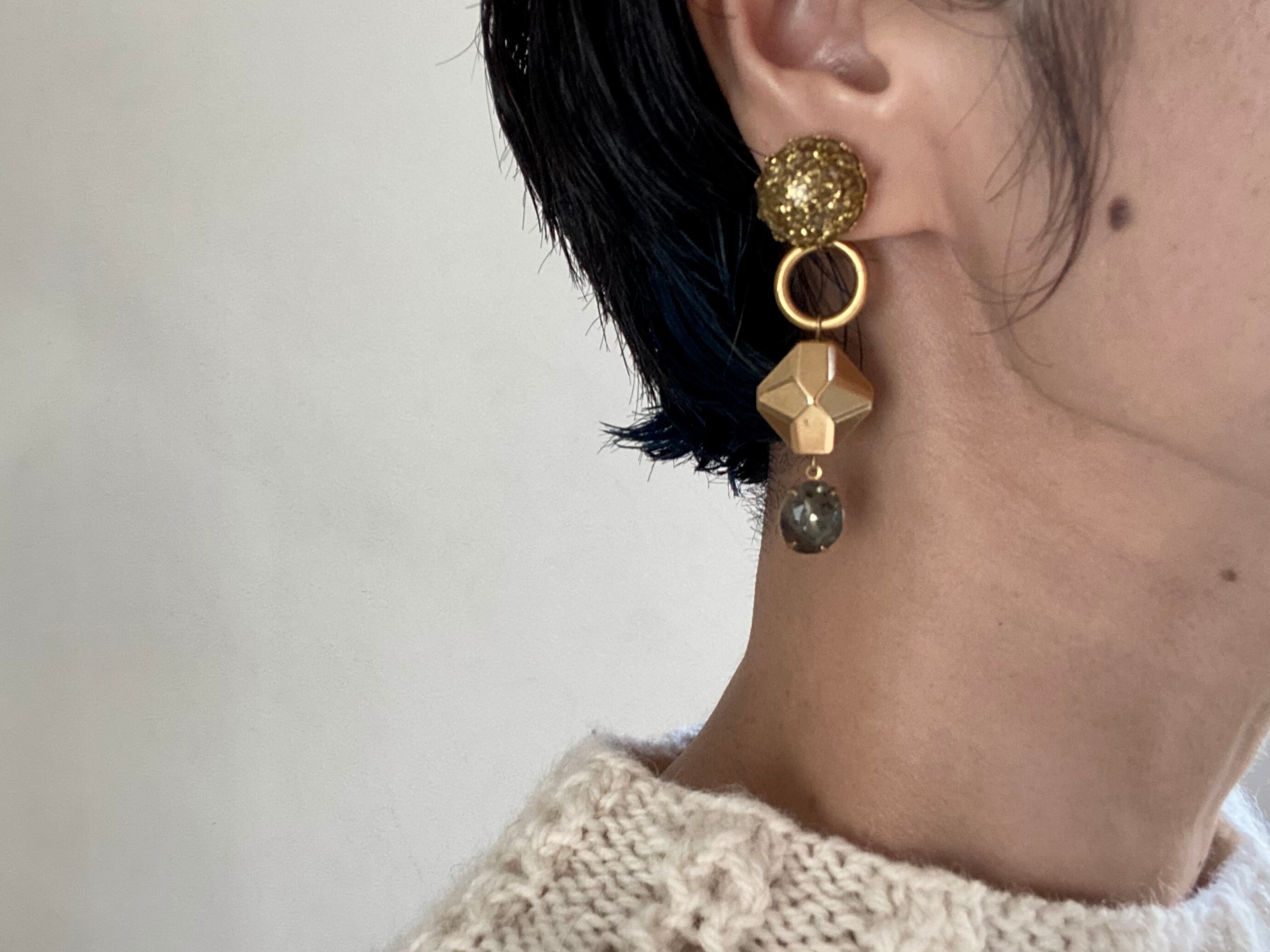 ヴィンテージパーツを組み合わせてアシンメトリーなピアスを作りました。