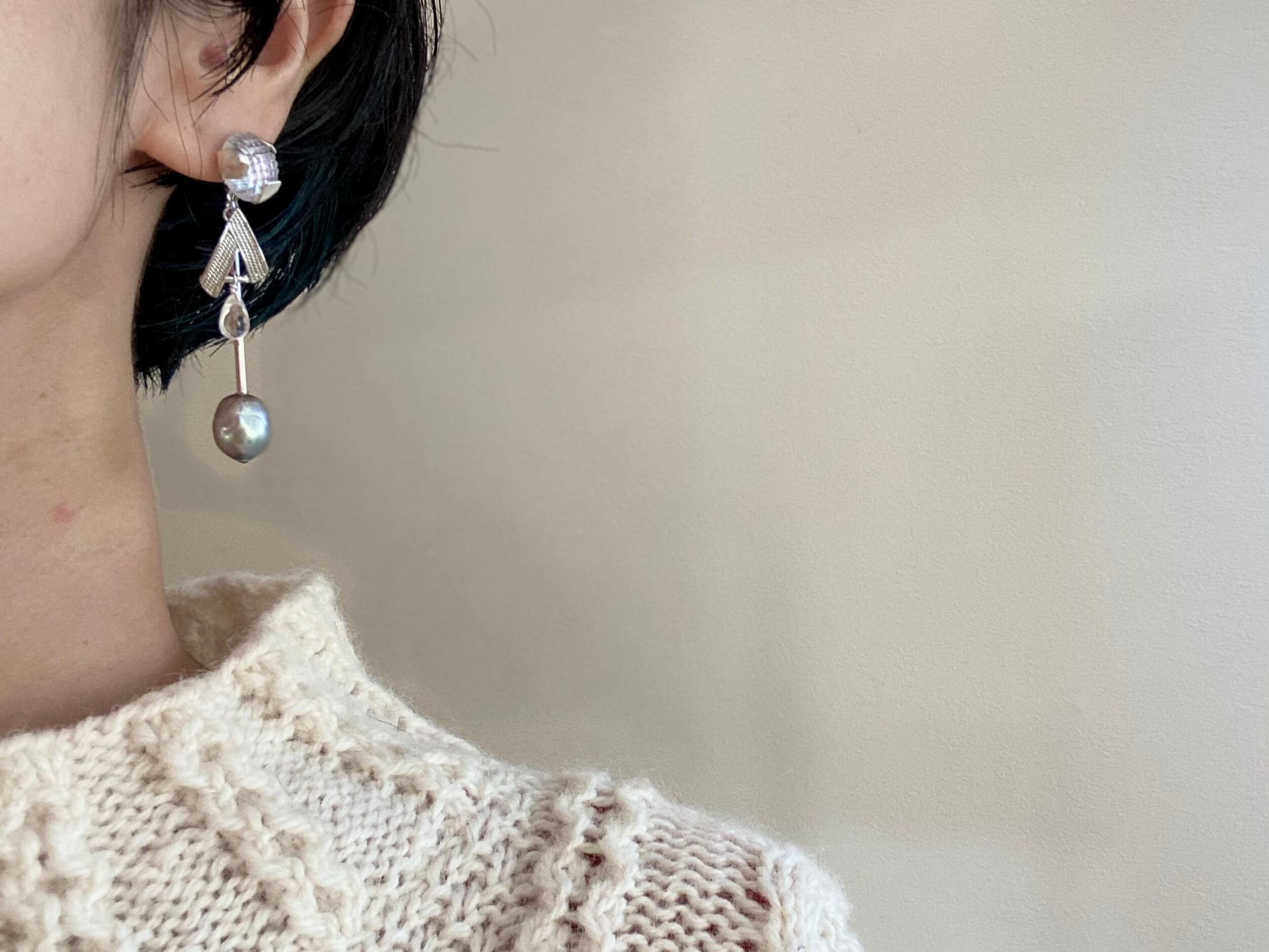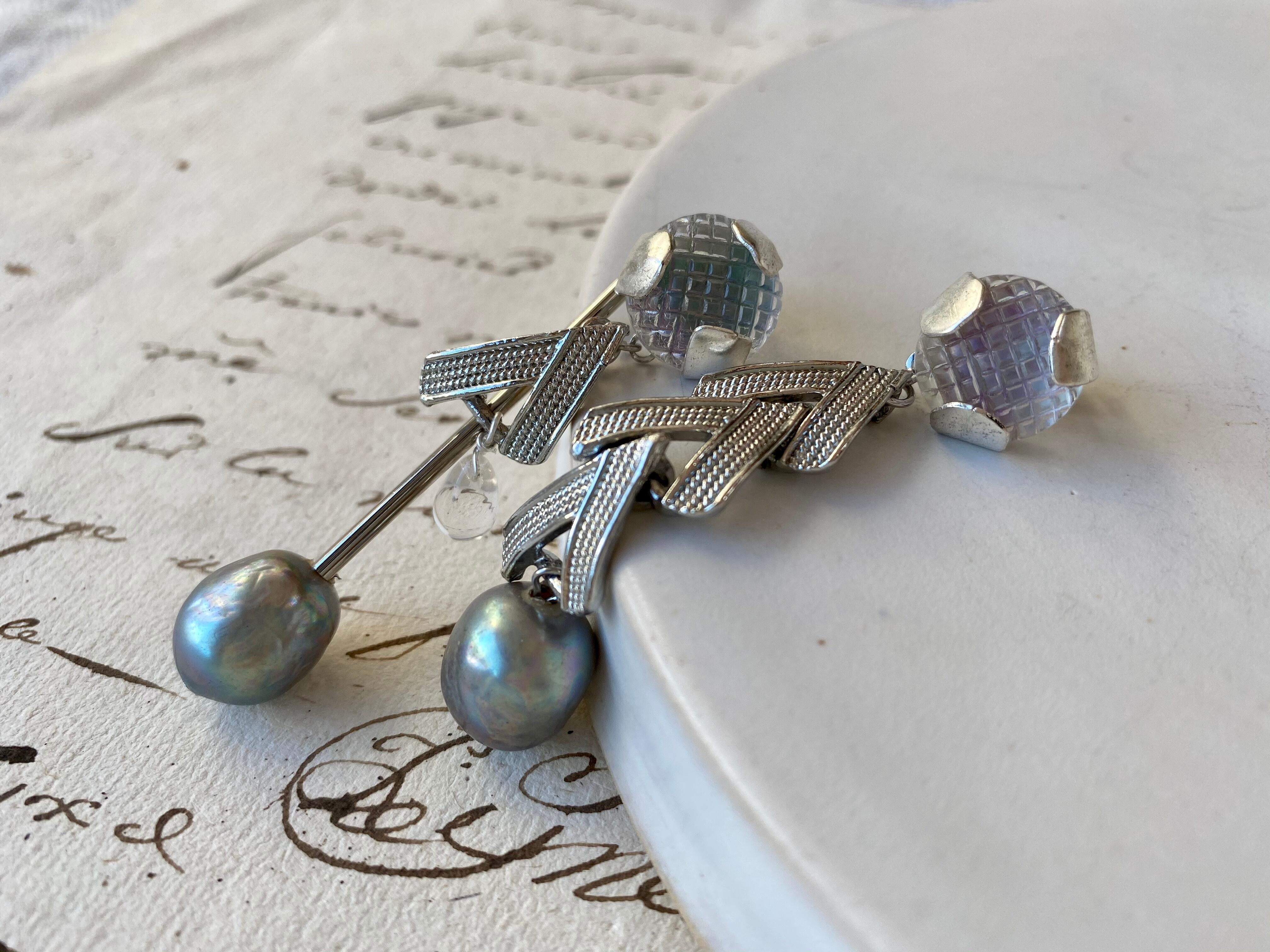 それにシルバーのヴィンテージパーツやグレーのガラスパールなどを合わせて、全体的に冷たい空気感を纏っています。