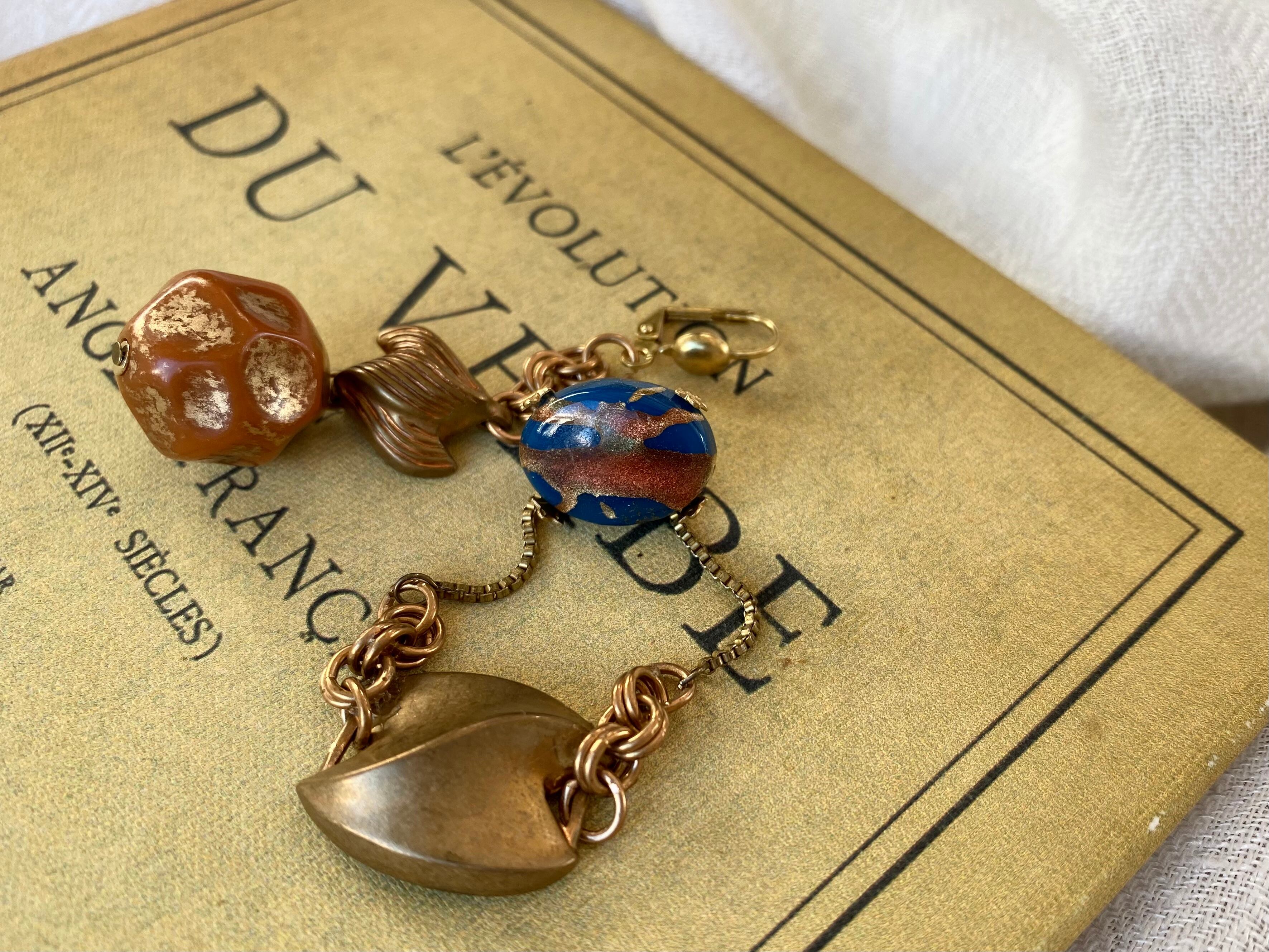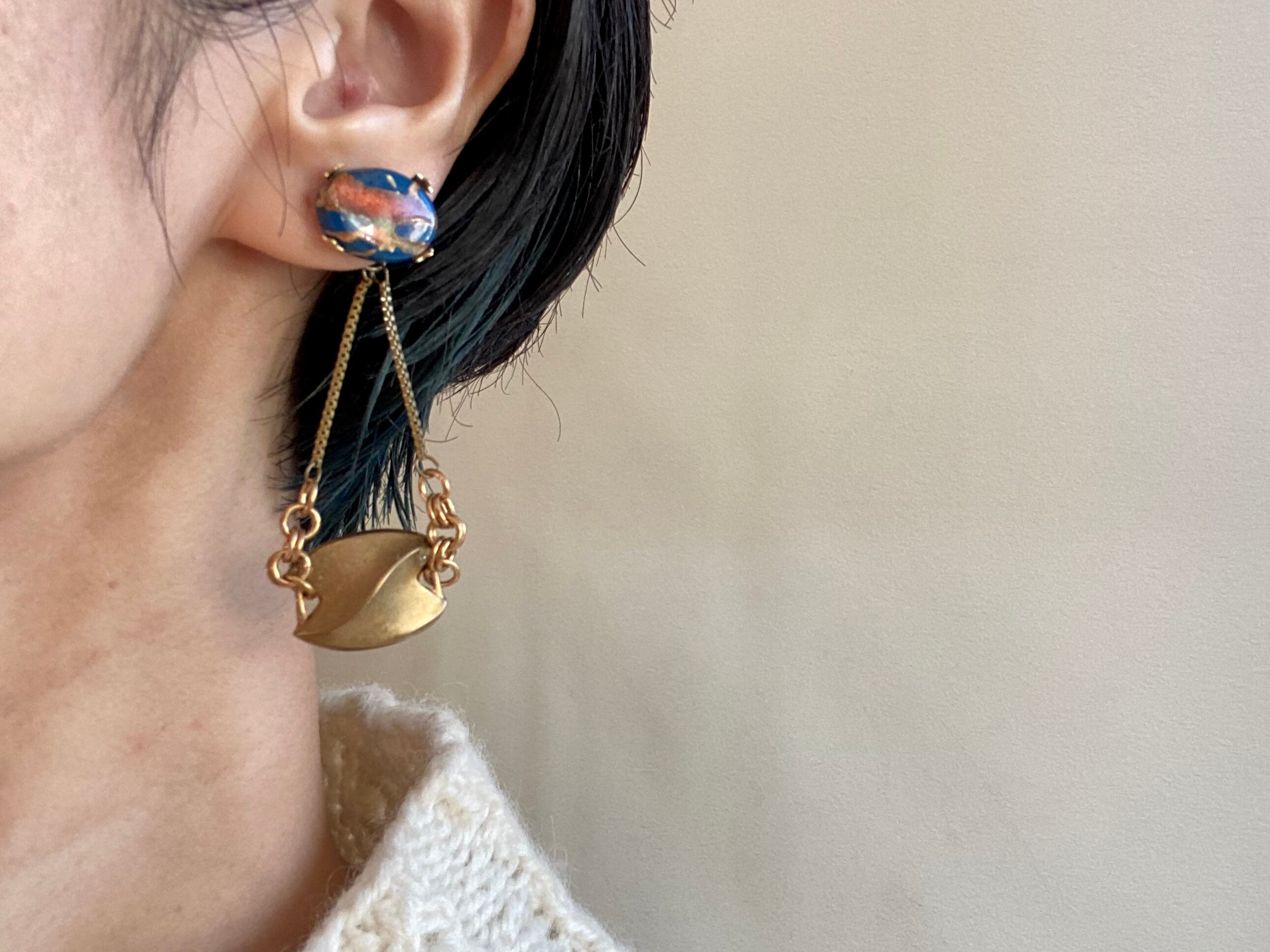 ヴィンテージパーツを組み合わせて、アシンメトリーなピアスを作りました。