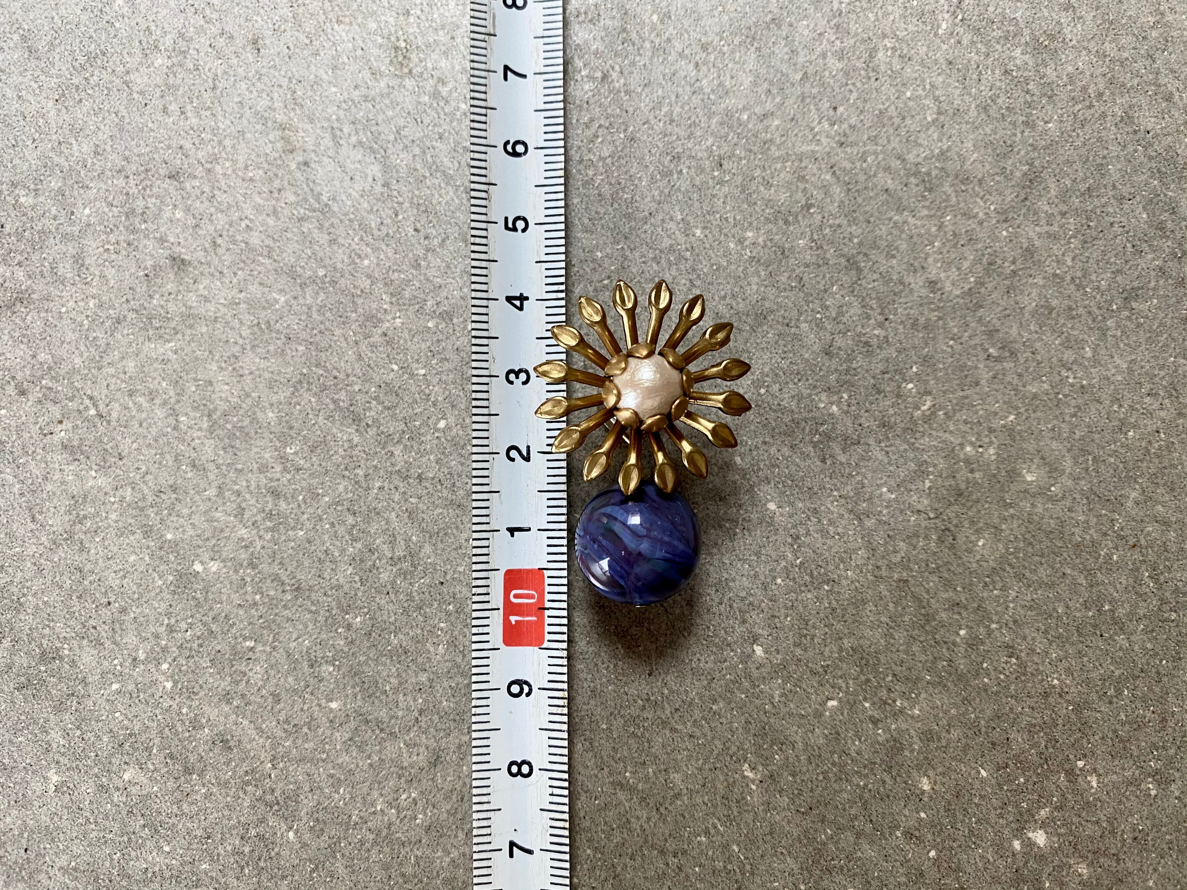 重ねた真鍮のお花の中央にはコットンパールを置き、美しいラベンダーブルーをした、ミリアムハスケルのヴィンテージビーズを添えました。
