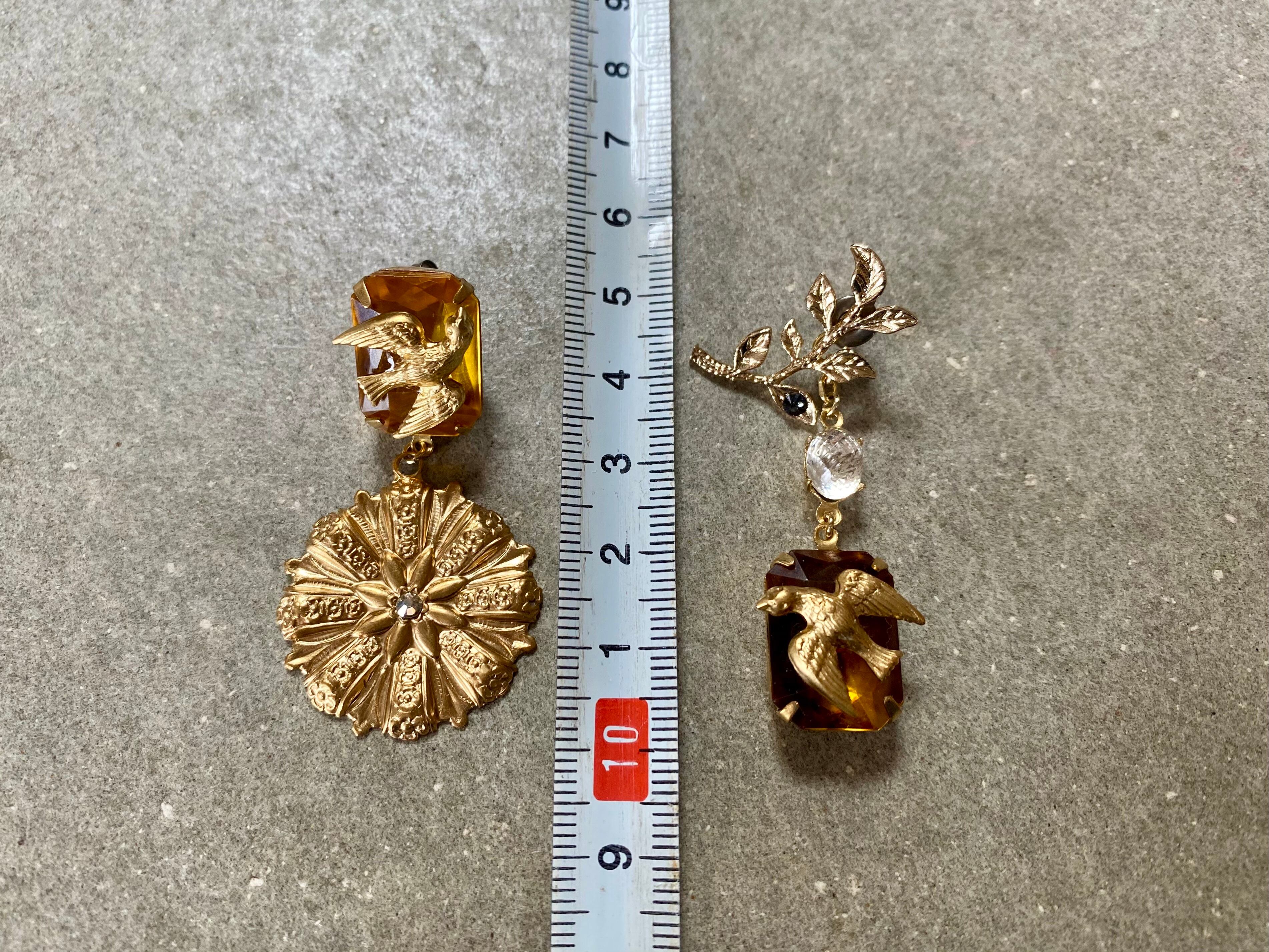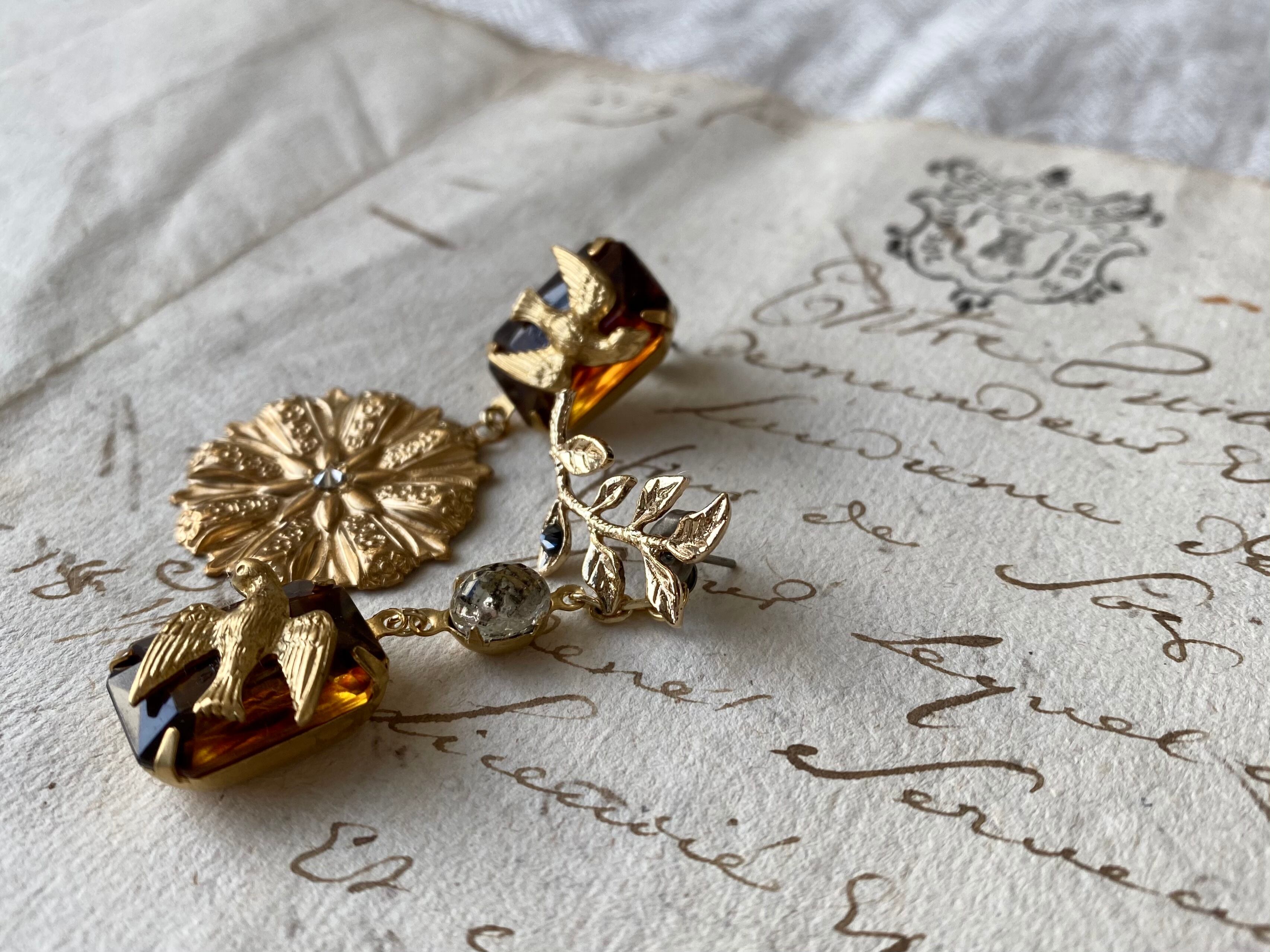 ヴィンテージパーツを組み合わせてアシンメトリーなピアスを作りました。