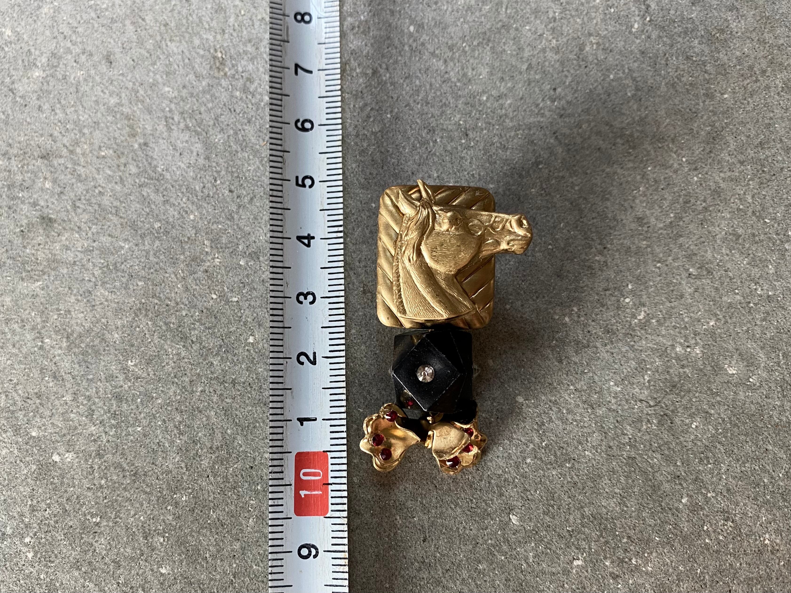幾何学模様の真鍮パーツに馬の真鍮パーツを置いて絵画の様に仕上げ、そこにスワロフスキーを散らしたヴィンテージビーズや真鍮パーツを添えました。