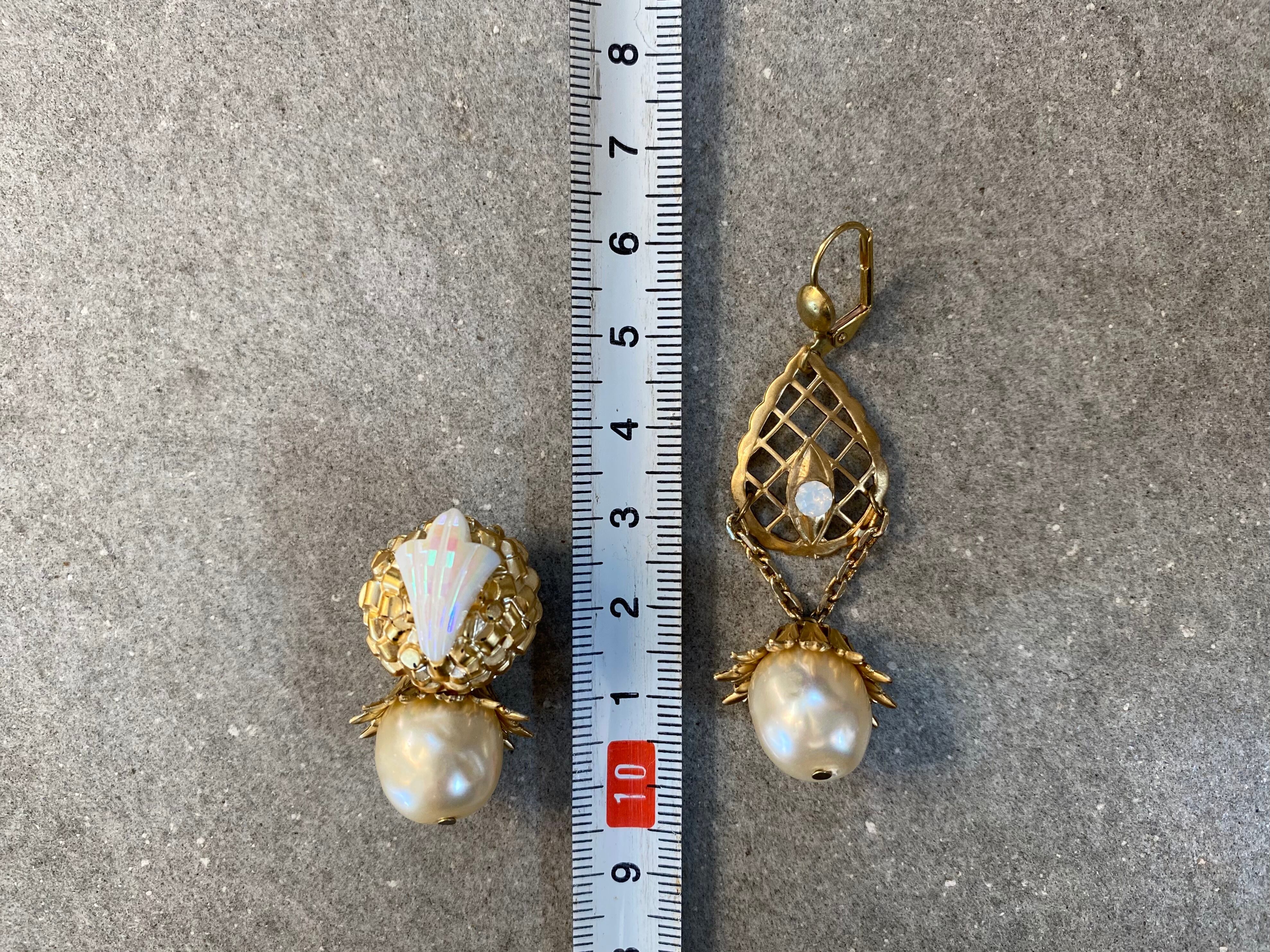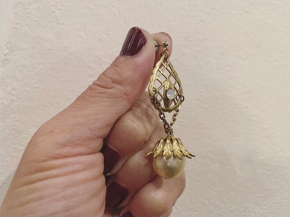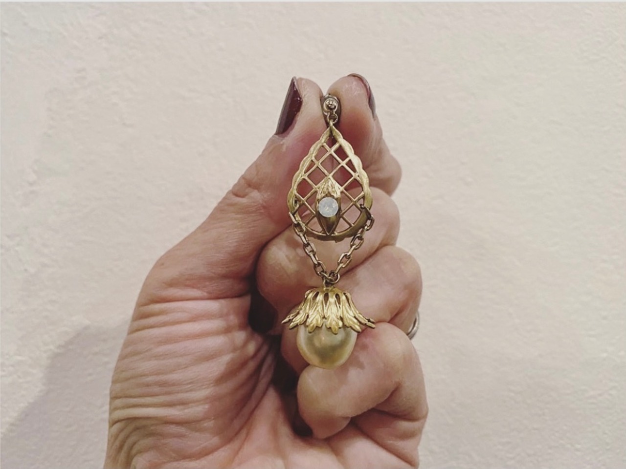 ヴィンテージパーツを組み合わせてアシンメトリーなピアスを作りました。