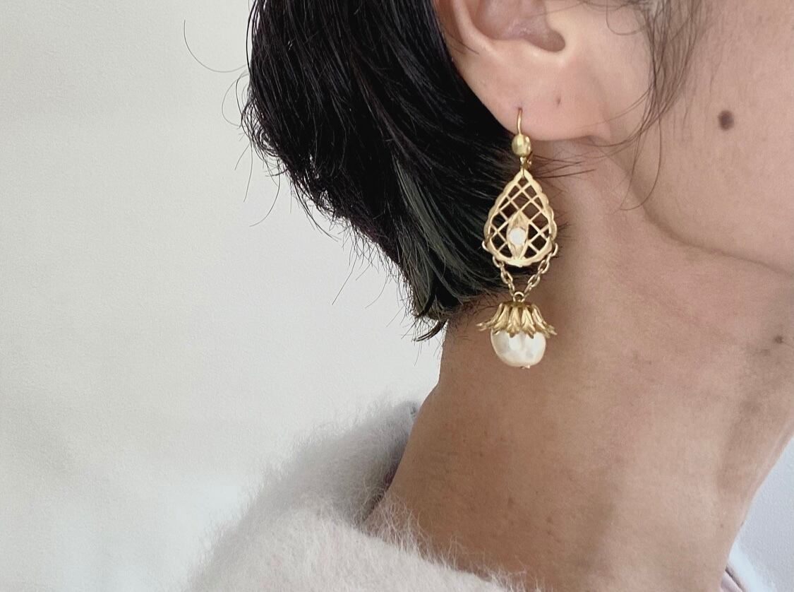 真鍮×パールの上品な雰囲気の中に、オーロラカラーのヴィンテージパーツやスワロフスキーを添えて、柔らかさもプラスしました。