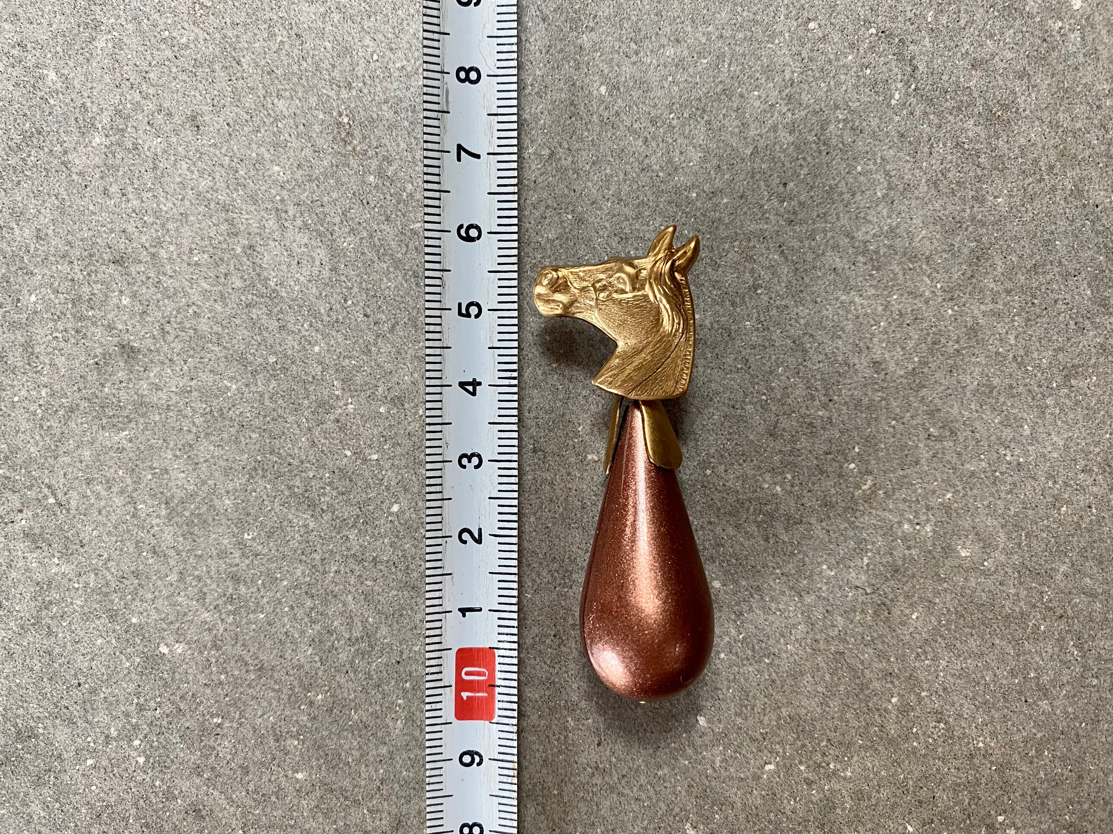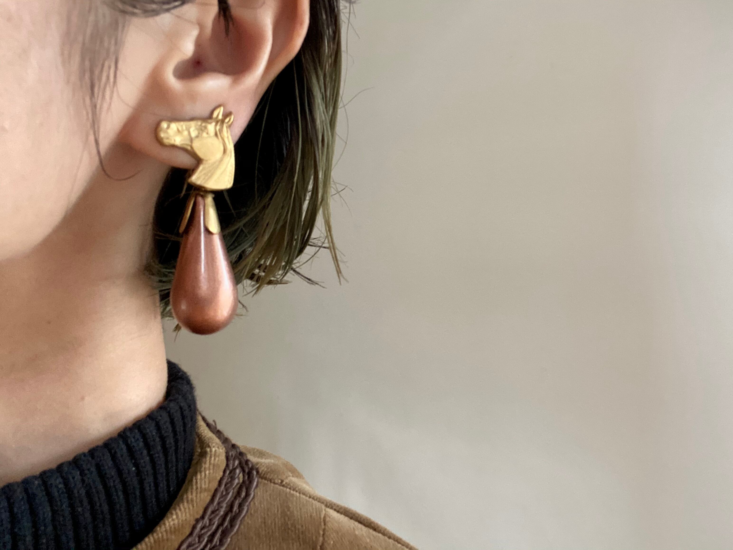 個性的な馬のパーツに負けない大きさの雫型のヴィンテージビーズを合わせて、存在感抜群の一品です。