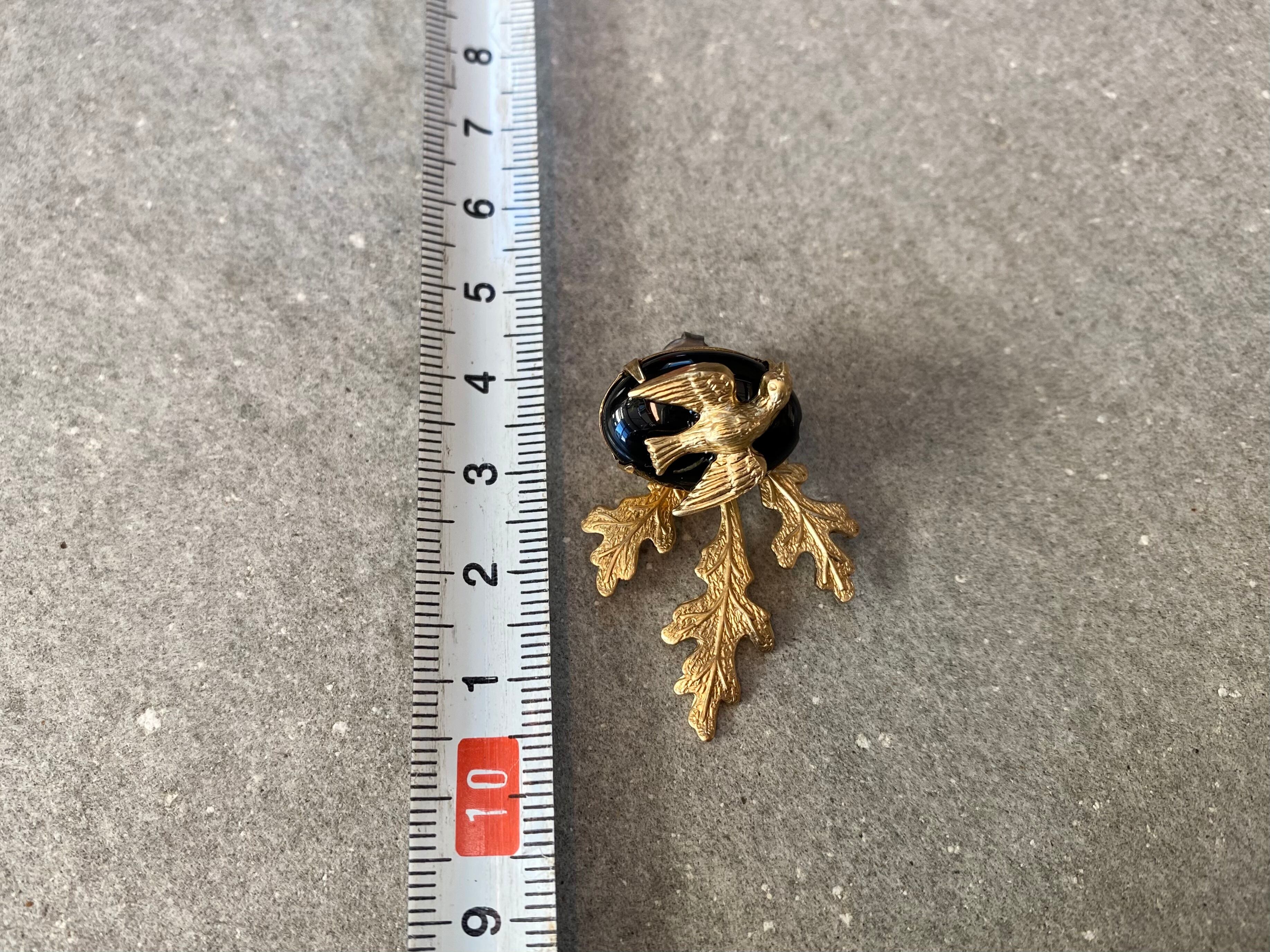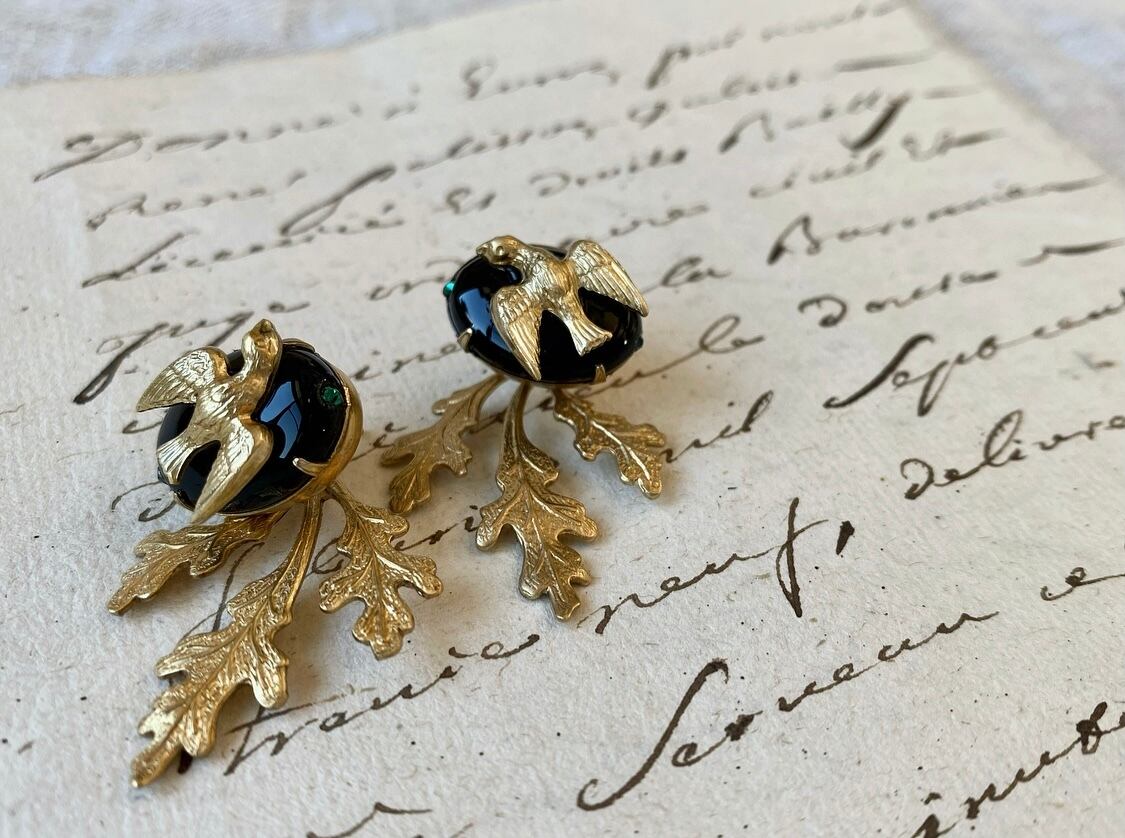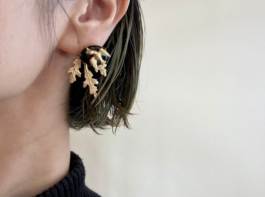 クラシカルな雰囲気たっぷりの真鍮葉っぱモチーフに合わせて、カボションのオニキスにもミリアムハスケルのドーブを添えて、統一感を持たせました。