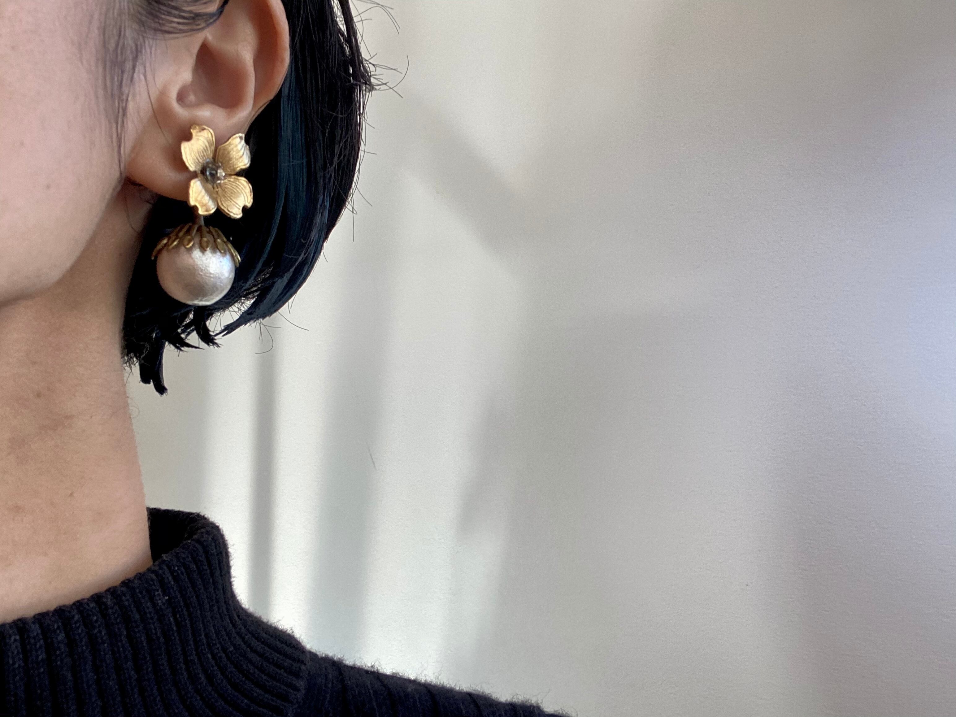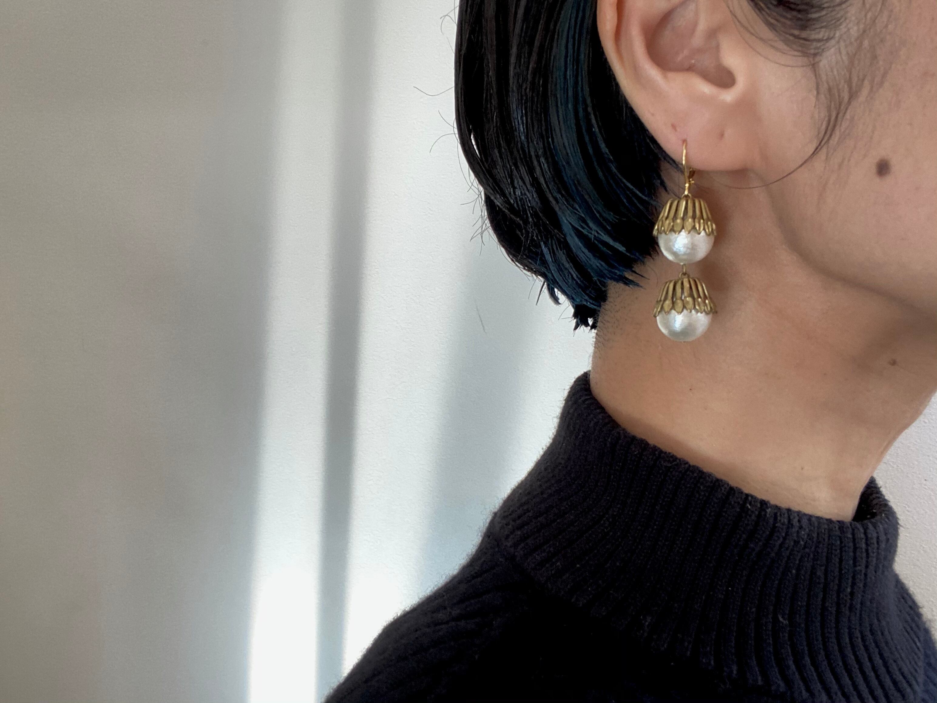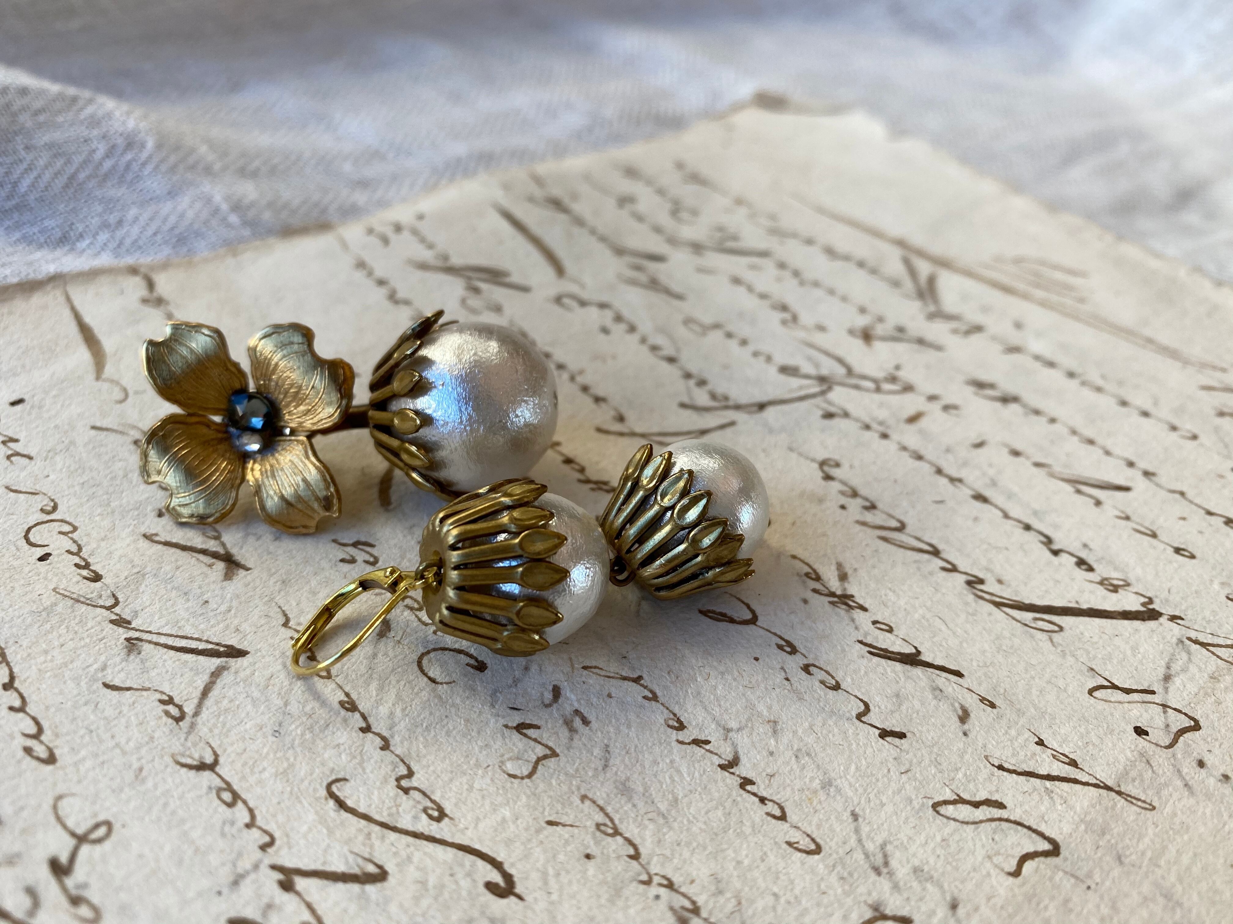 ミリアムハスケルの真鍮パーツに、コットンパールやスワロフスキーなどが脇を固め、すこぶる上品で優美な仕上がりです。