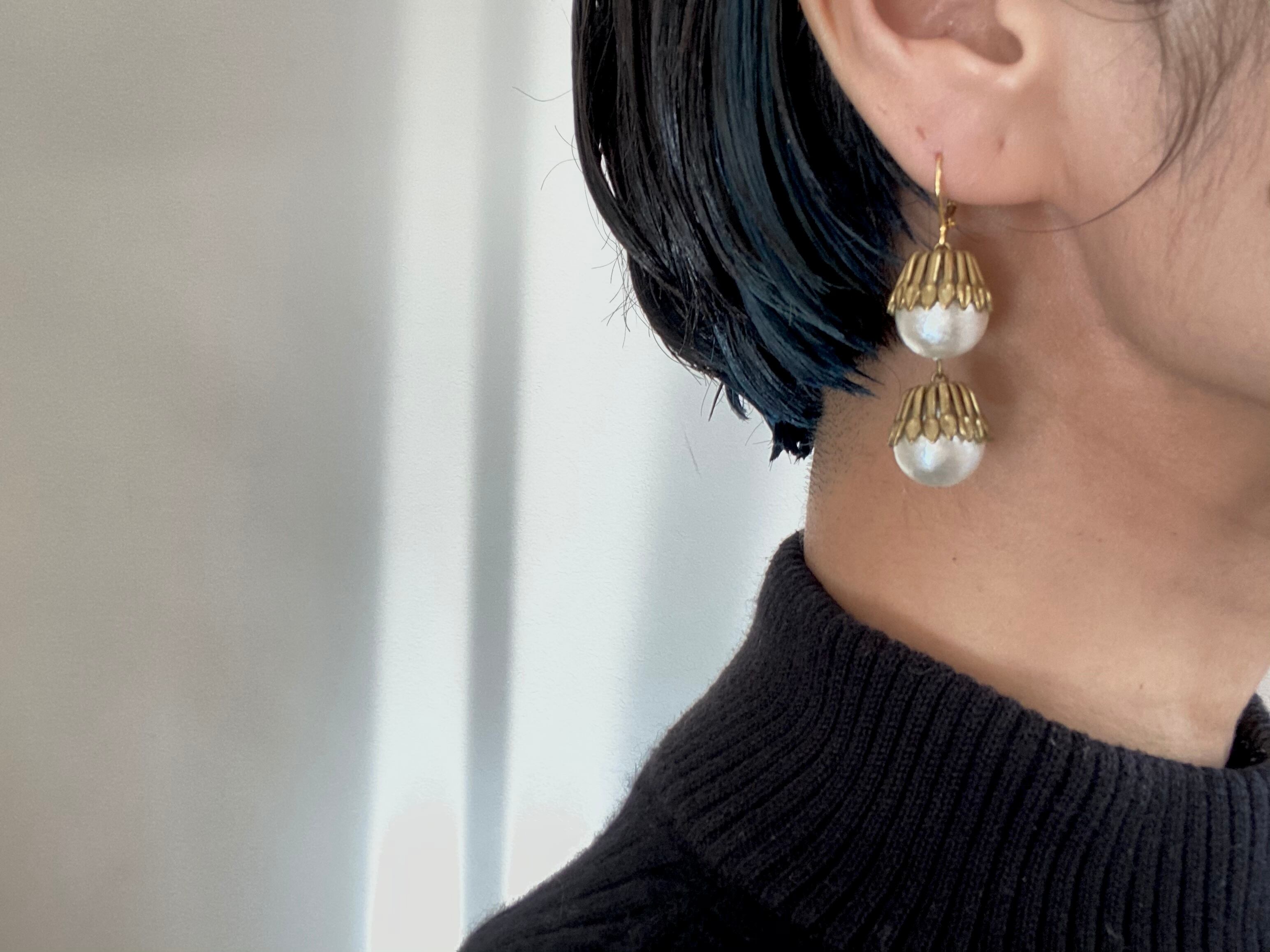 ヴィンテージパーツを組み合わせて、アシンメトリーなピアスを作りました。