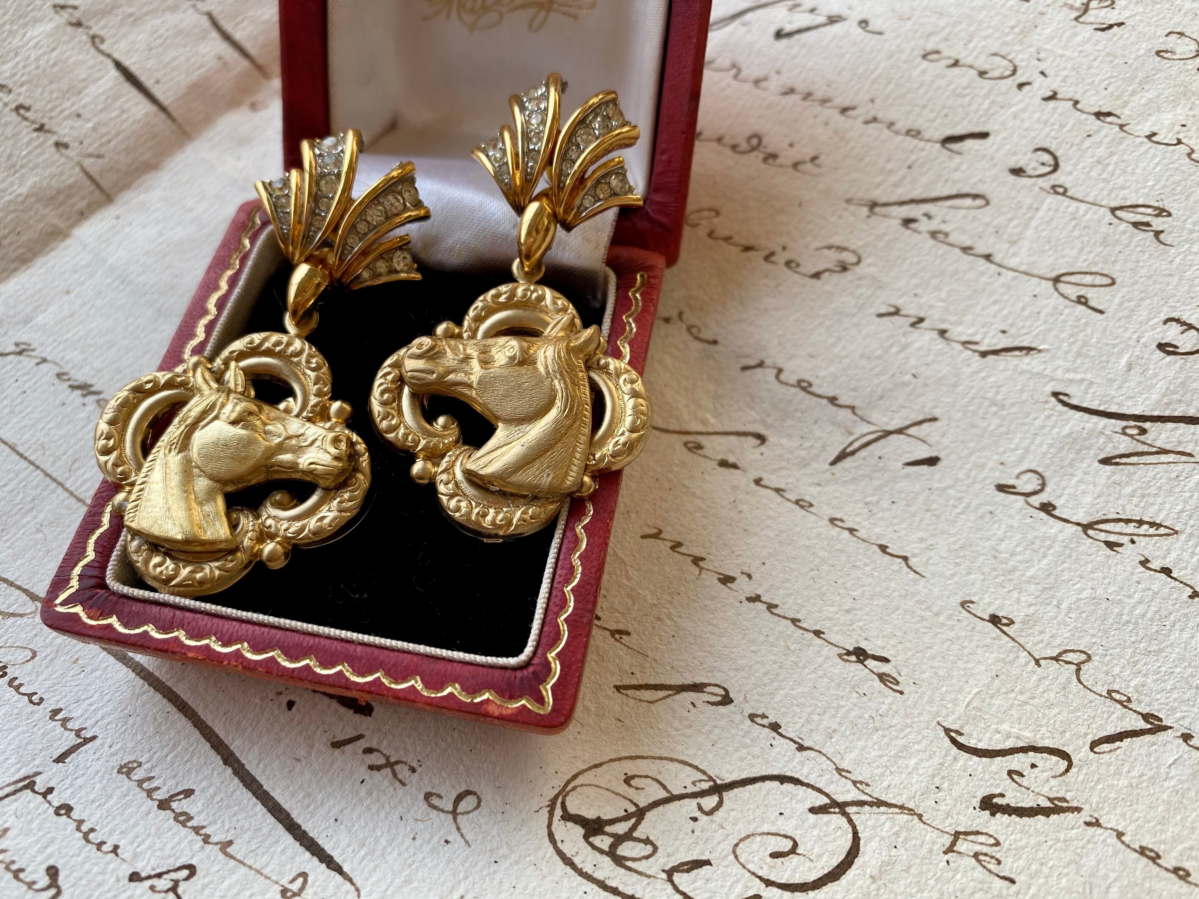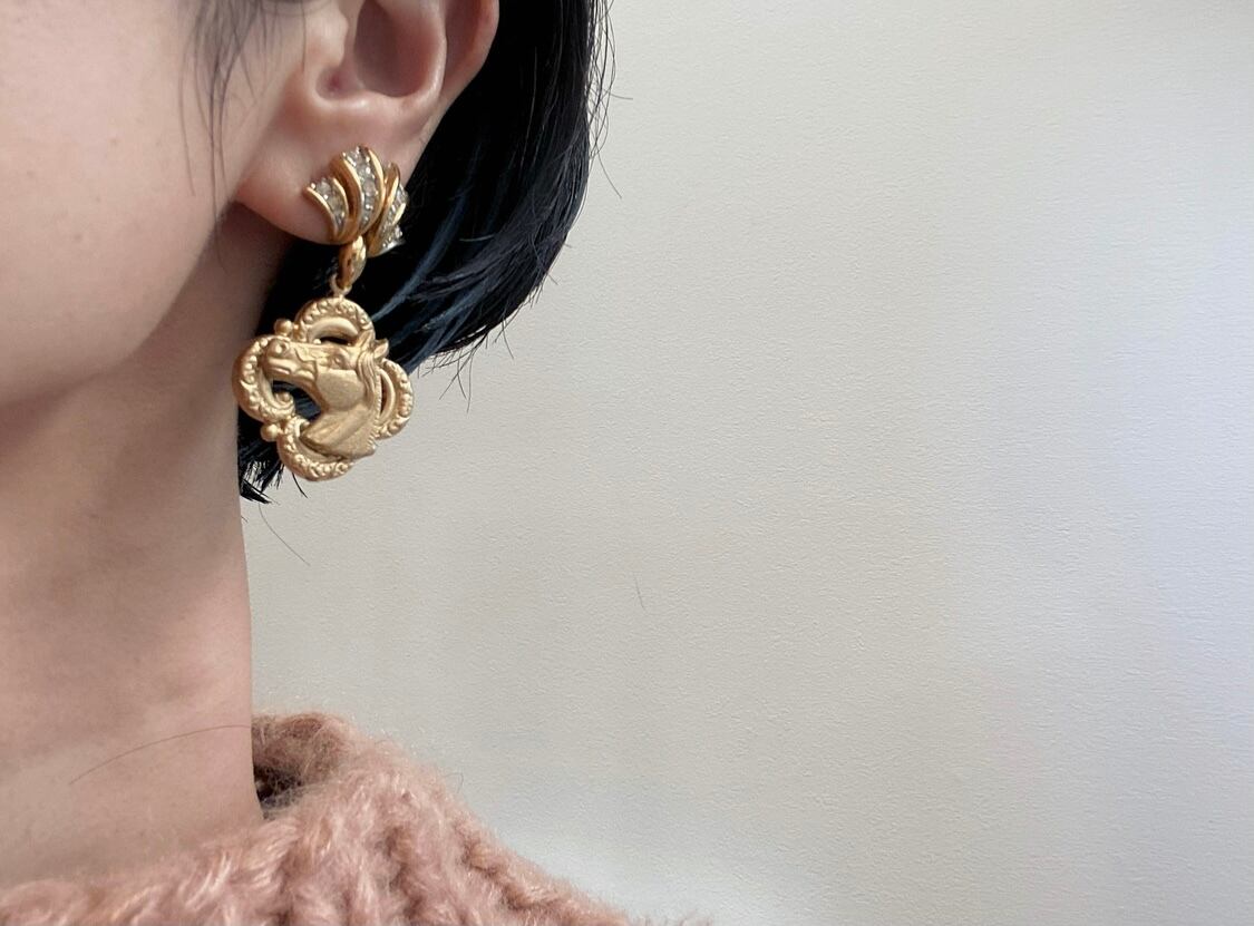 ラインストーンの埋め込まれた優美なヴィンテージカボションと、ボタニカルフレームにおさまった馬とのコンビネーションがユニークです。