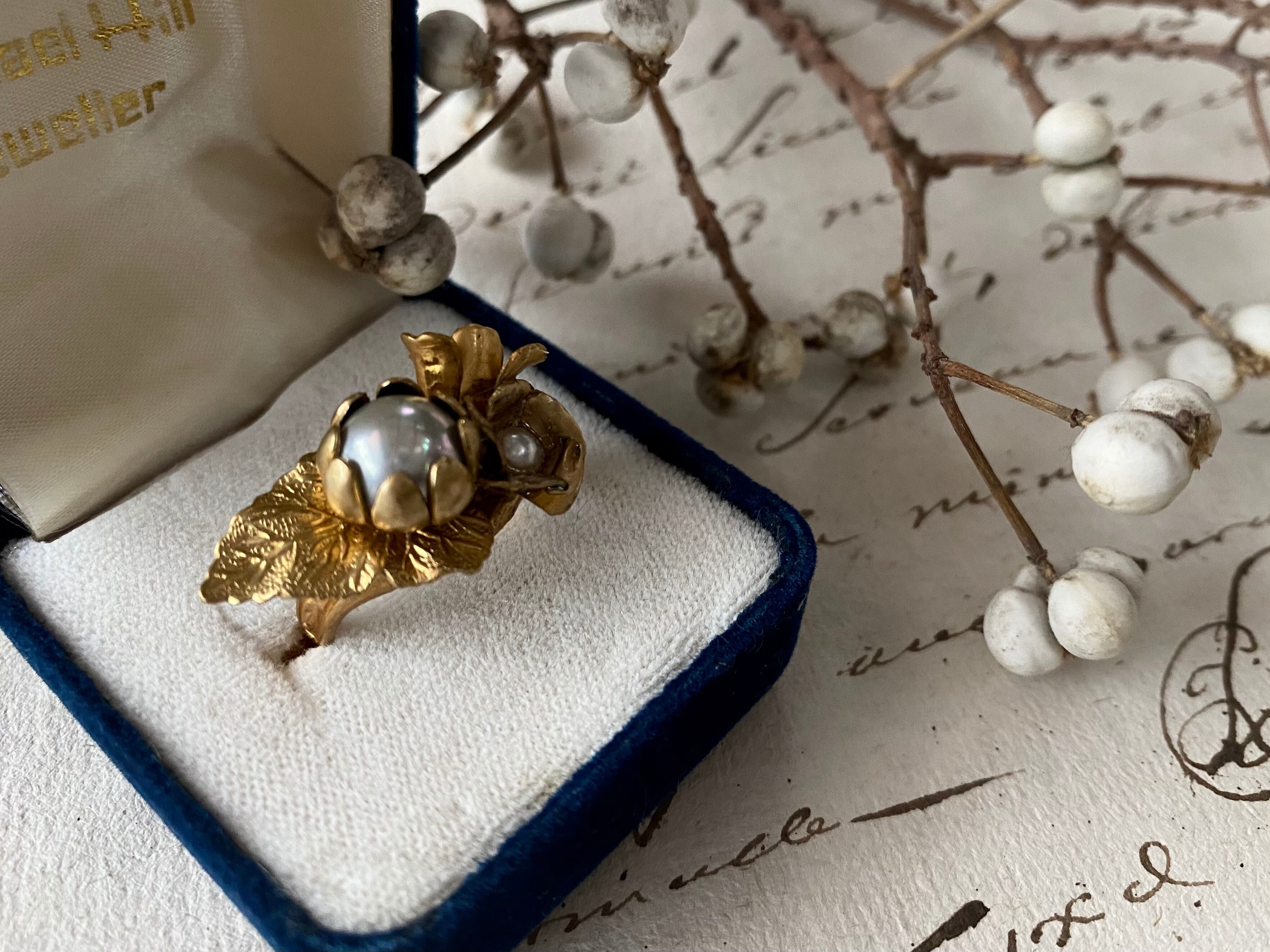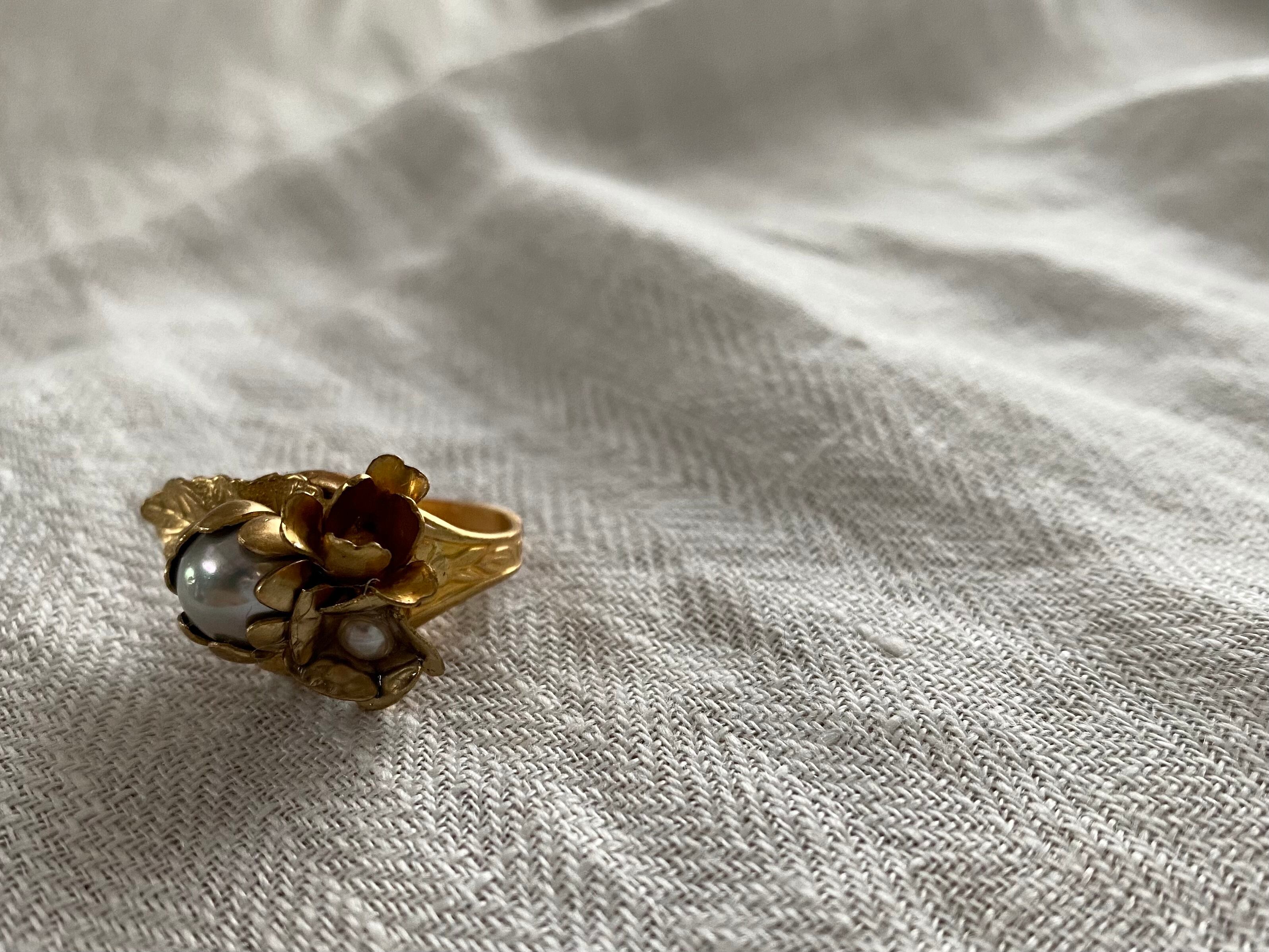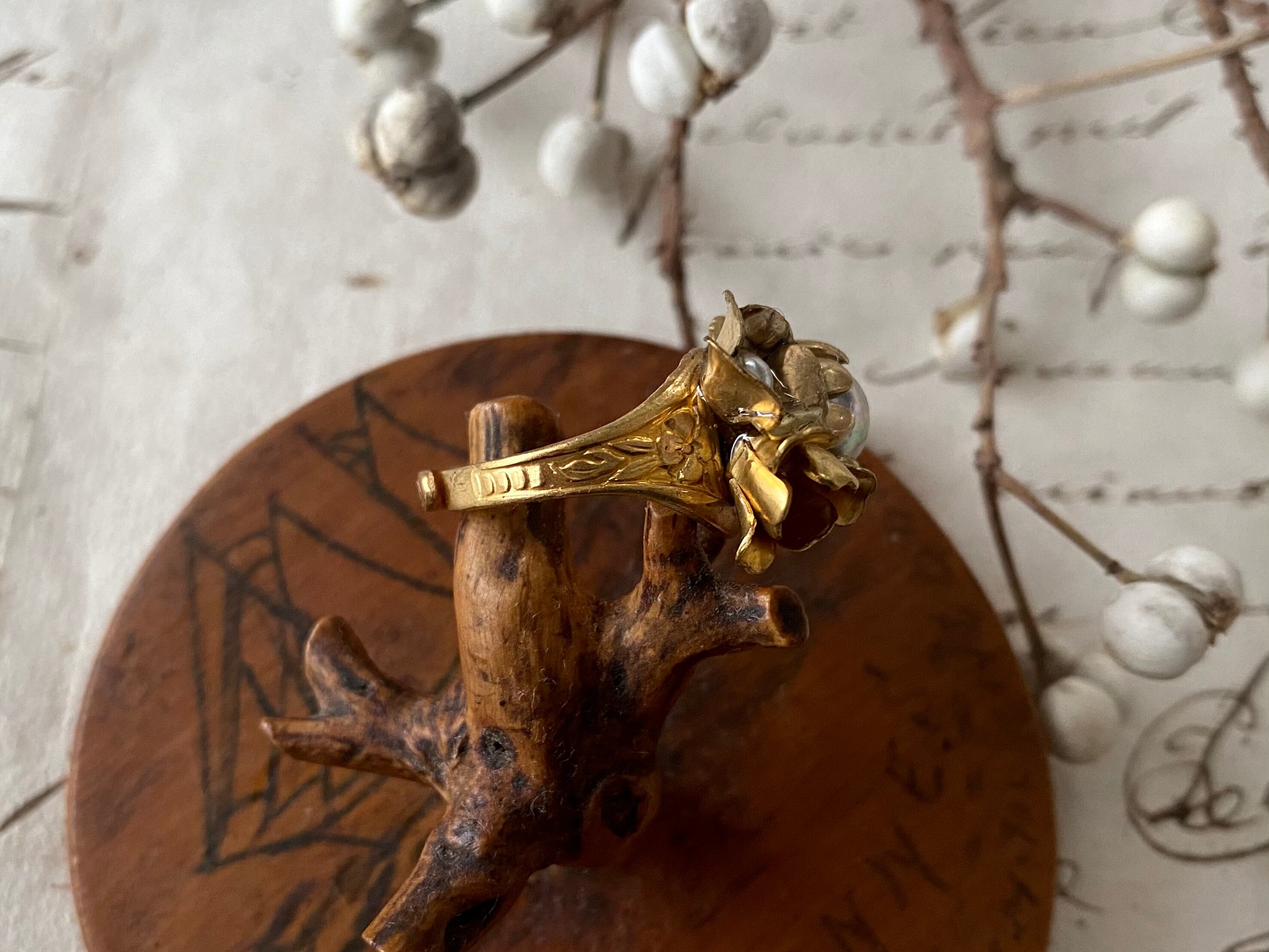 リーフフラワーモチーフの装飾がクラシックな印象の真鍮製リング台に、パールを包み込んだ2種類の真鍮フラワーと、巻きの美しい小さな真鍮フラワーを添えました。