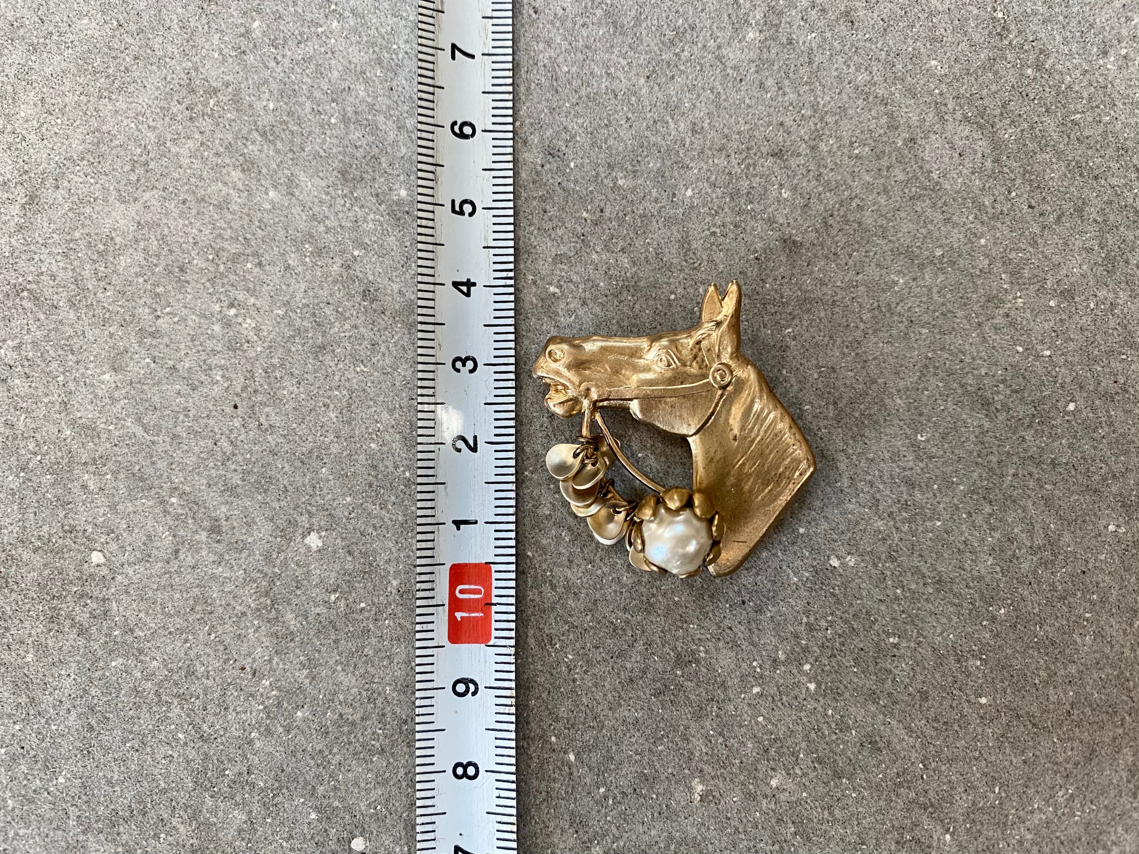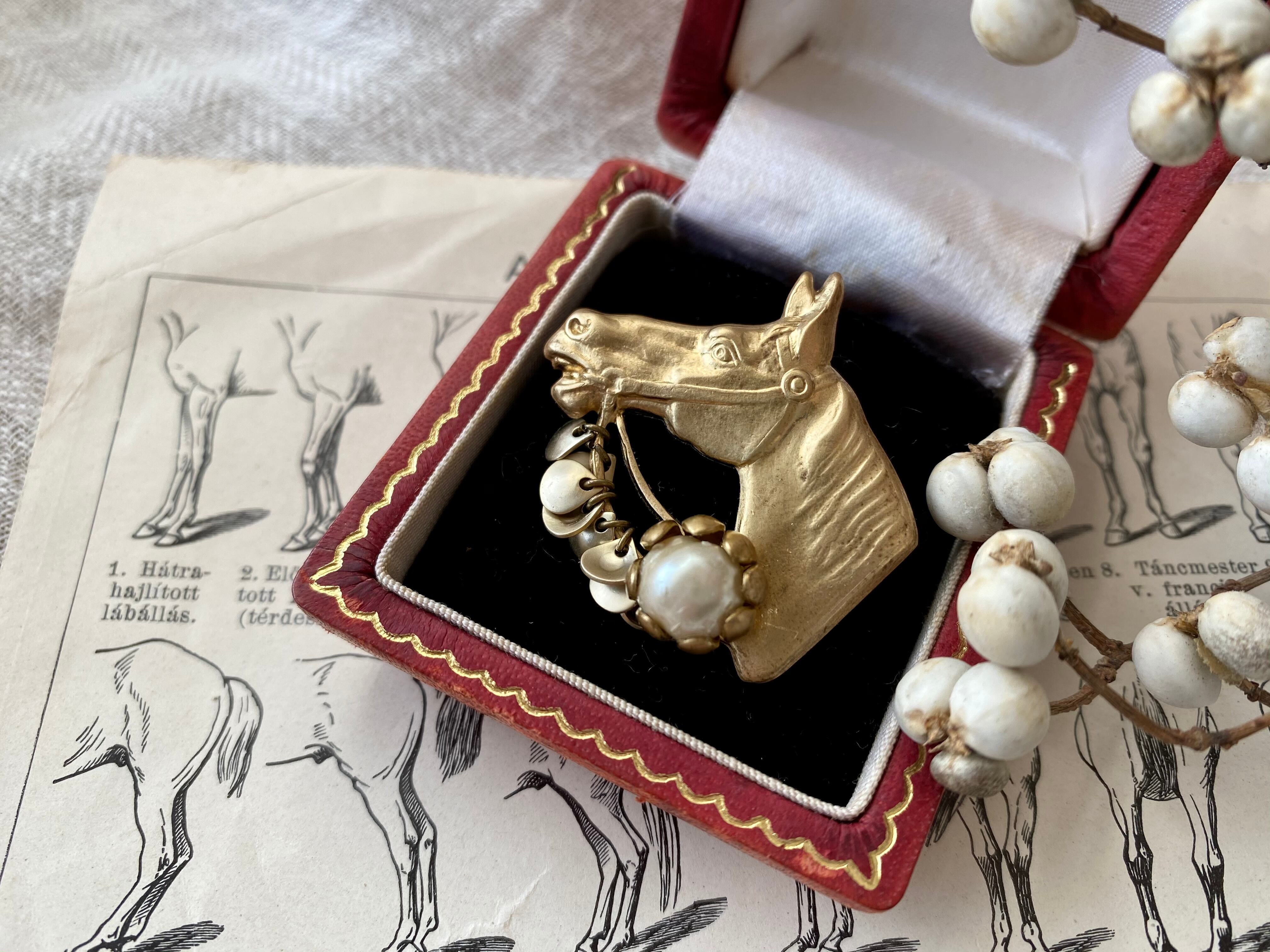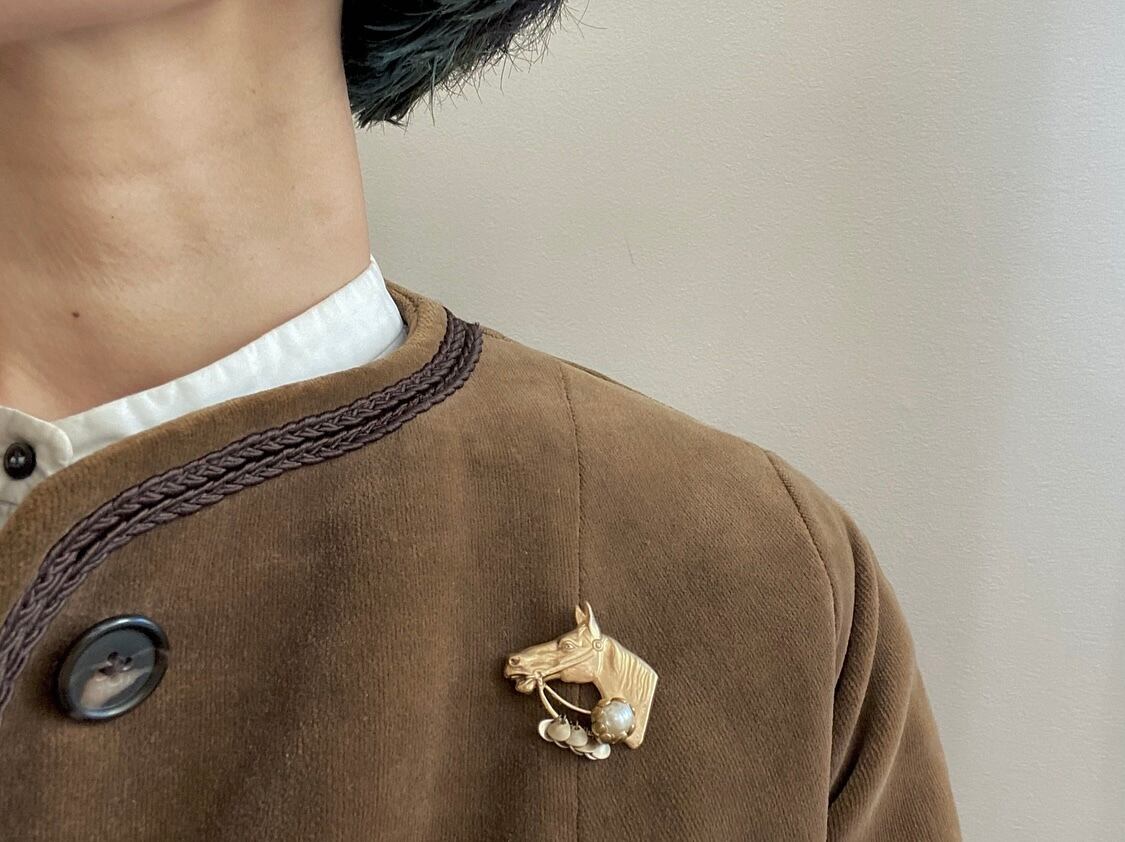 真鍮のホースヘッドに、パールを包み込んだお花や、小さな花弁のようなメタルパーツを添えて、上品な華やかさをプラスしました。