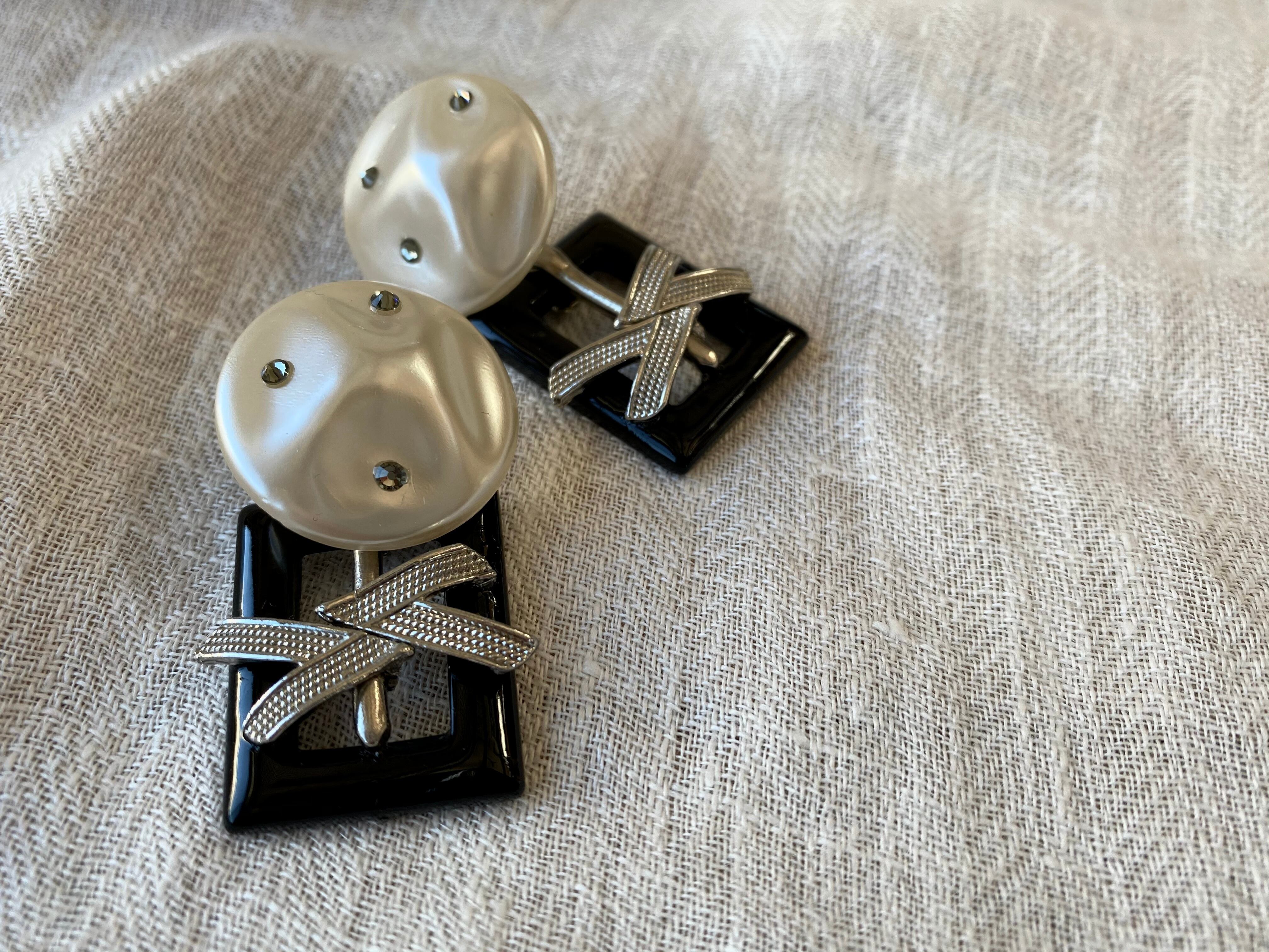 パール加工を施したヴィンテージボタンにはスワロフスキーを添え、ヴィンテージのベルトバックルにはシルバーの矢形パーツを取り付けました。