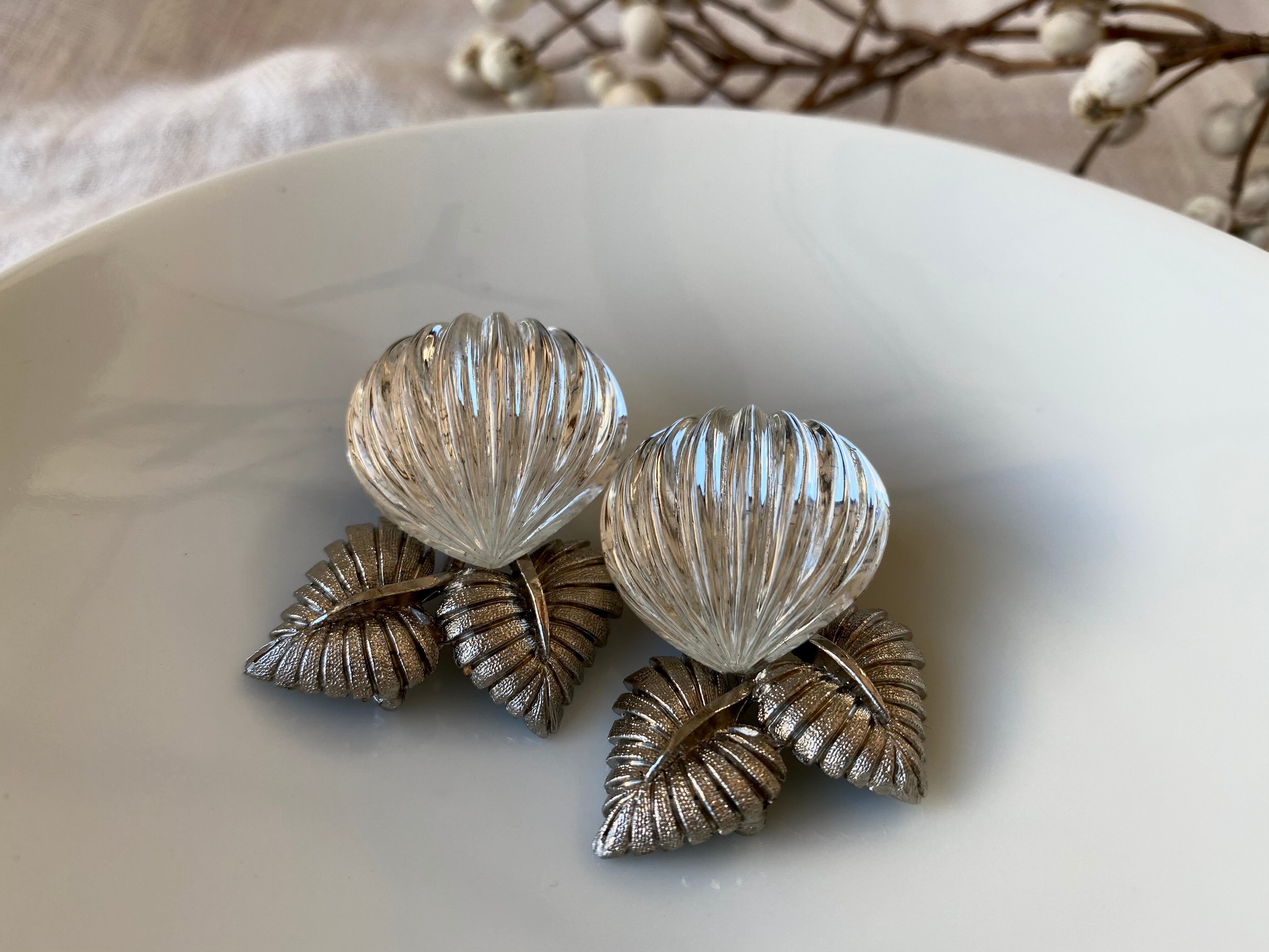 ぷっくりとした実のような形のガラスカボションに、渋いシルバーの葉っぱを添えて上品に仕上げました。