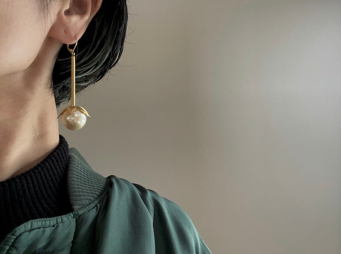 インパクトの強い大振りのフリルと、それに負けない存在感のパールを合わせて、アバンギャルドな雰囲気に仕上げました。