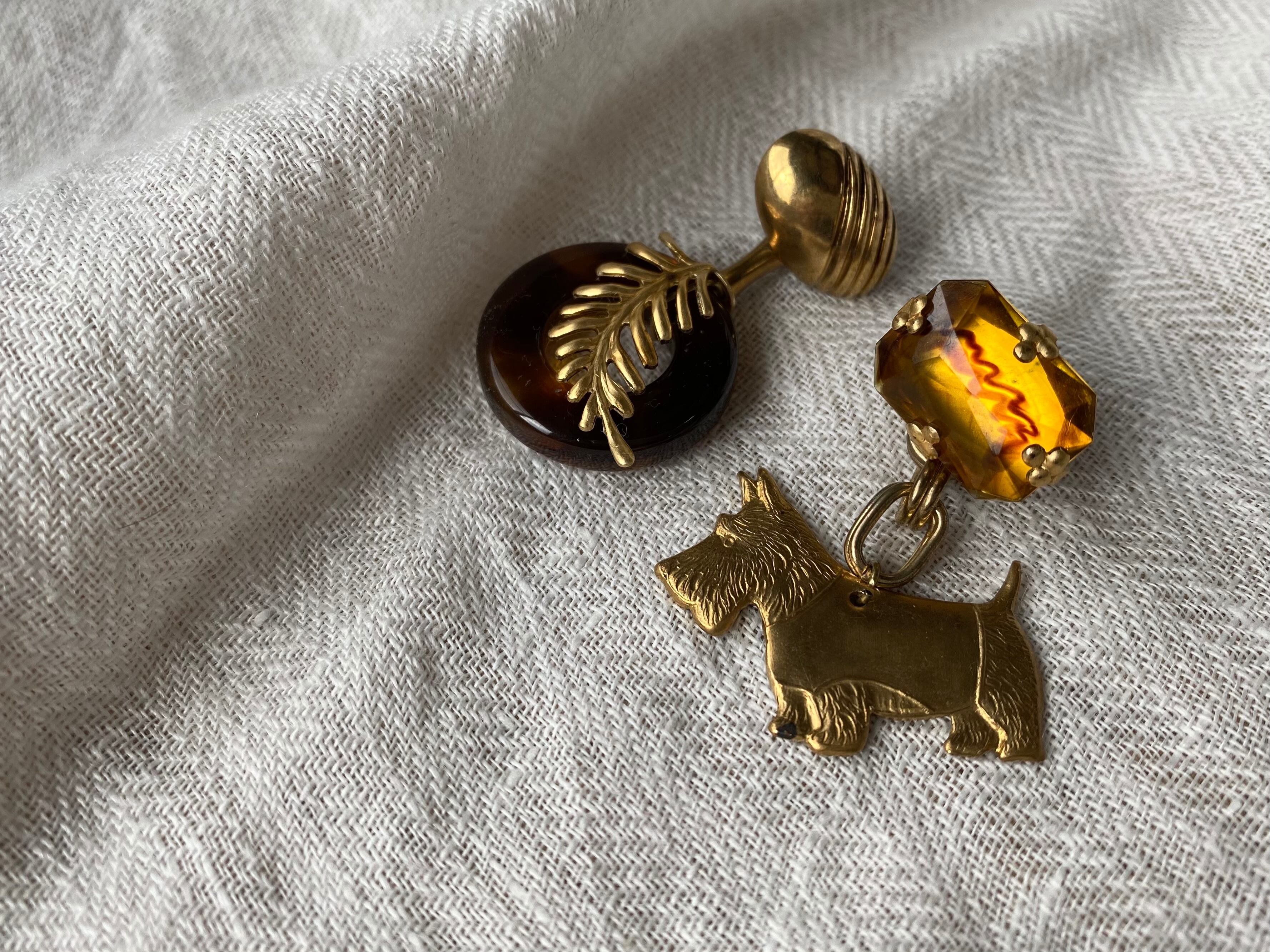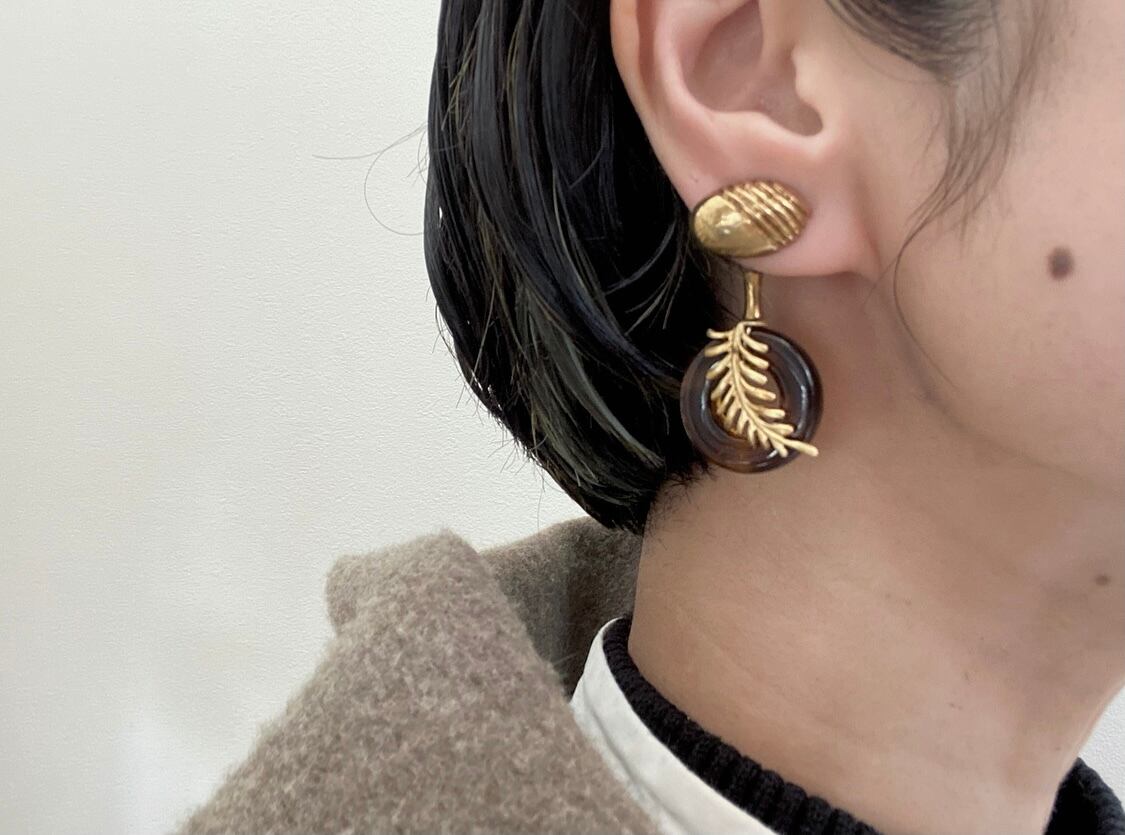 ヴィンテージパーツを組み合わせて、アシンメトリーなピアスを作りました。