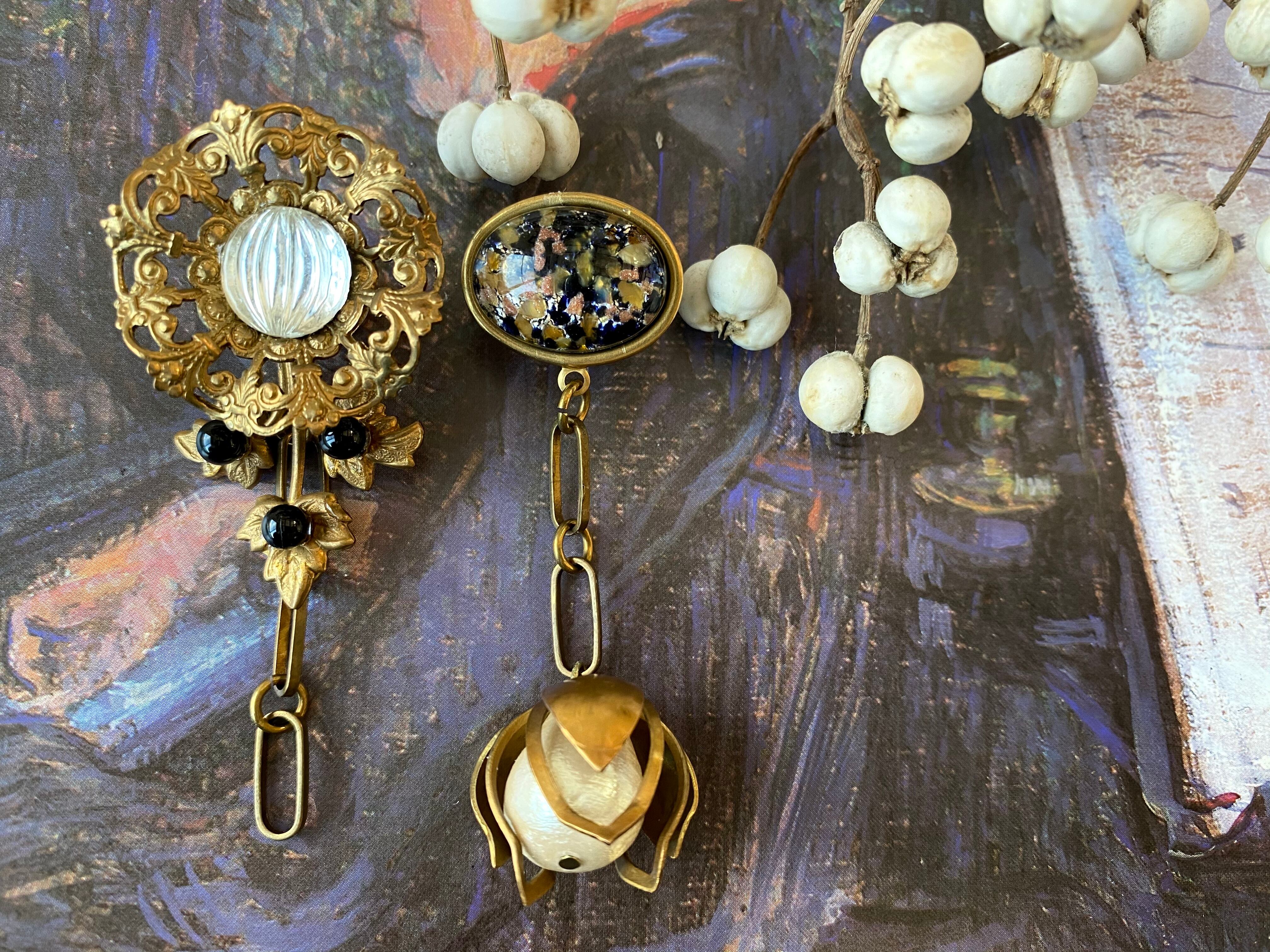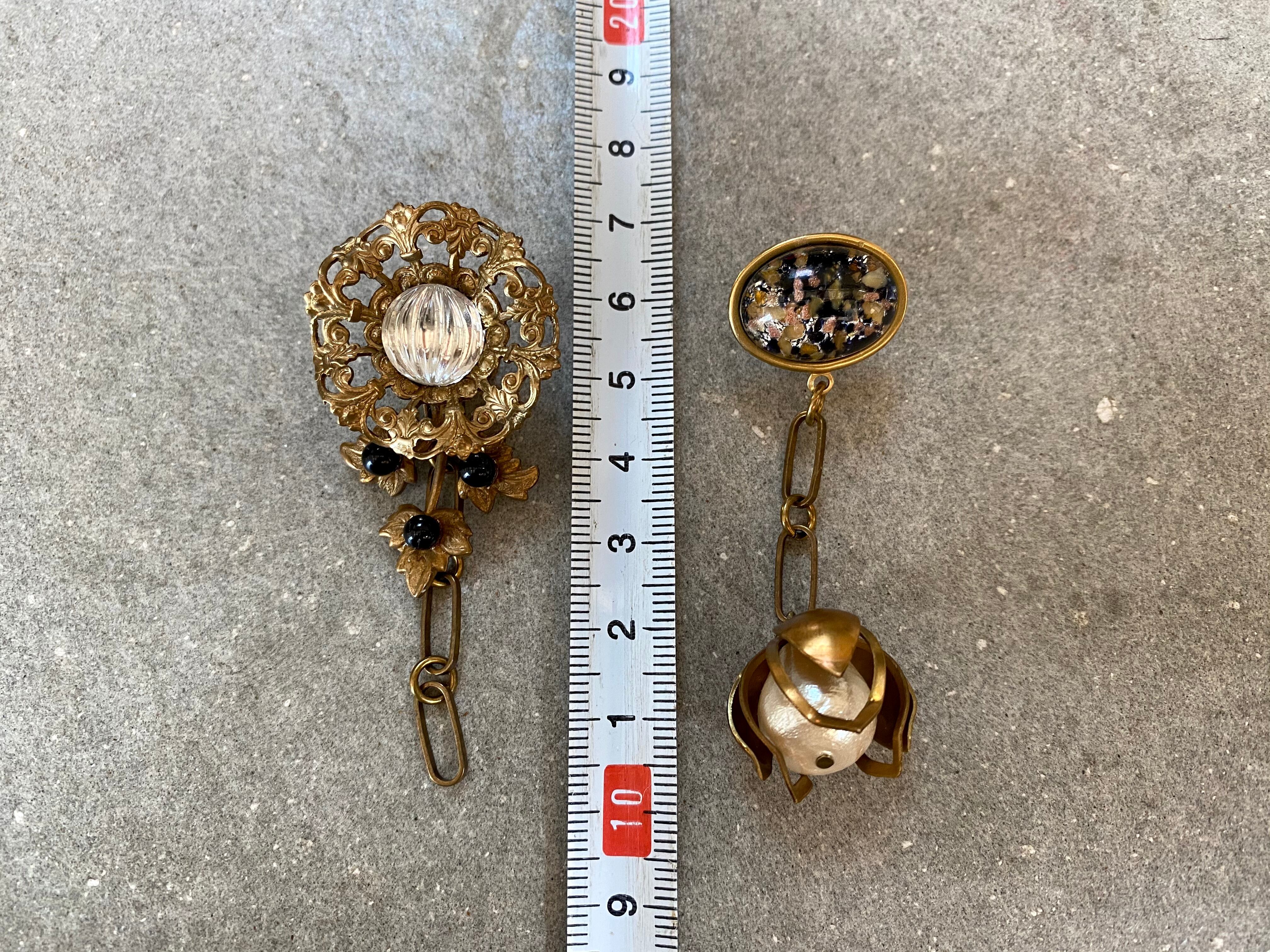 ヴィンテージパーツを組み合わせてアシンメトリーなピアスを作りました。