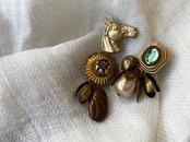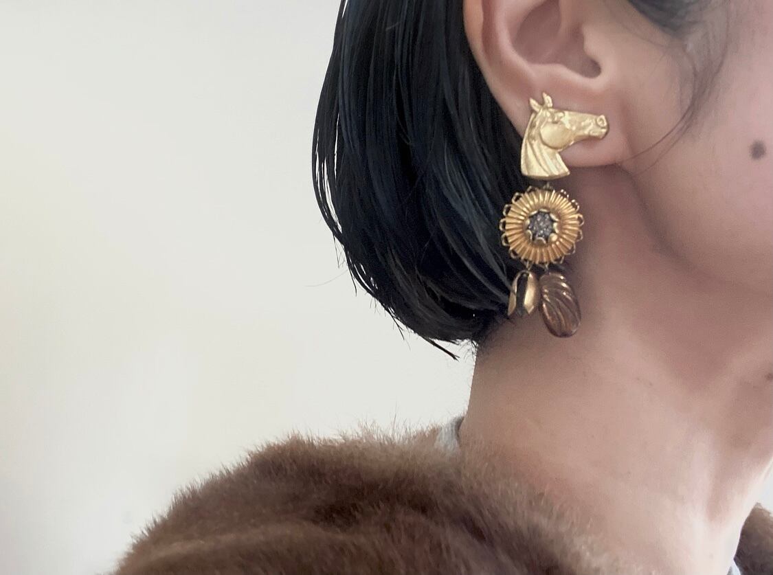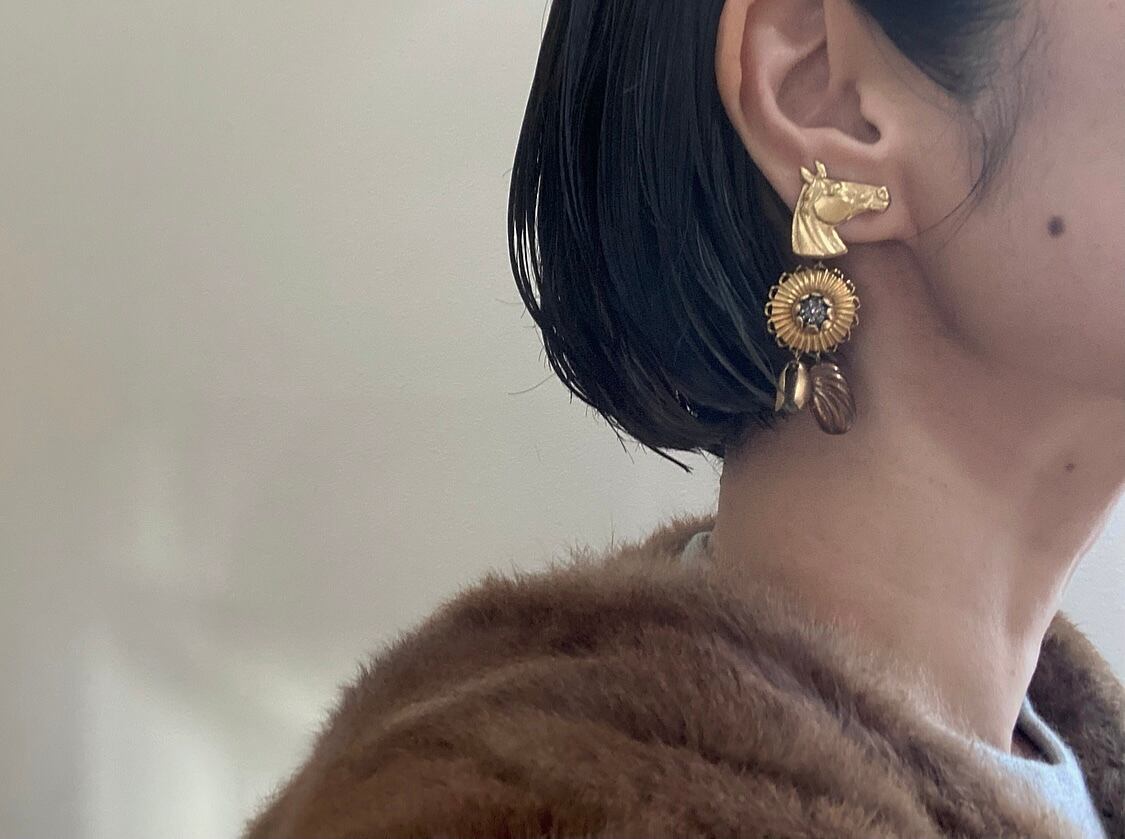 ヴィンテージパーツを組み合わせて、アシンメトリーなピアスを作りました。