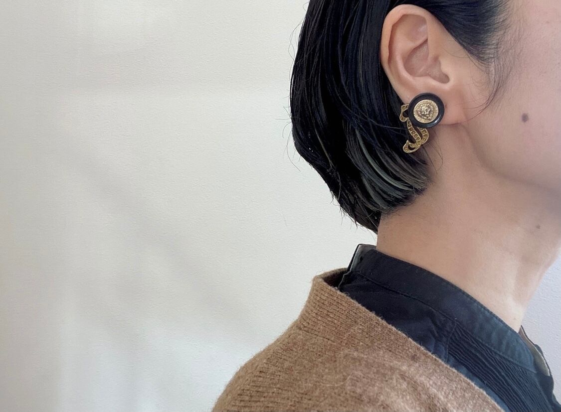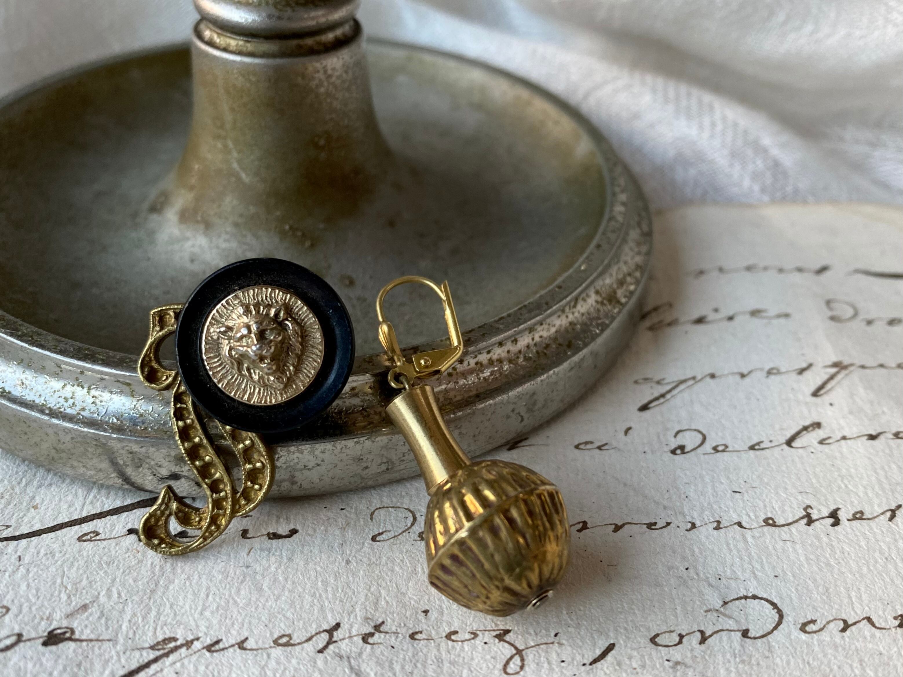 ライオンのヴィンテージボタンを主役に真鍮パーツを取り付けて、シンプルながら存在感のある仕上がりです。