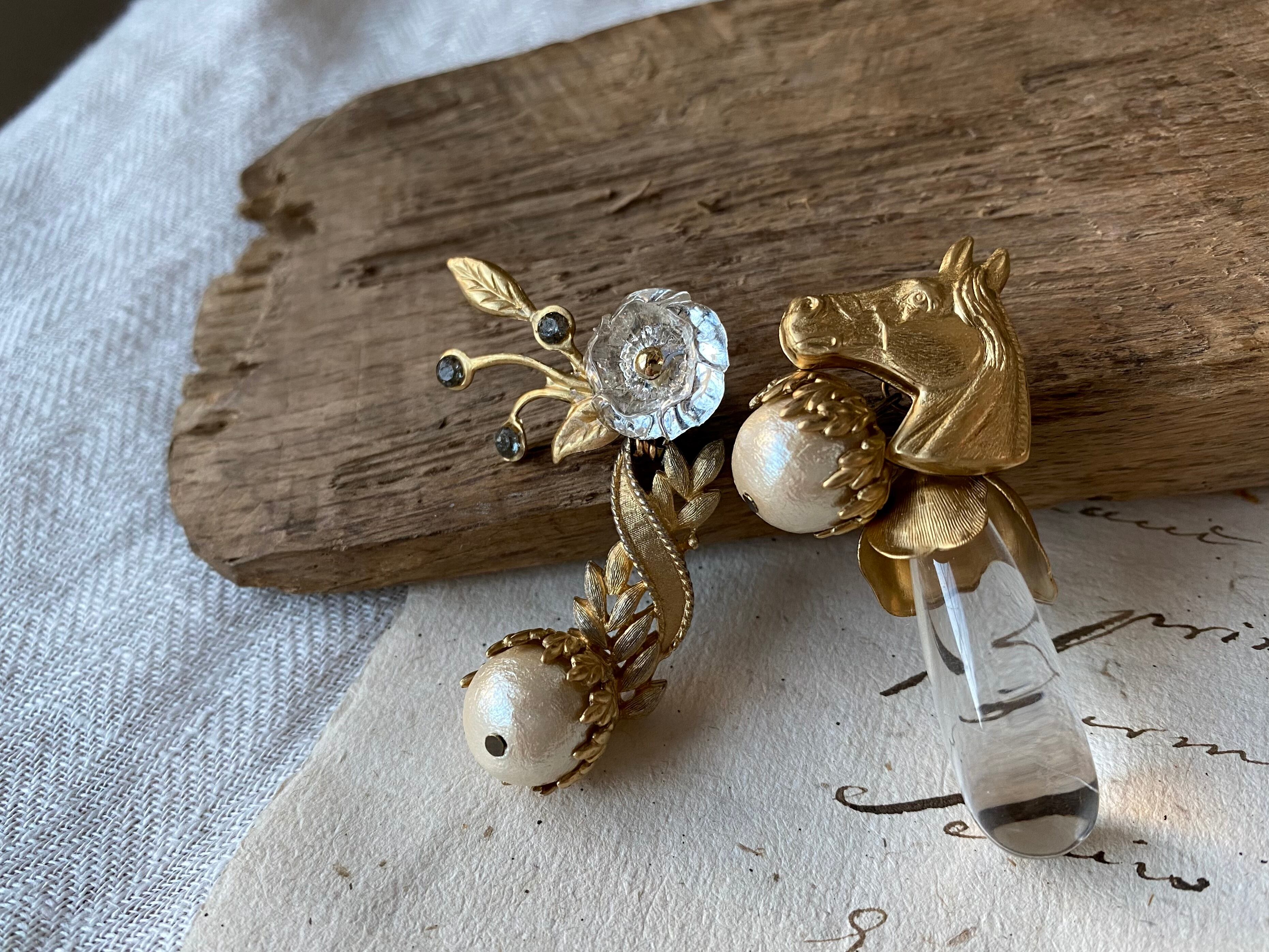 ヴィンテージパーツを組み合わせてアシンメトリーピアスを作りました。