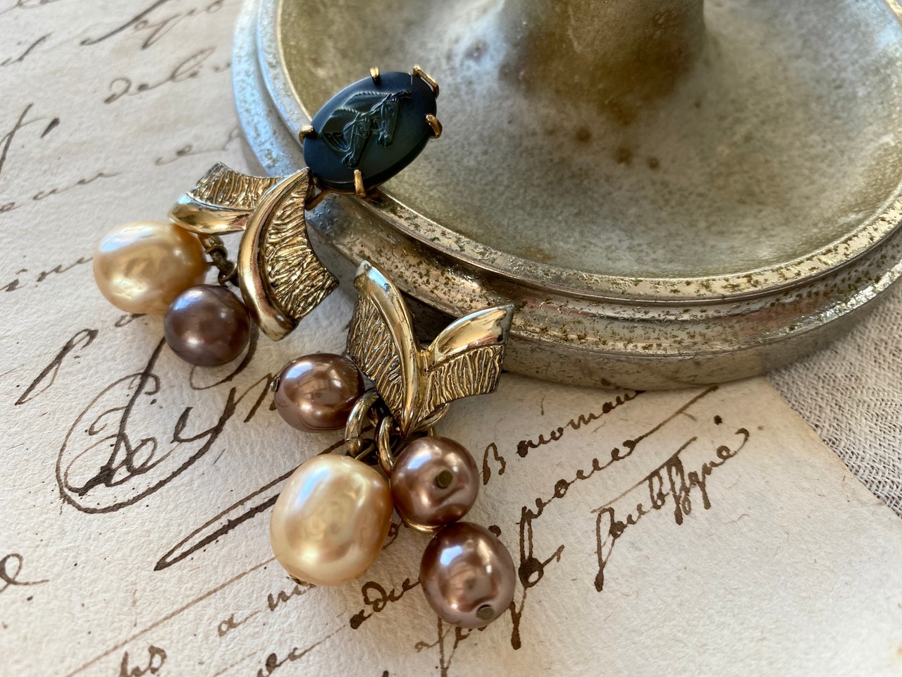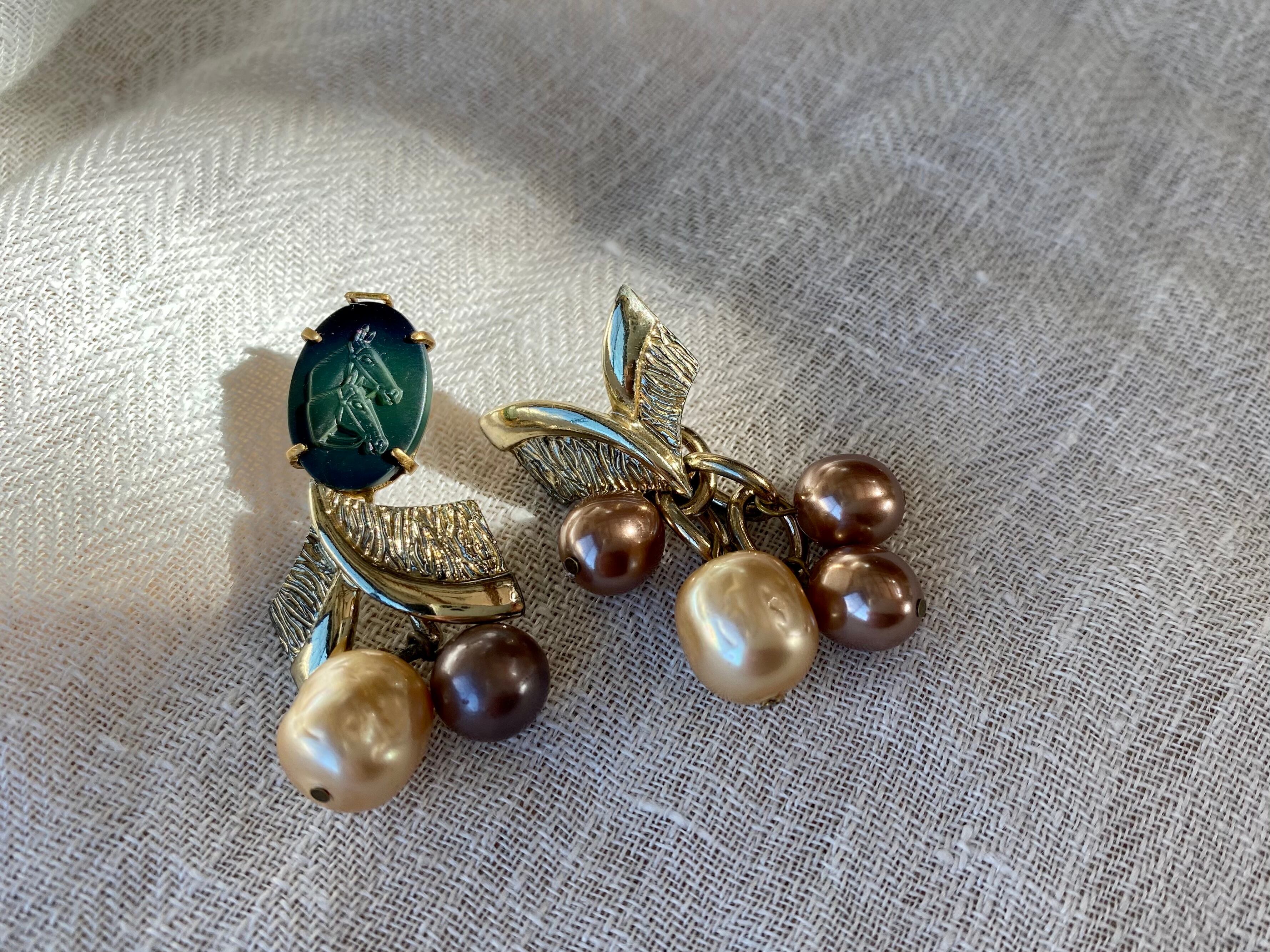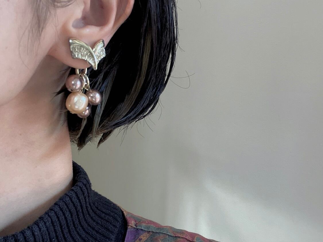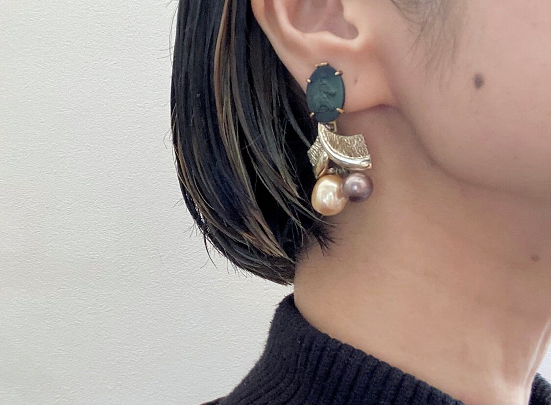 ディープグリーンのカボションやメタルがヴィンテージ感たっぷりですが、パールを添える事で上品な雰囲気に仕上がっています。