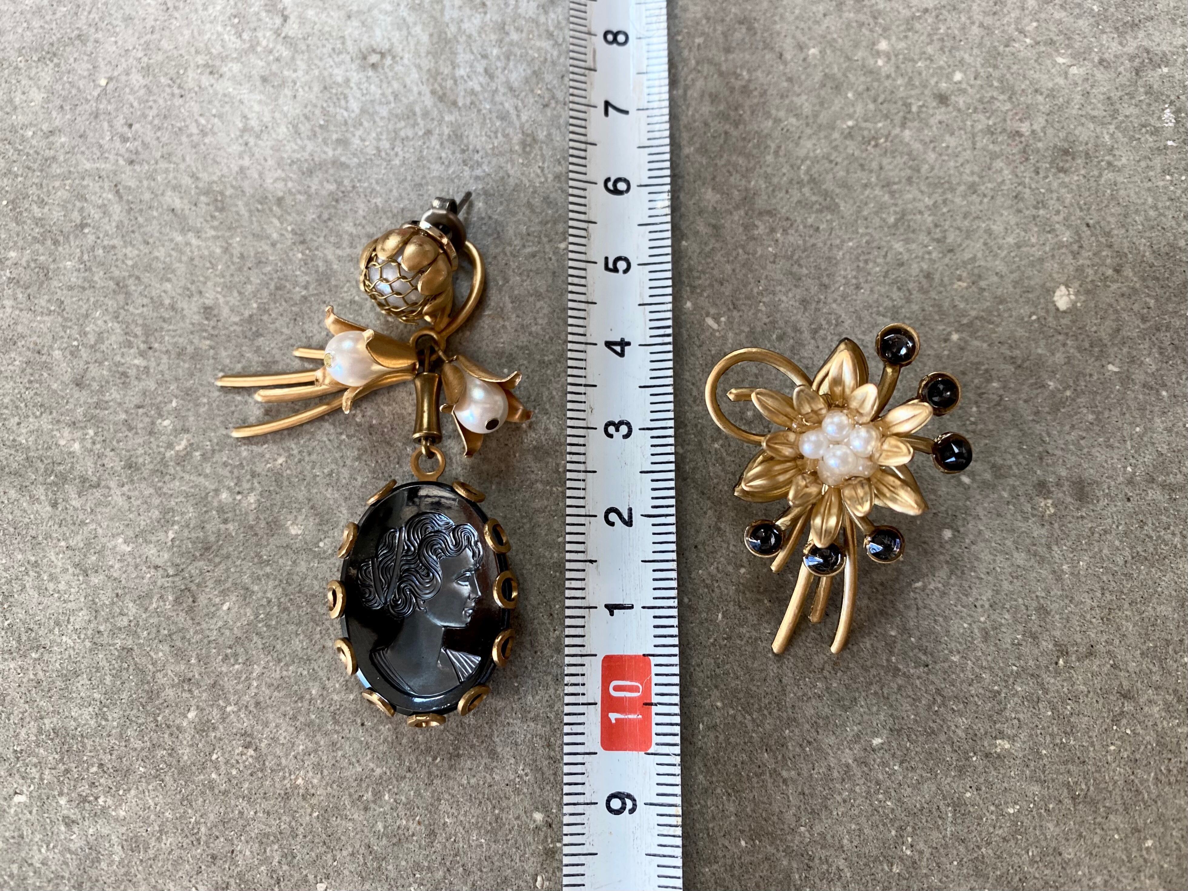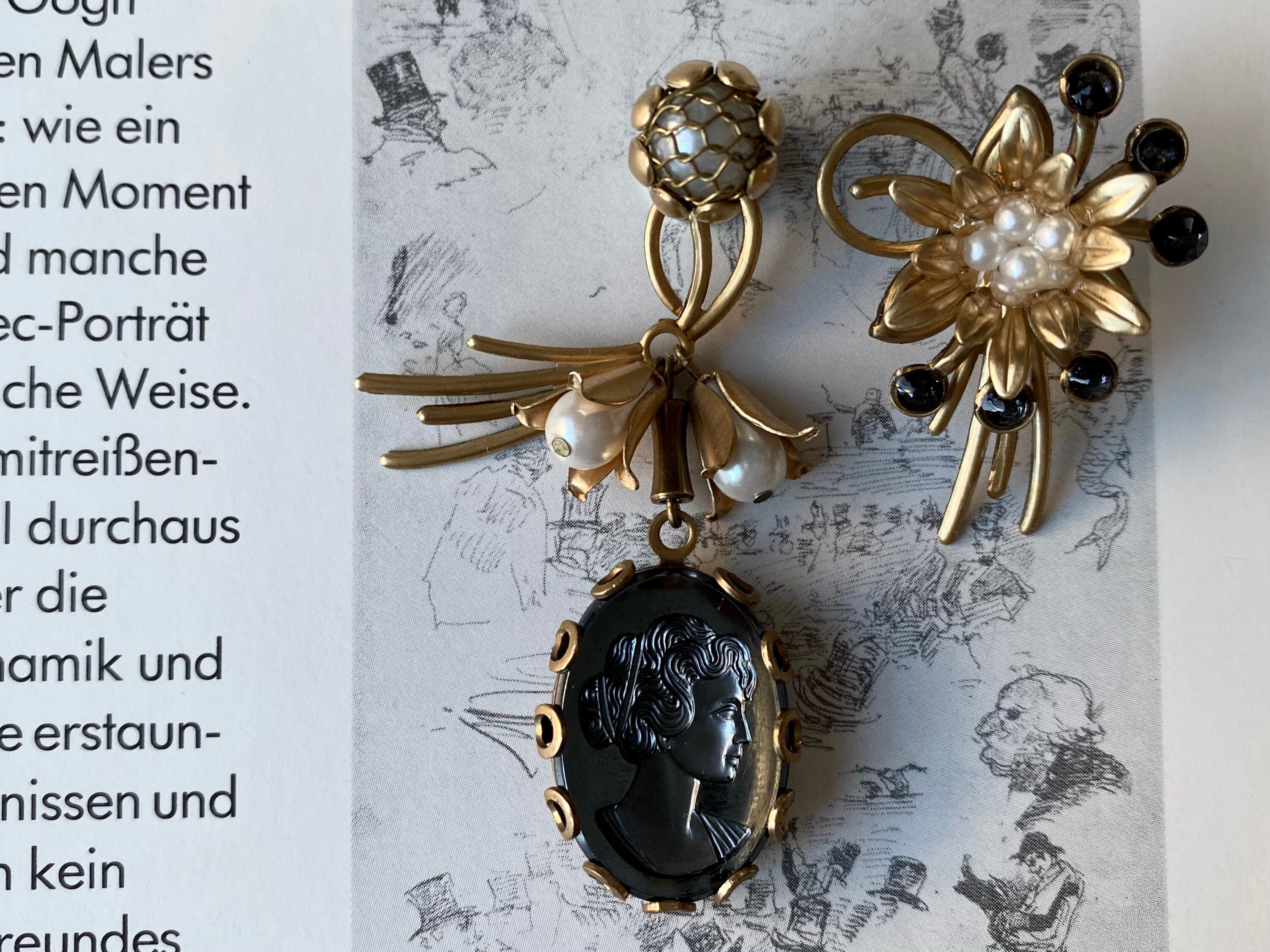 ガラスのカメオ、パールに真鍮のボタニカルパーツなど、クラシカルな雰囲気の素材でできていますが、チャコールグレーに光メタリックカラーがクールな印象です。