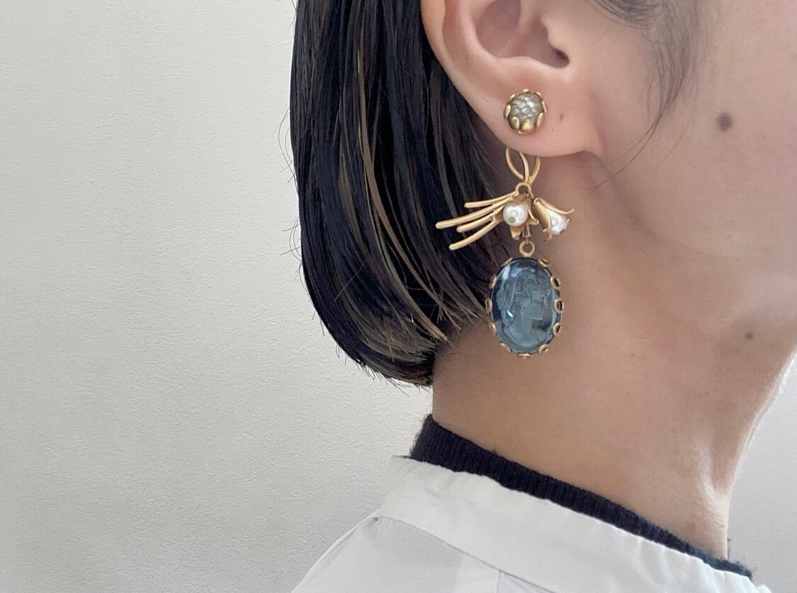 ヴィンテージパーツを組み合わせてアシンメトリーなピアスを作りました。