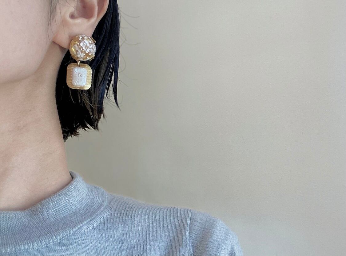 カットワークで光を集めたように輝くクリアビーズや、潔い白色のヴィンテージパーツがスッキリと爽やかな雰囲気で、新たな気持ちで1日が始められそうです。
