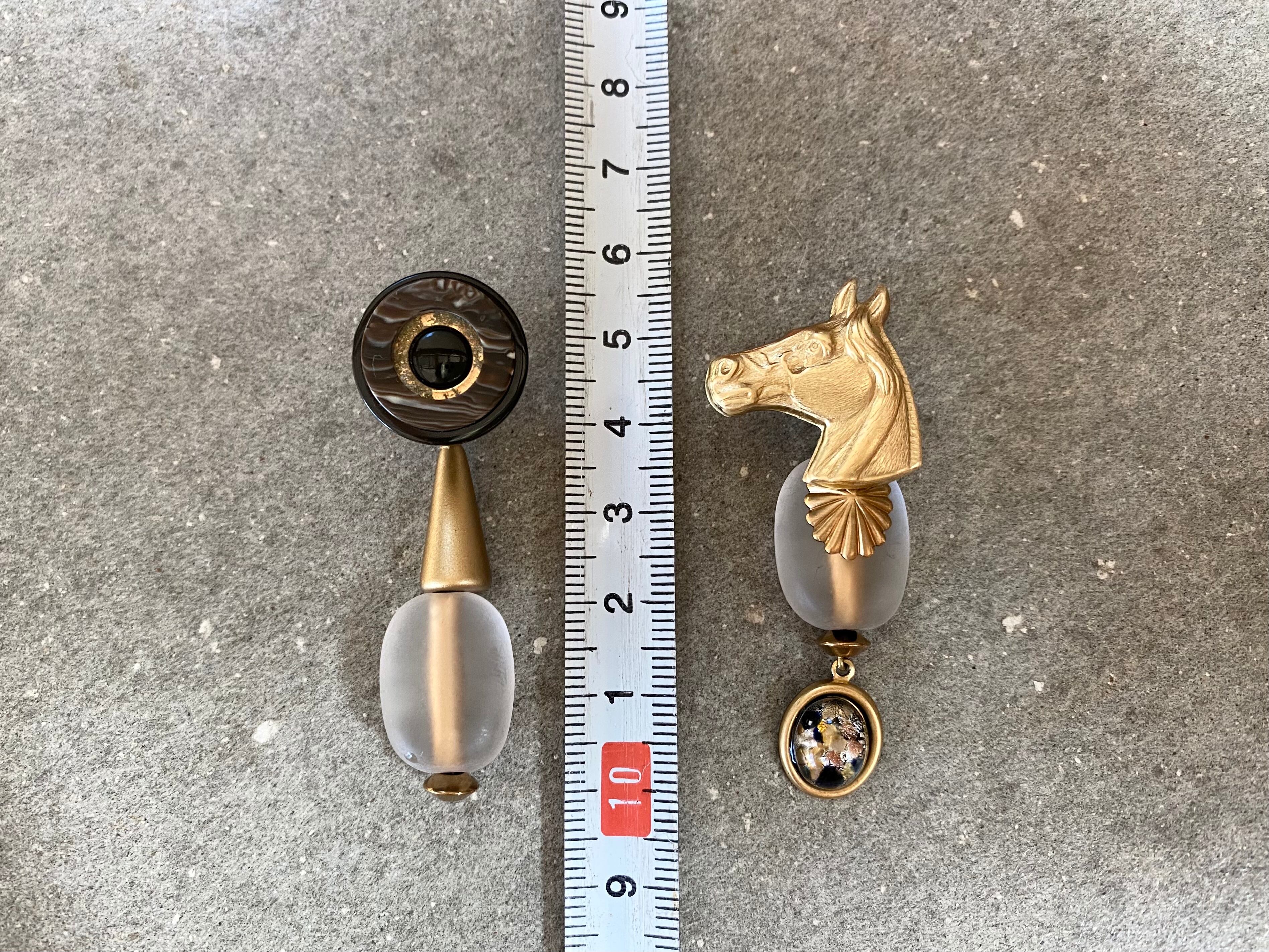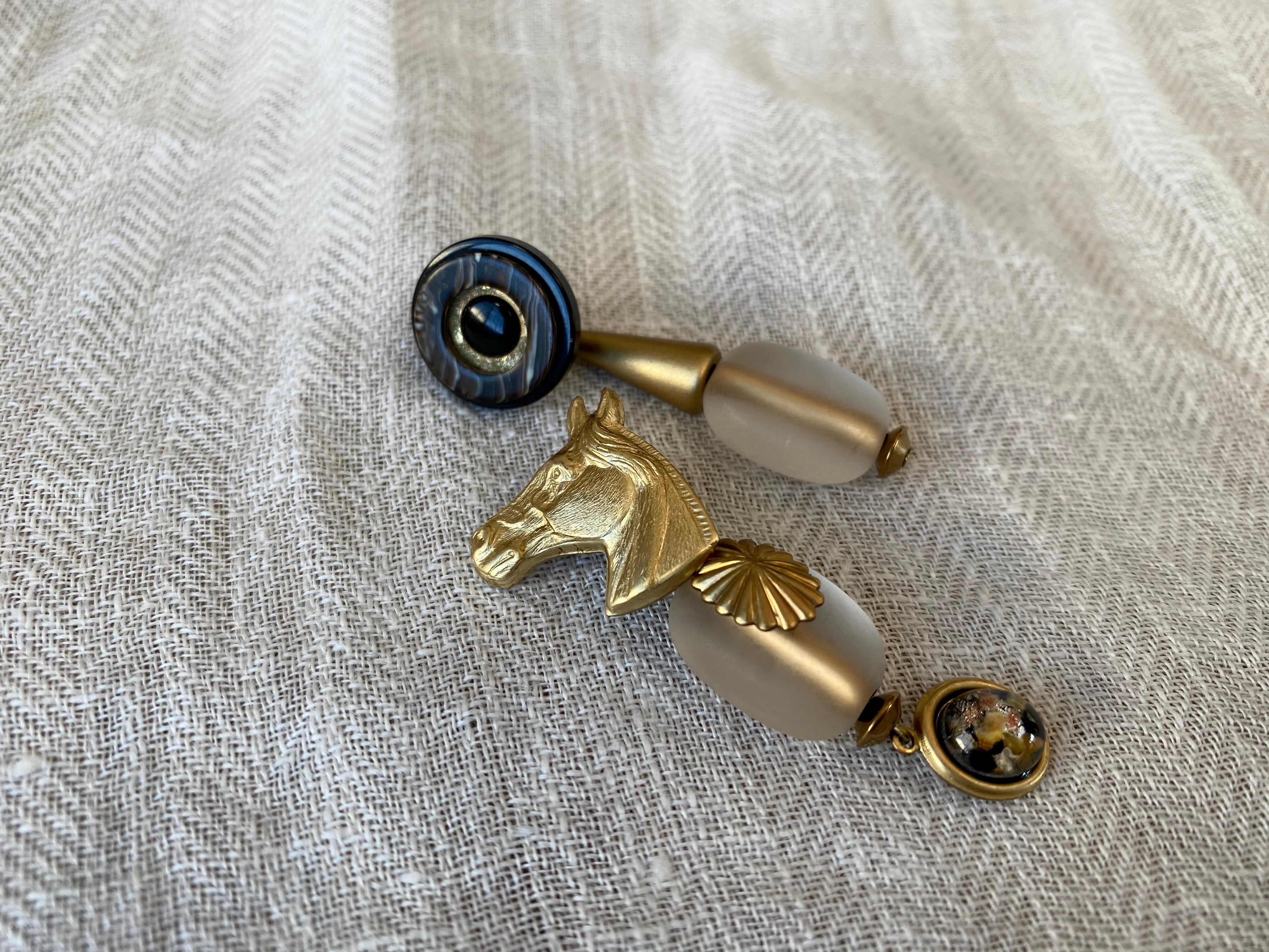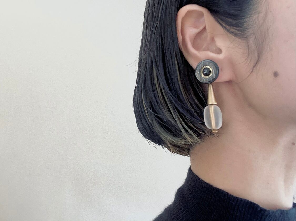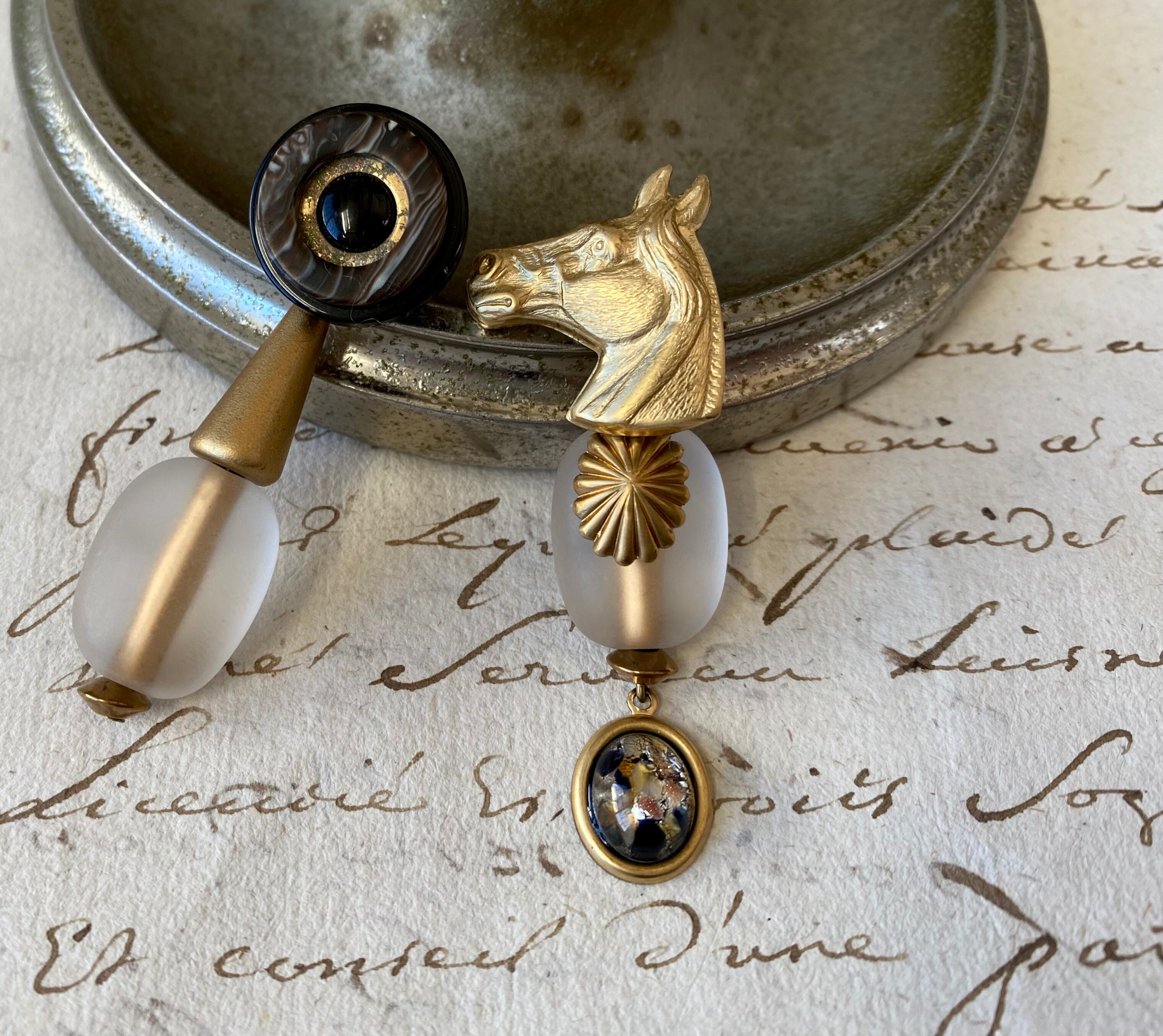 ヴィンテージパーツを組み合わせて、アシンメトリーなピアスを作りました。