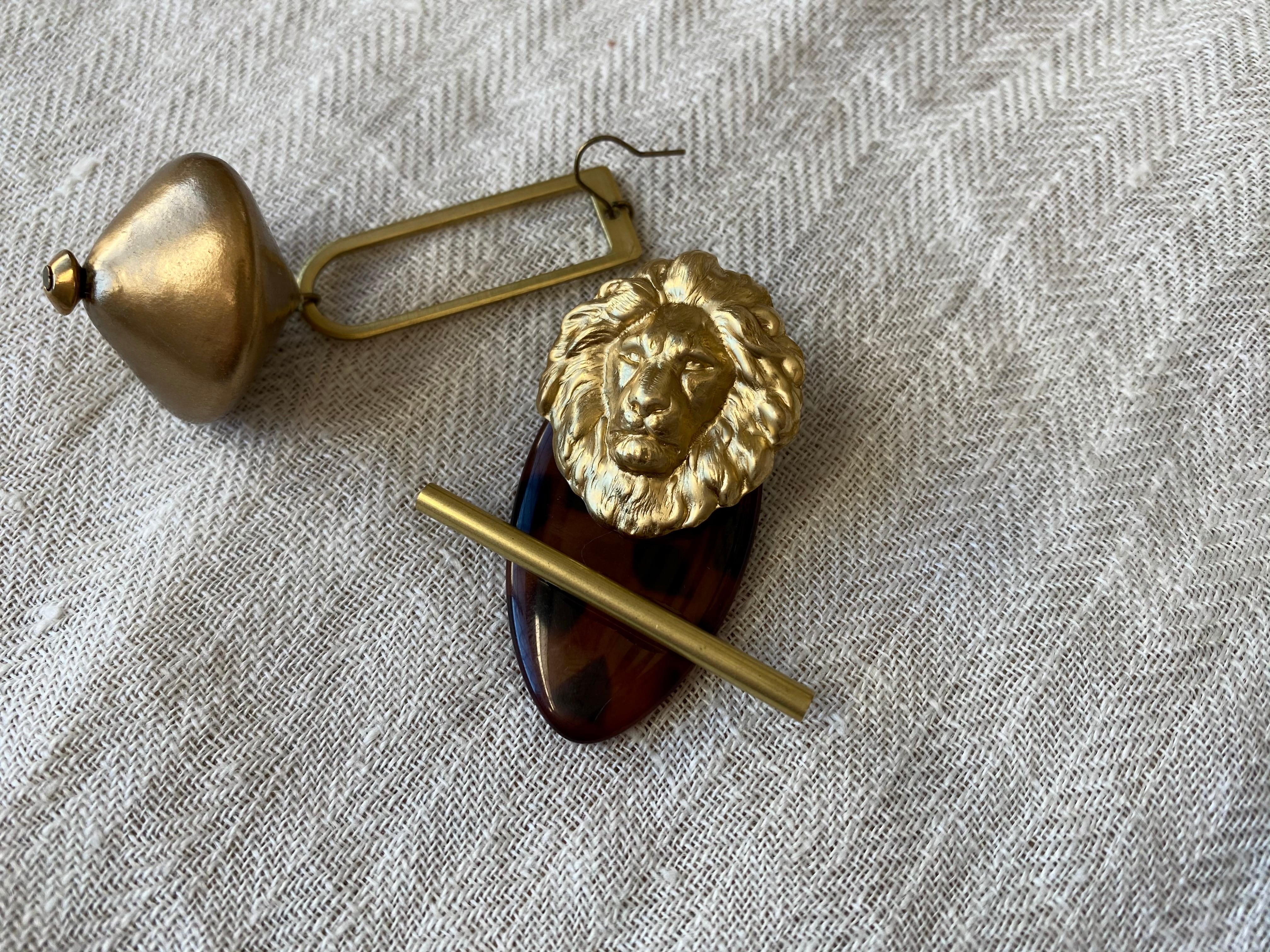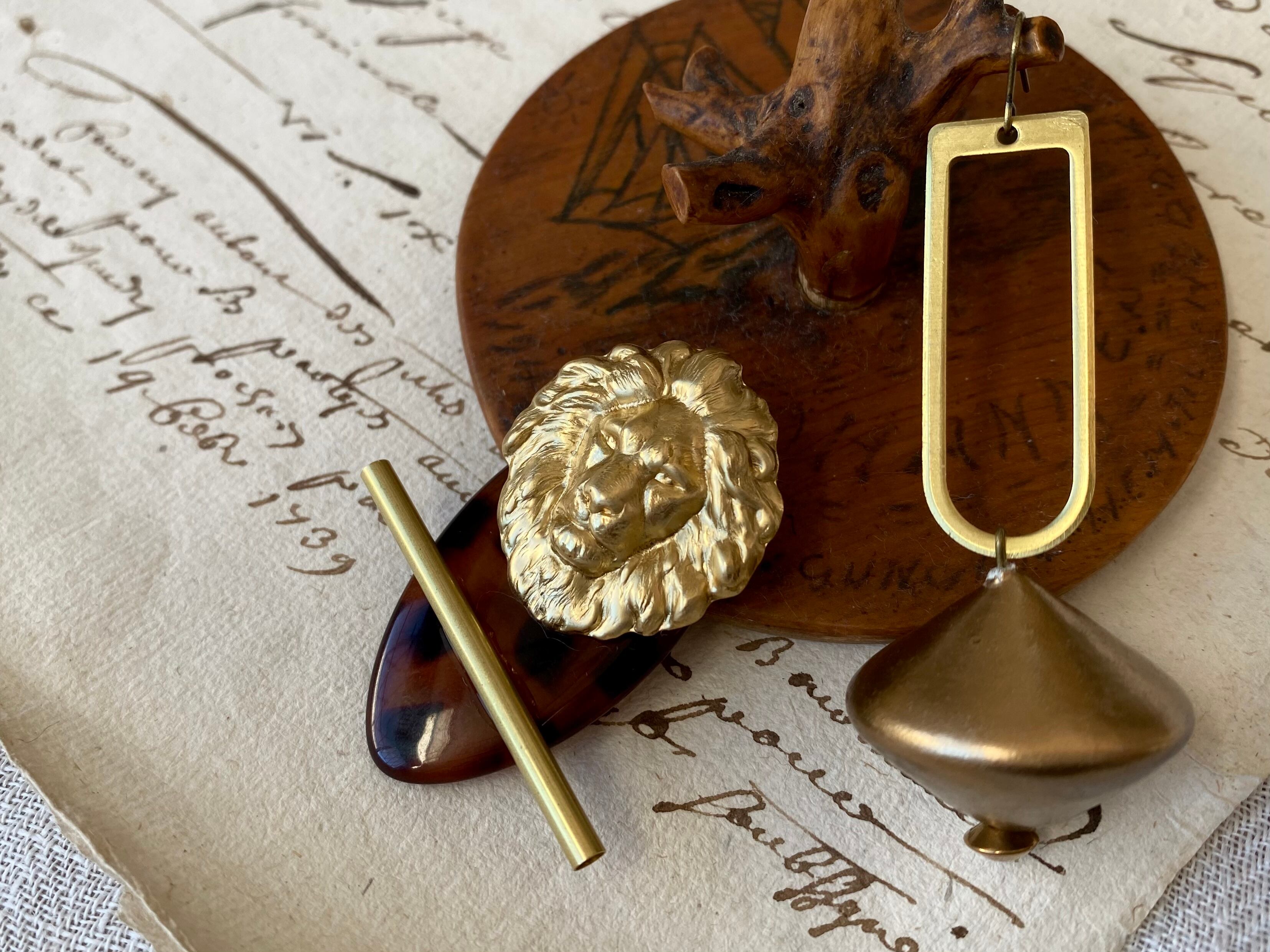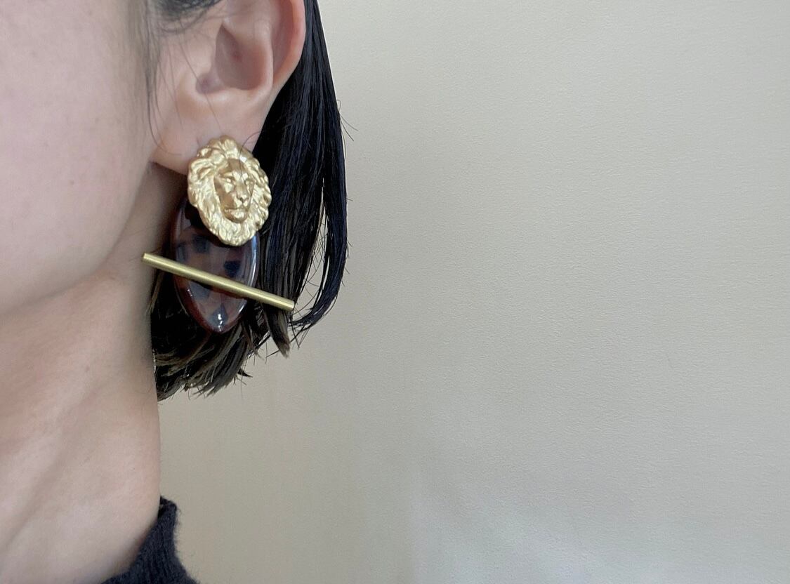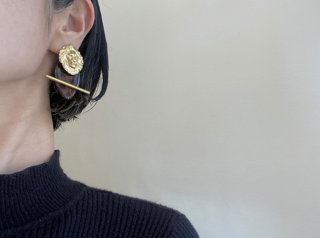 大振りなコマ型のヴィンテージビーズやライオンヘッドが大胆な印象ですが、デザイン自体はシンプルなので、全体的にシックで上品な雰囲気にまとまっています。