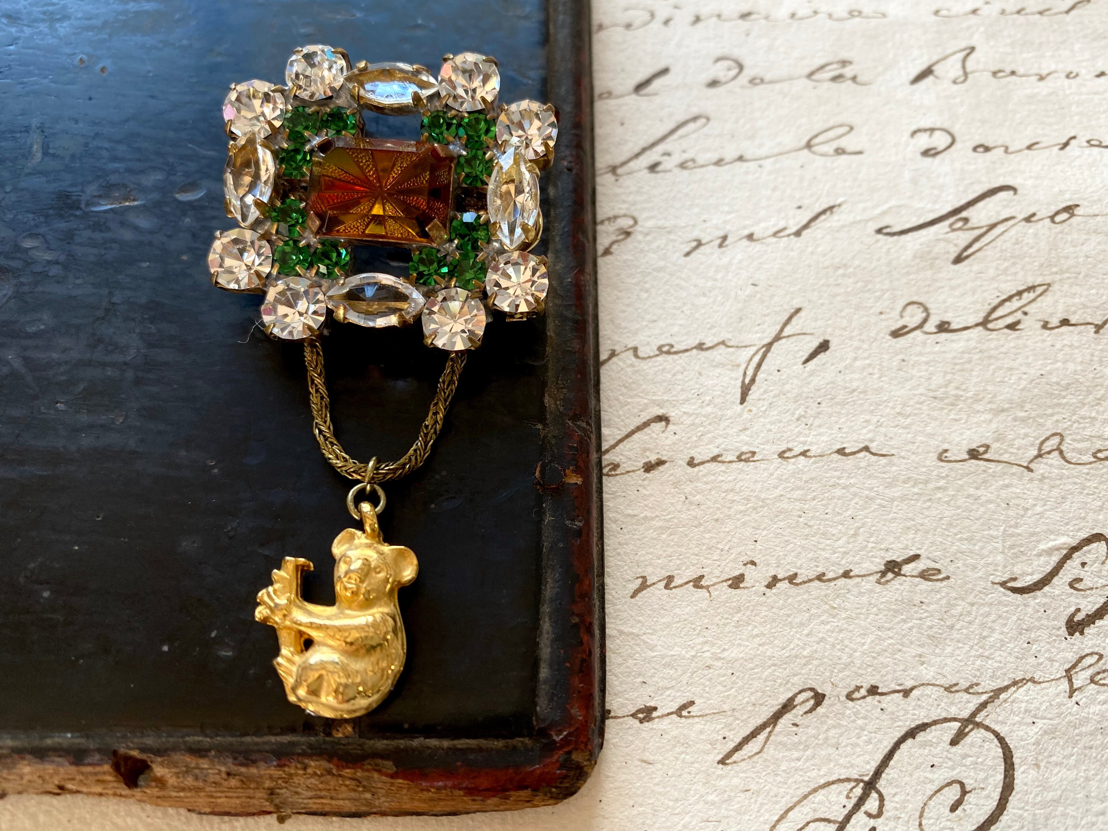 キラキラと色とりどりに耀くラインストーンのボタンに、茶目っ気のあるアニマルを添えて、上品なのにユーモアたっぷりの一品に仕上げました。