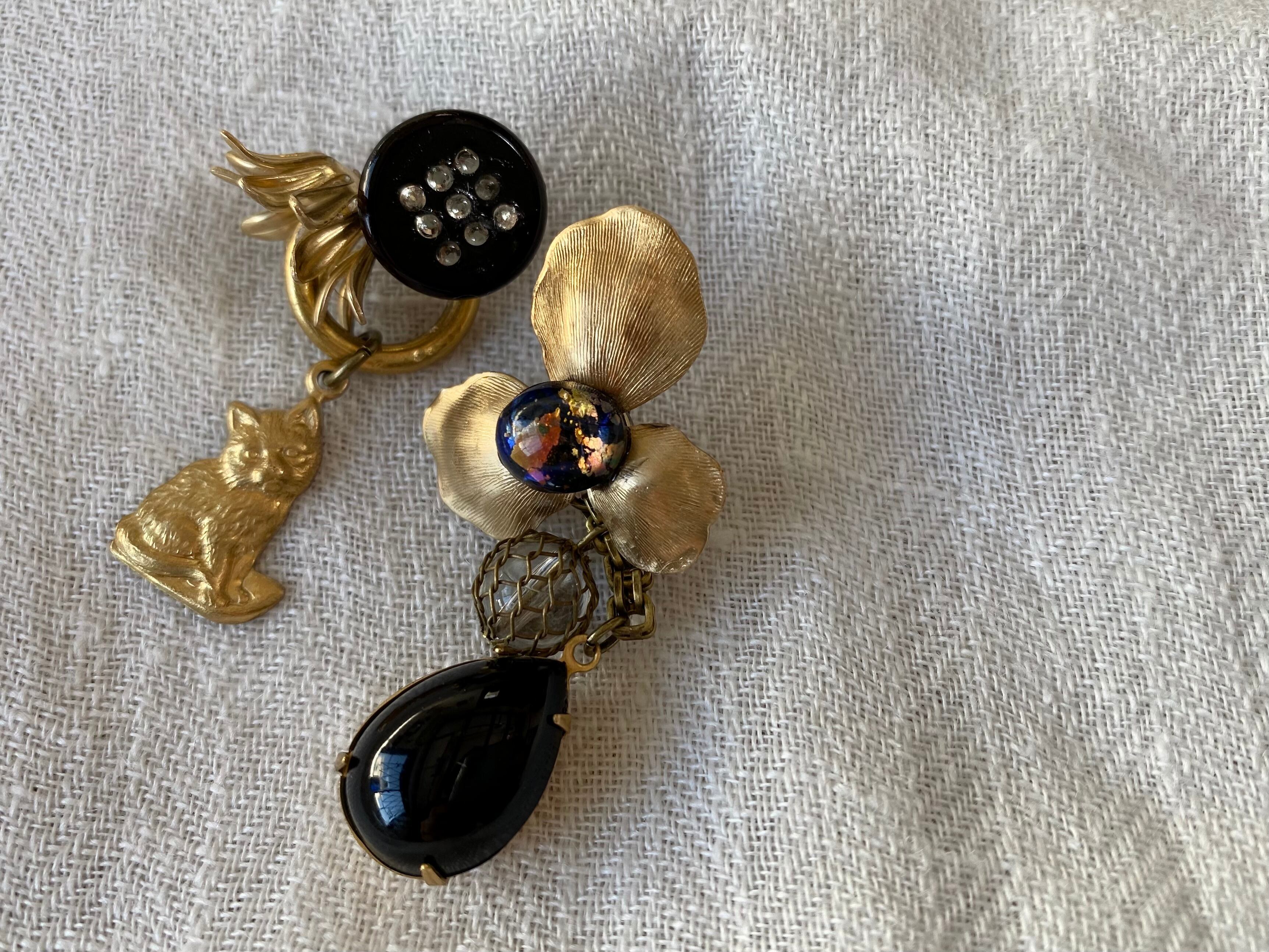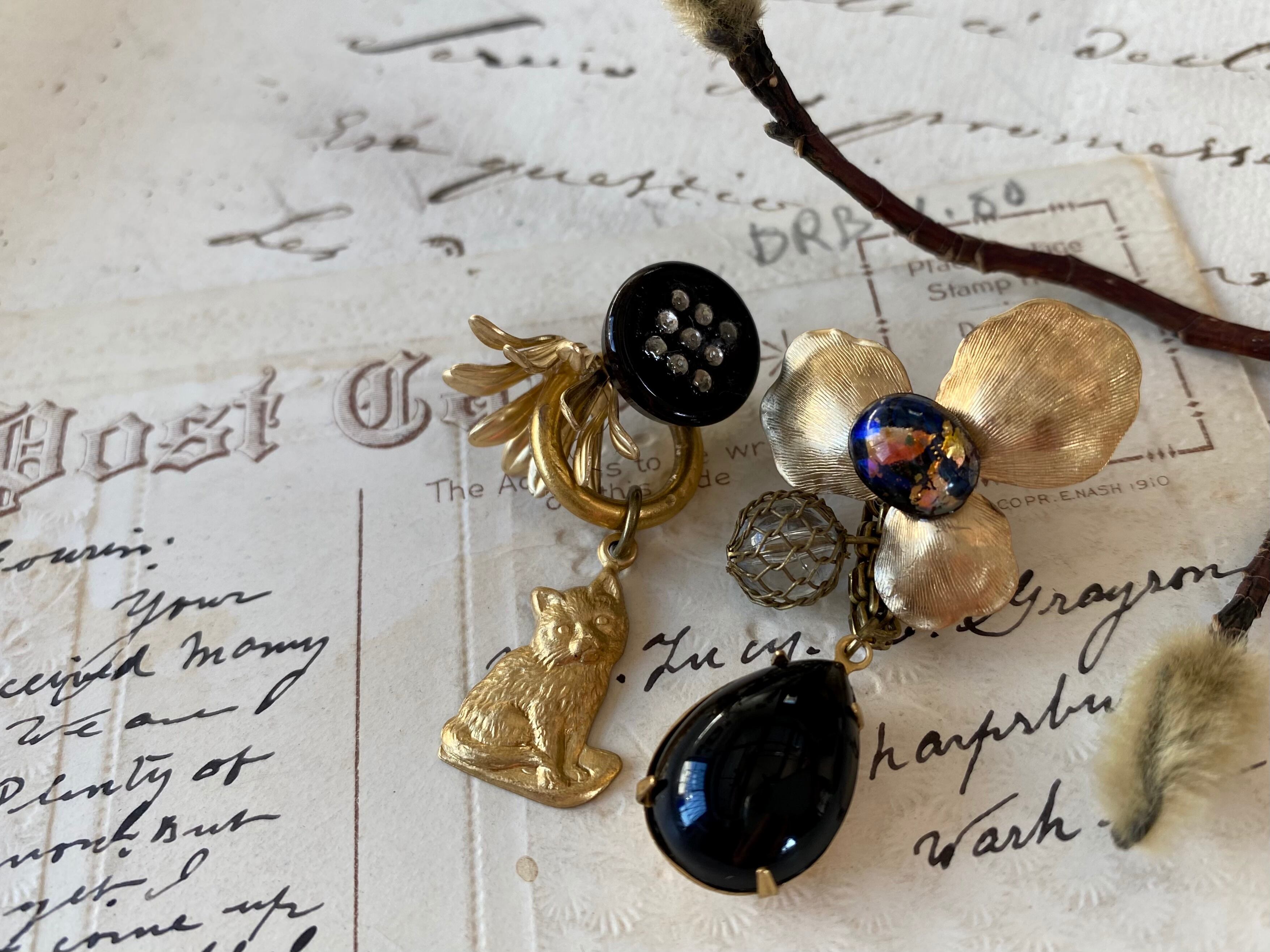 ヴィンテージパーツを組み合わせて、アシンメトリーなピアスを作りました。
