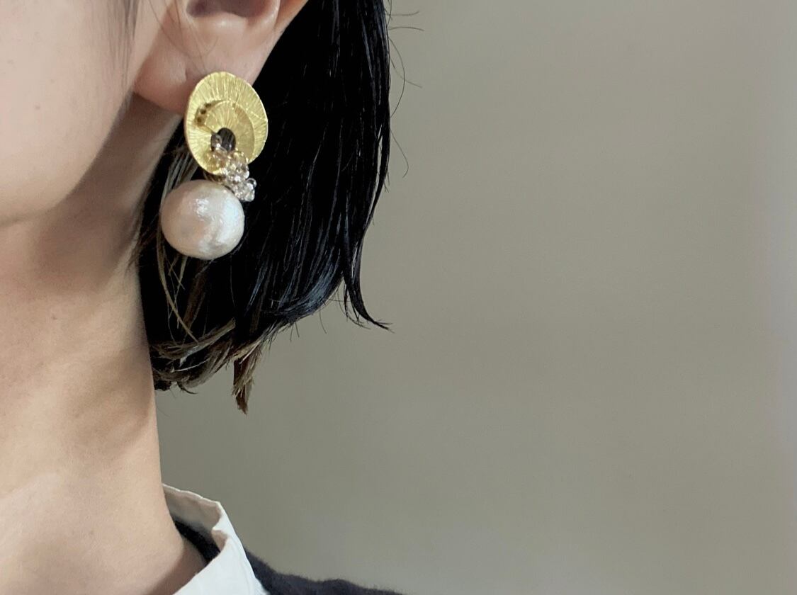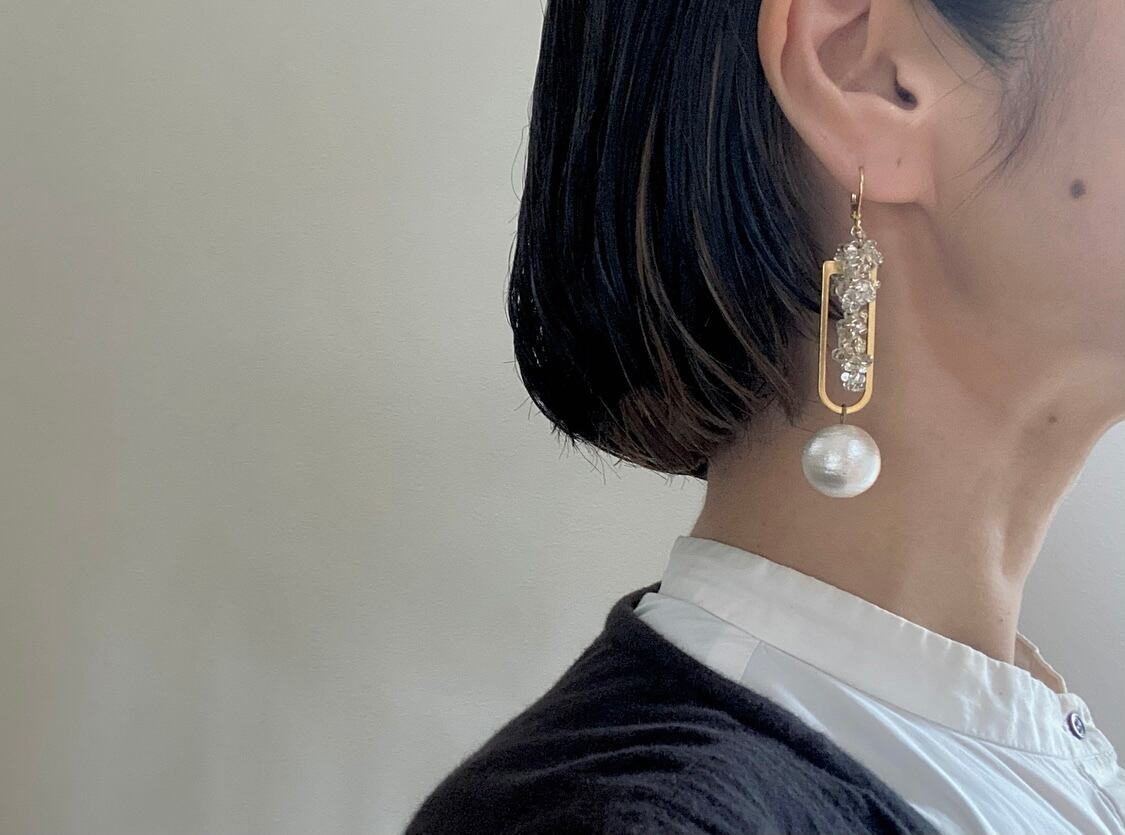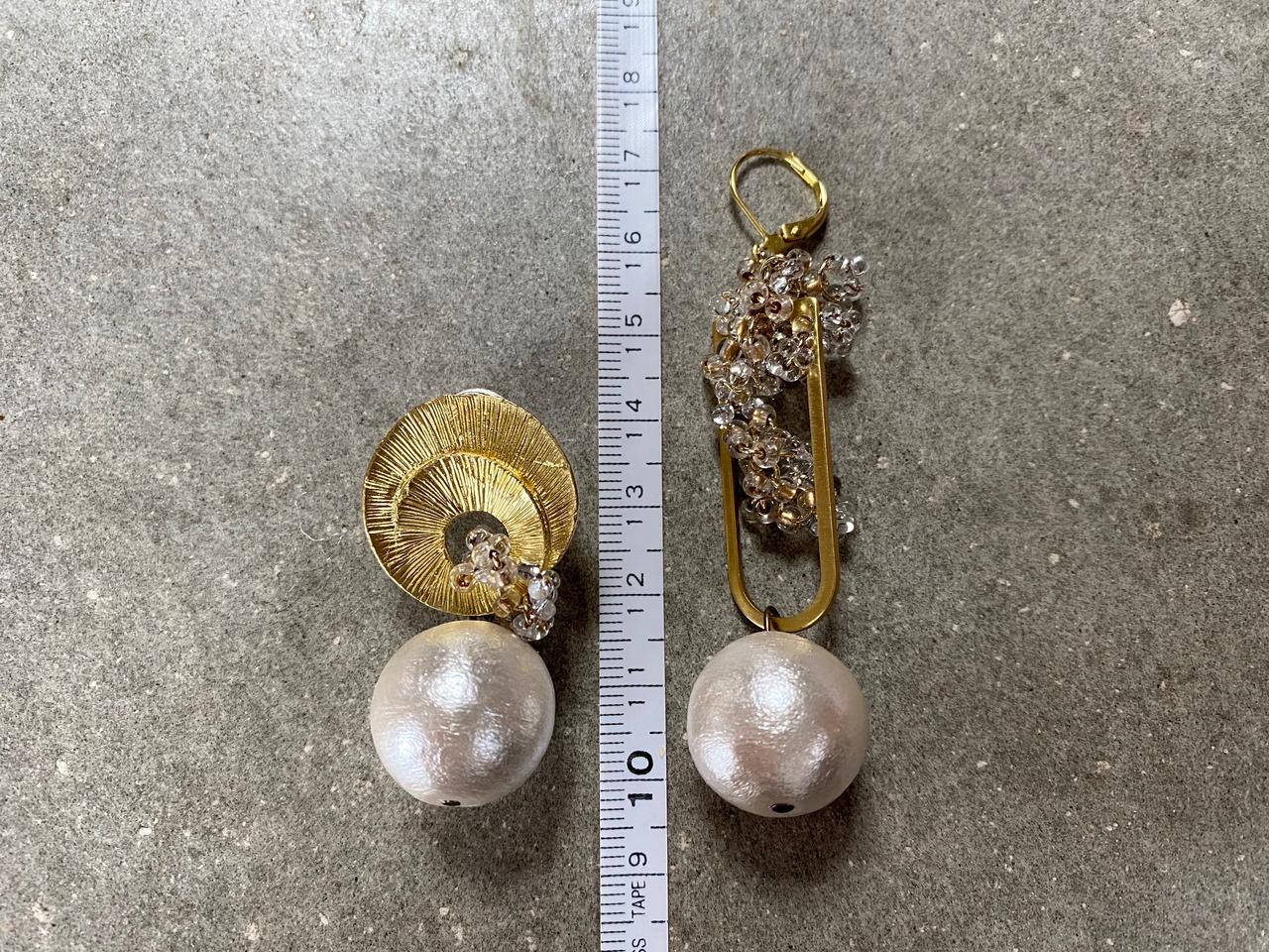 真鍮パーツとコットンパールの間にクリアガラスのビーズを絡ませて、アシンメトリーなピアスを作りました。