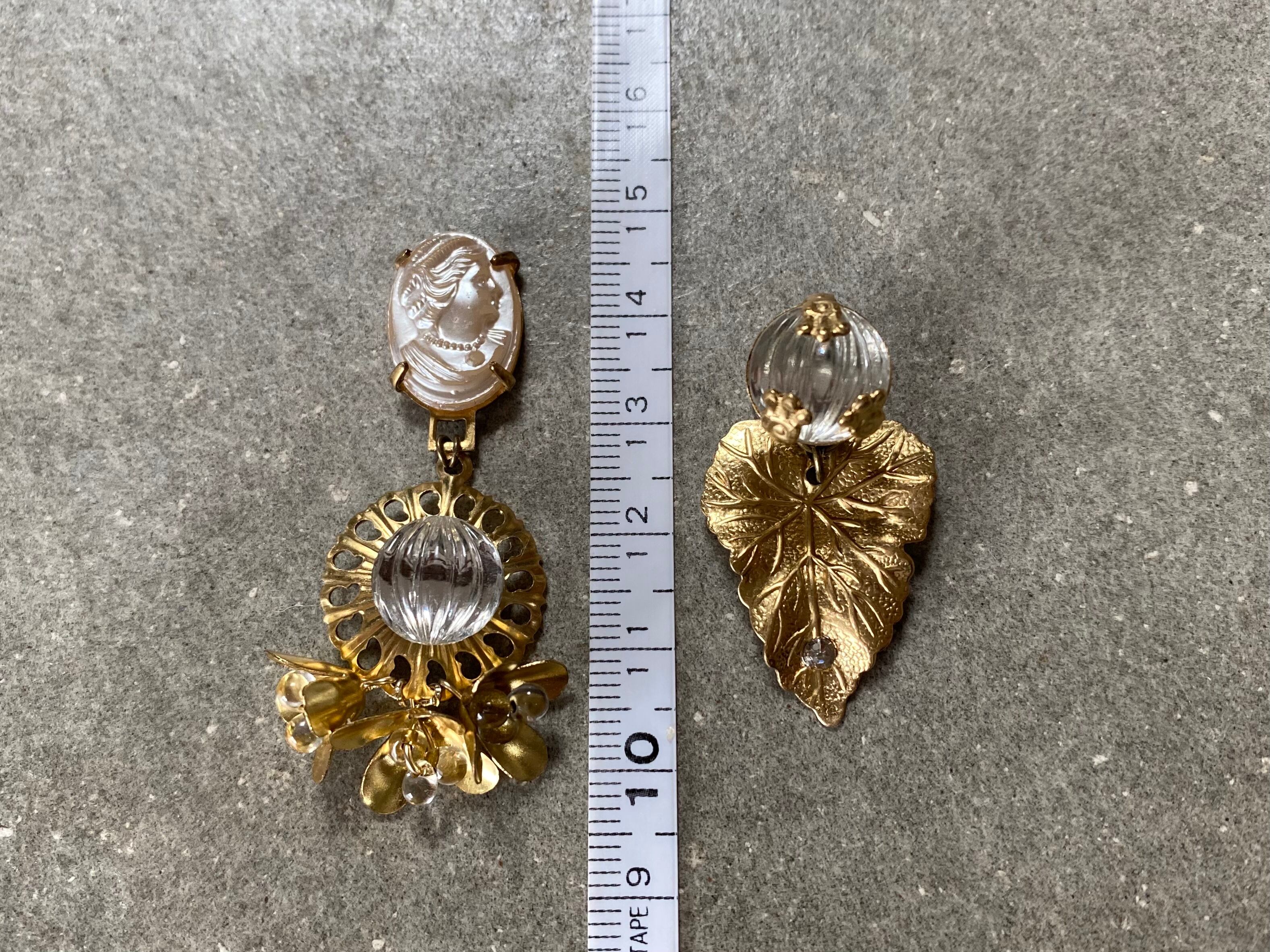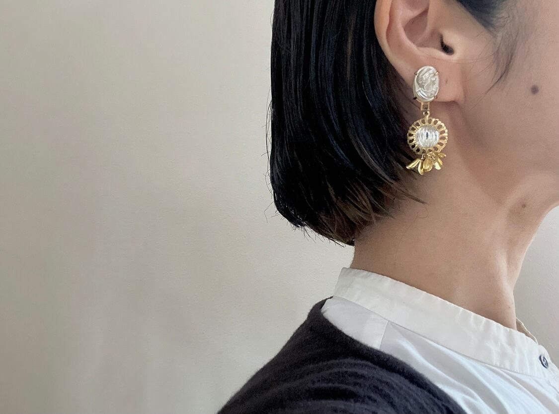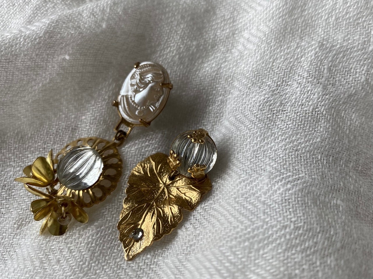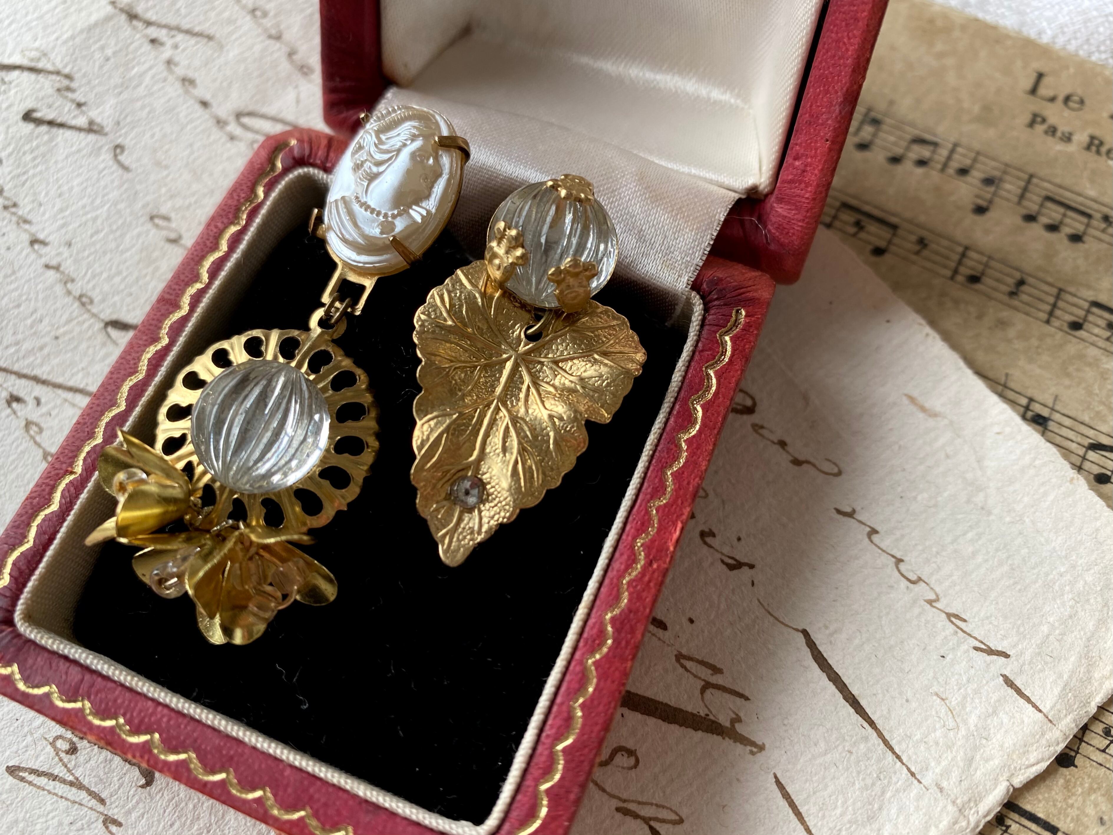 ヴィンテージパーツを組み合わせて、アシンメトリーなピアスを作りました。