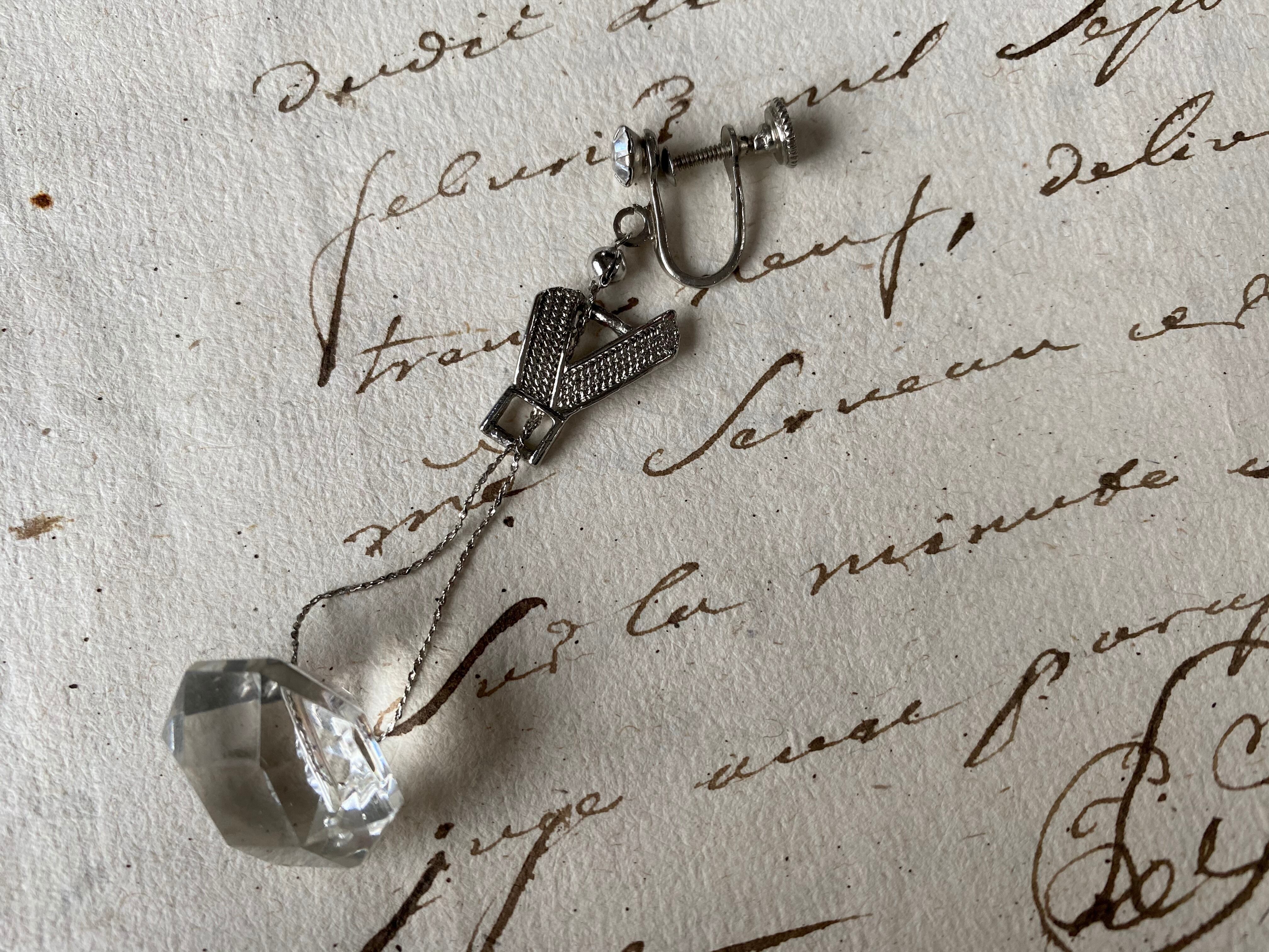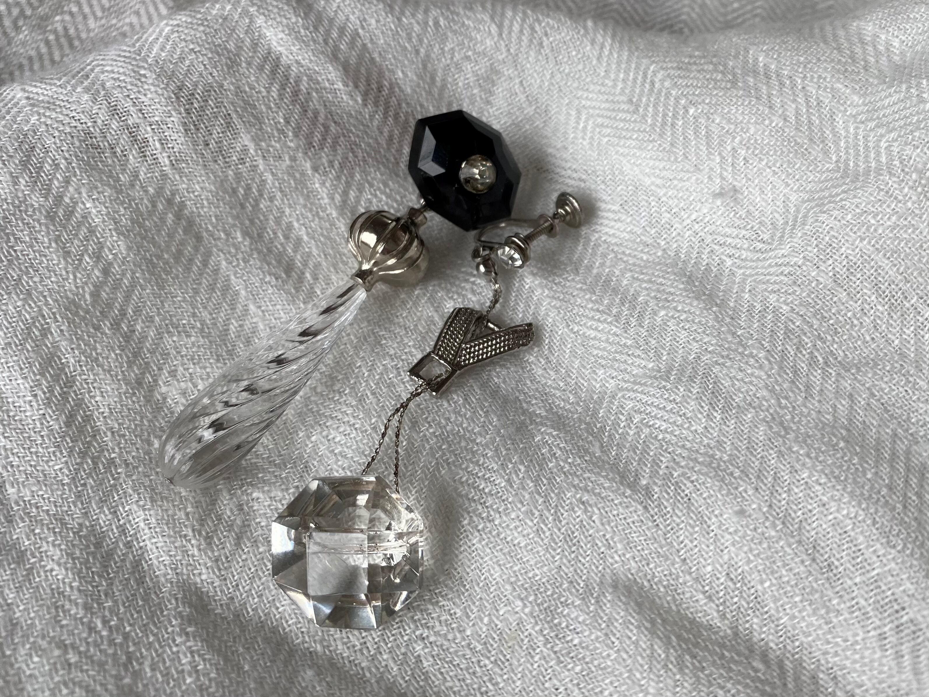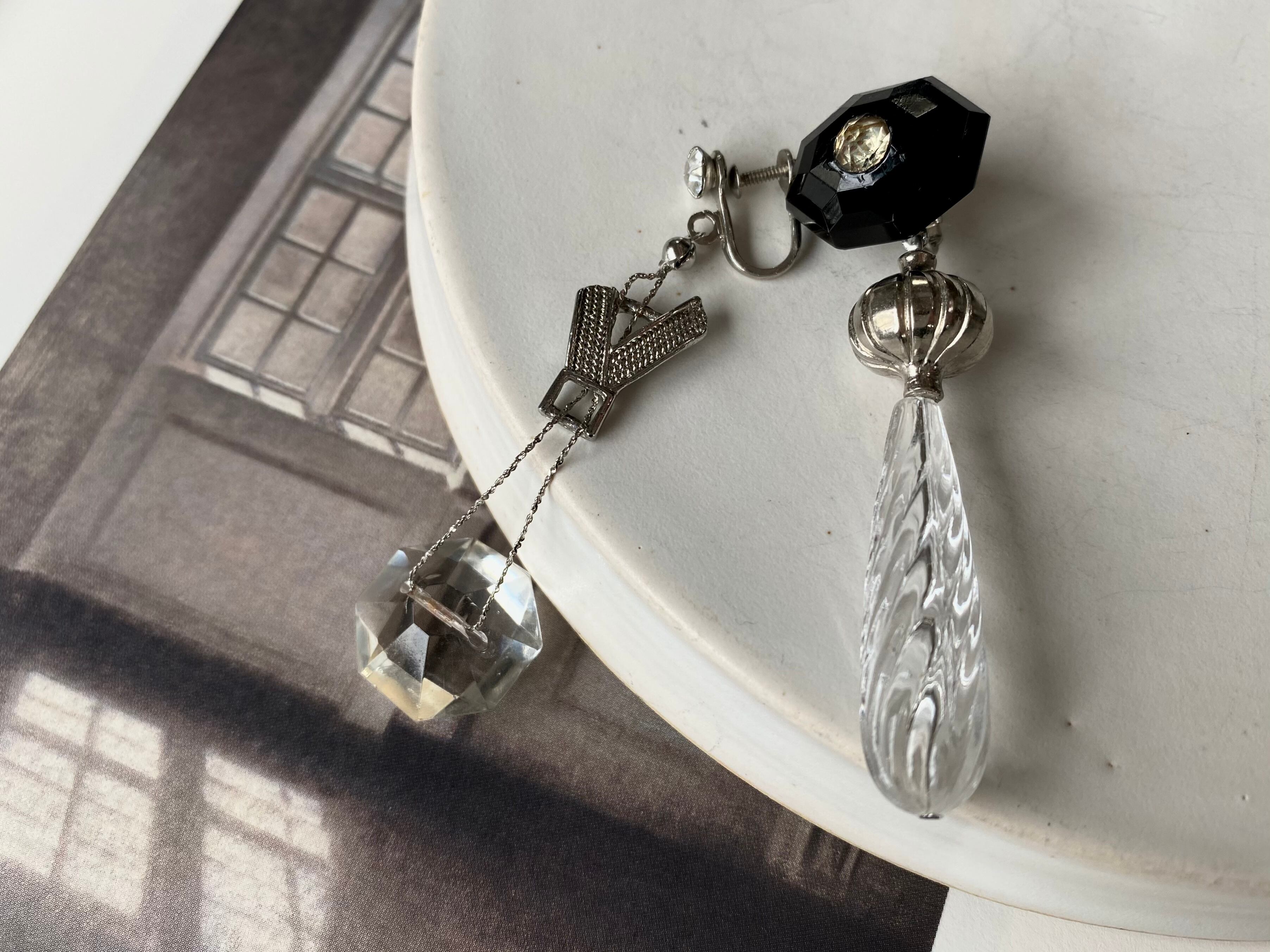 ヴィンテージパーツを組み合わせてアシンメトリーなイヤリングを作りました。