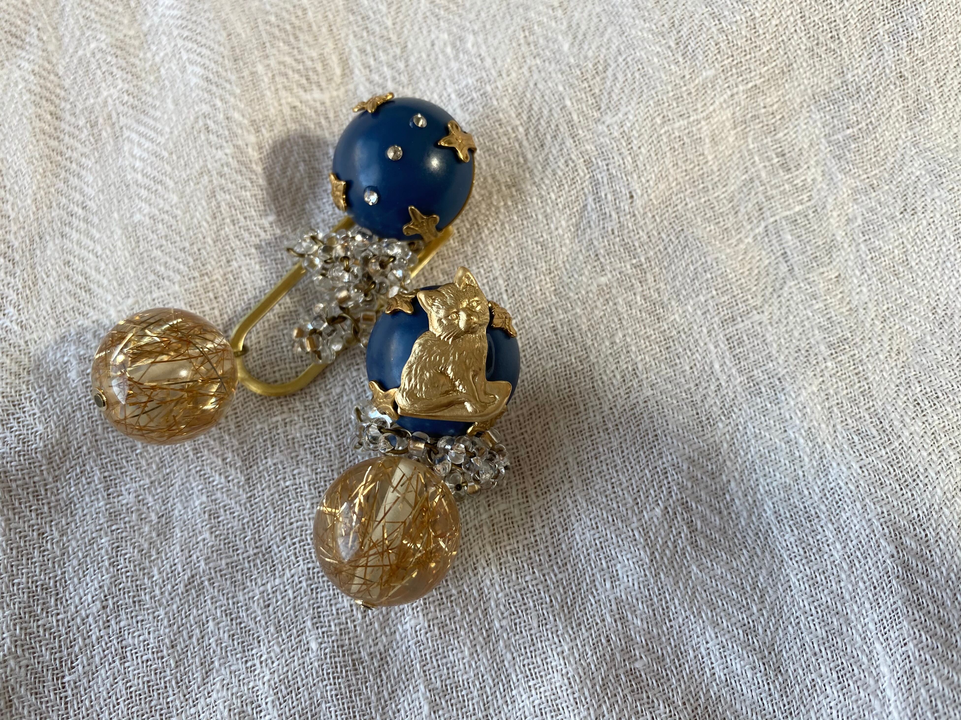 落ち着いたスカイブルーのカボションに、真鍮のネコモチーフパーツやスワロフスキーを置いて、お茶目な雰囲気に仕上げました。