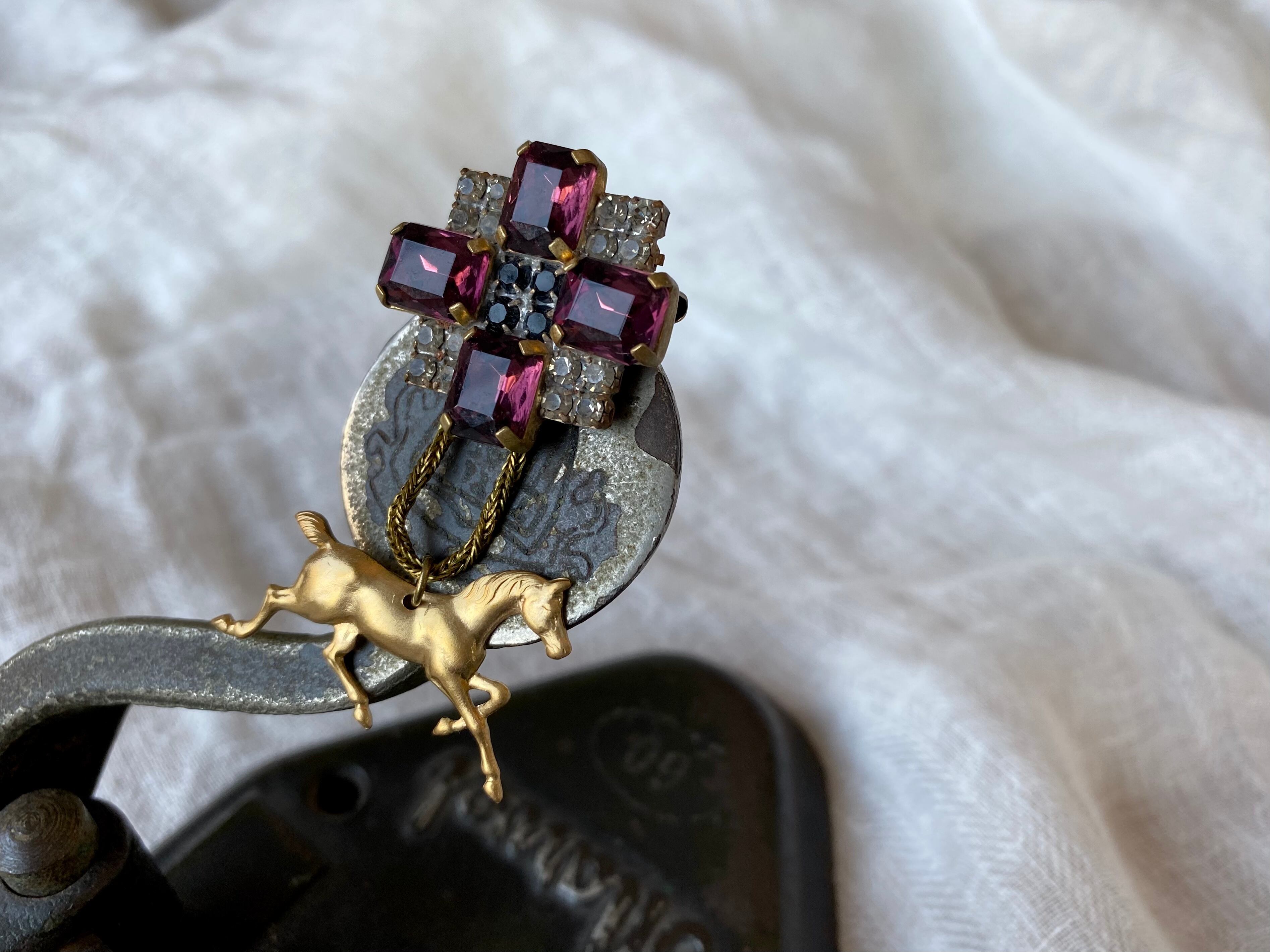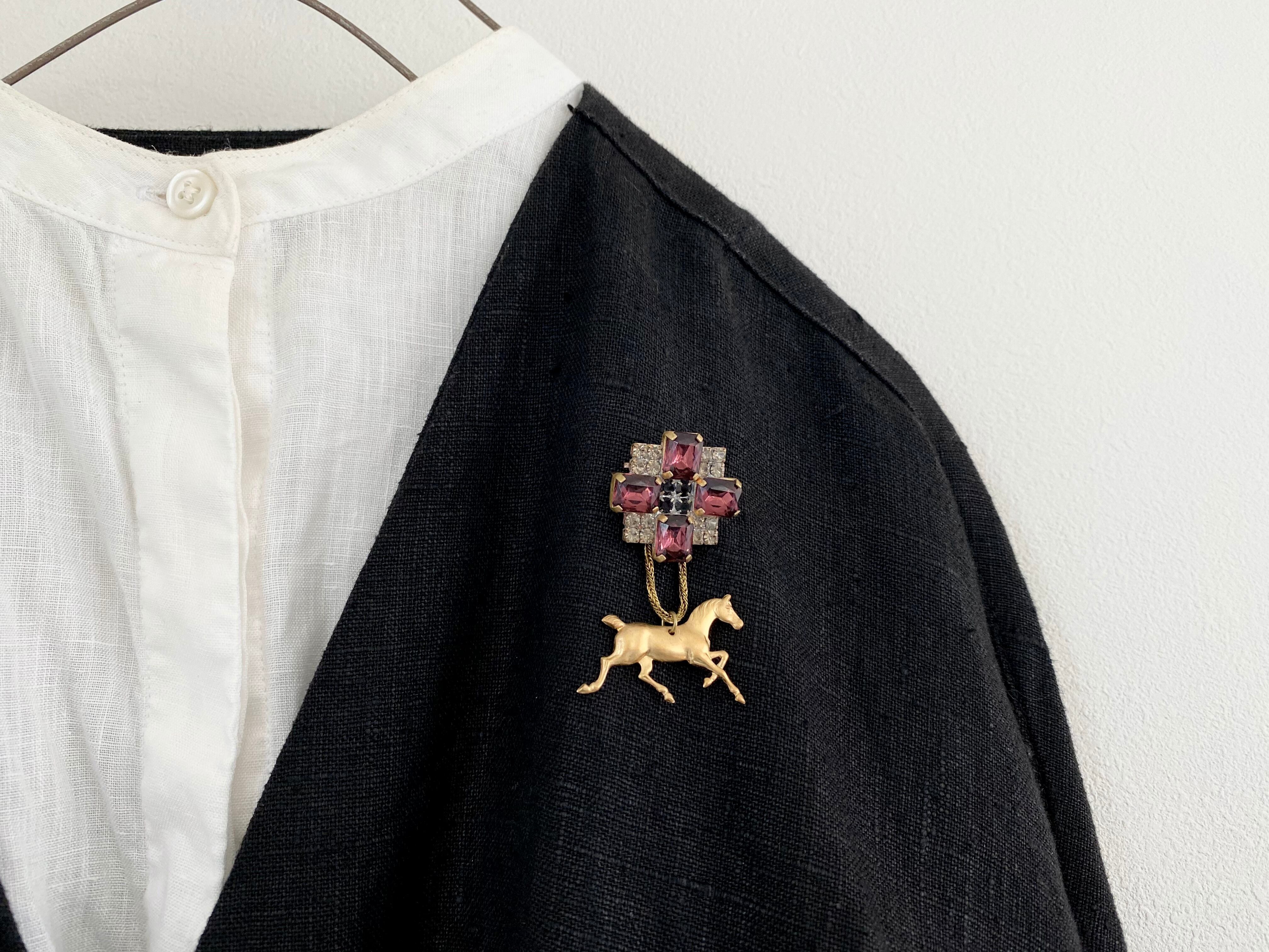 味わい深い色のラインストーンが並べられたヴィンテージボタンに、馬モチーフの真鍮パーツを添えて、遊び心がありながらも上品でシックな雰囲気に仕上げました。