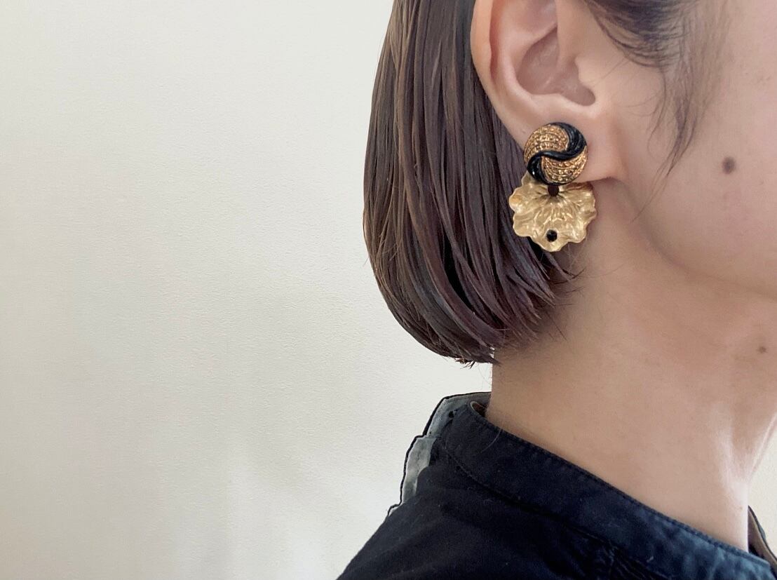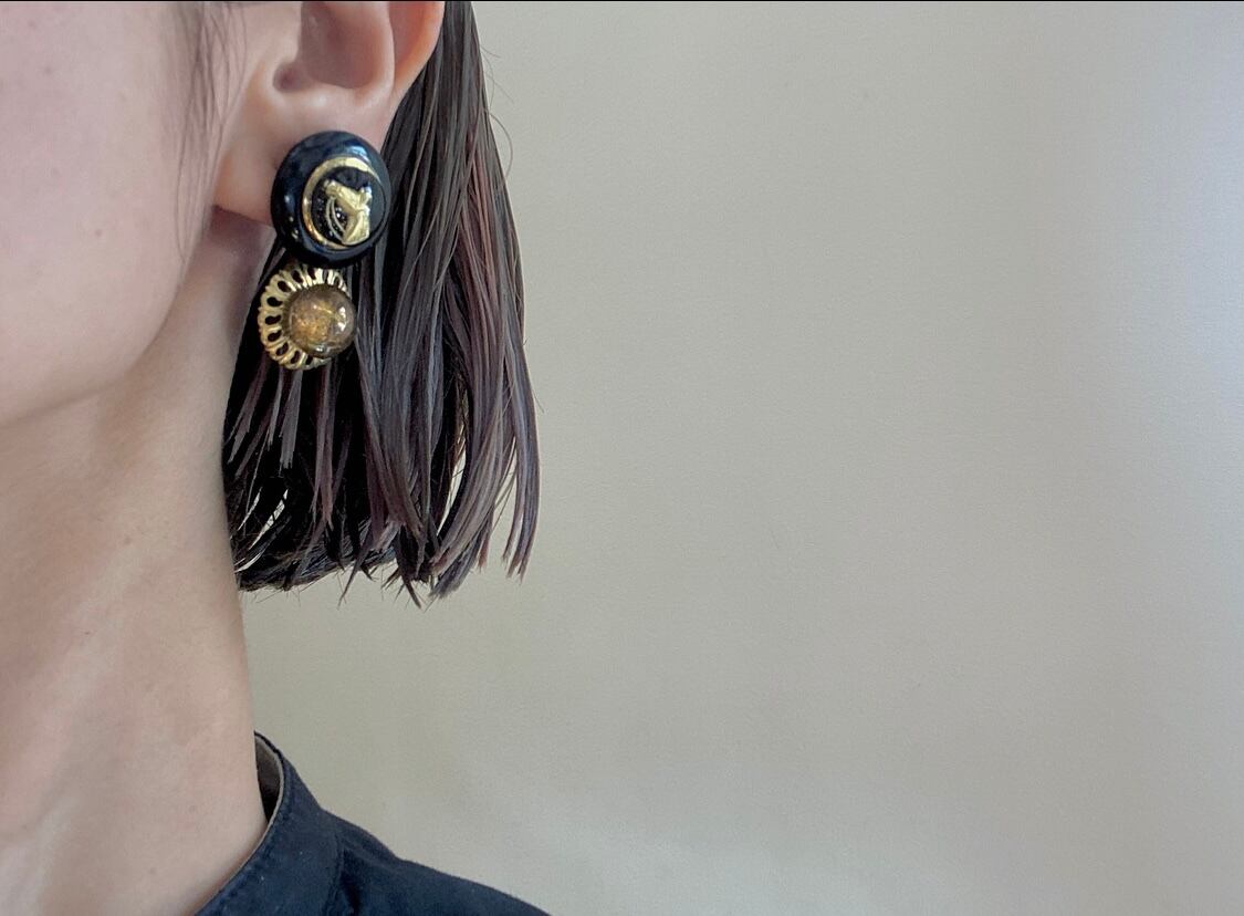 ヴィンテージパーツを組み合わせてアシンメトリーなピアスを作りました。