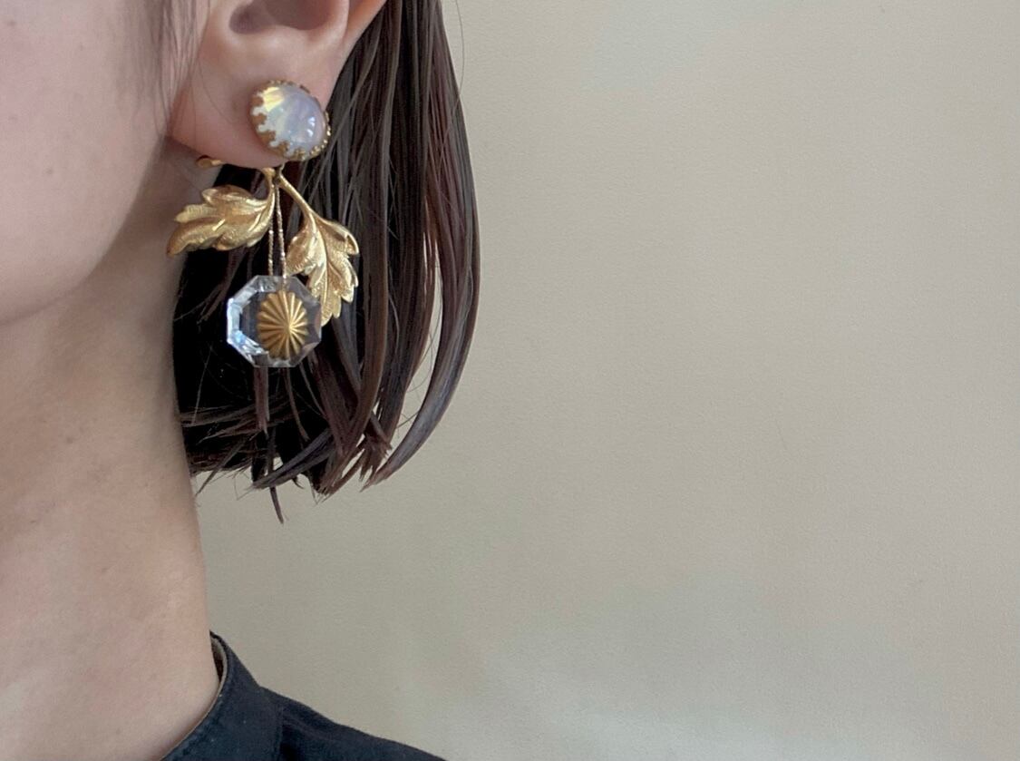 ヴィンテージパーツを組み合わせてアシンメトリーなピアスを作りました。
