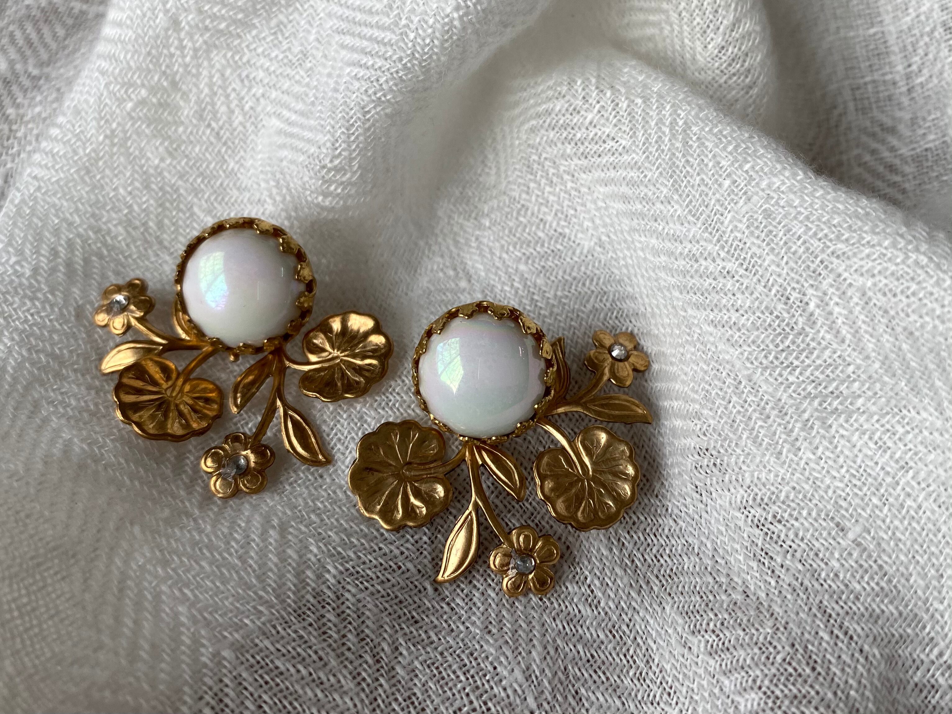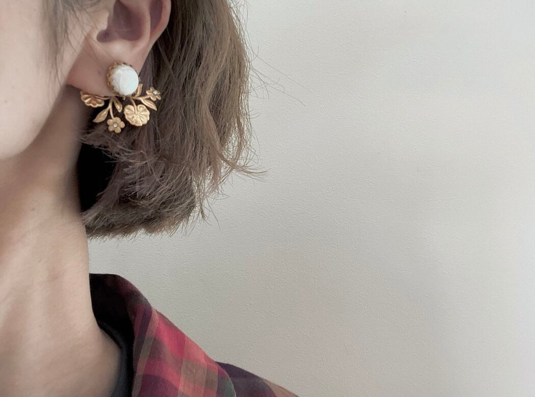 ミリアムハスケルでも用いられている、ほんのりと桜色の光を帯びたミルクガラスのヴィンテージカボションに、ボタニカルモチーフパーツを合わせました。