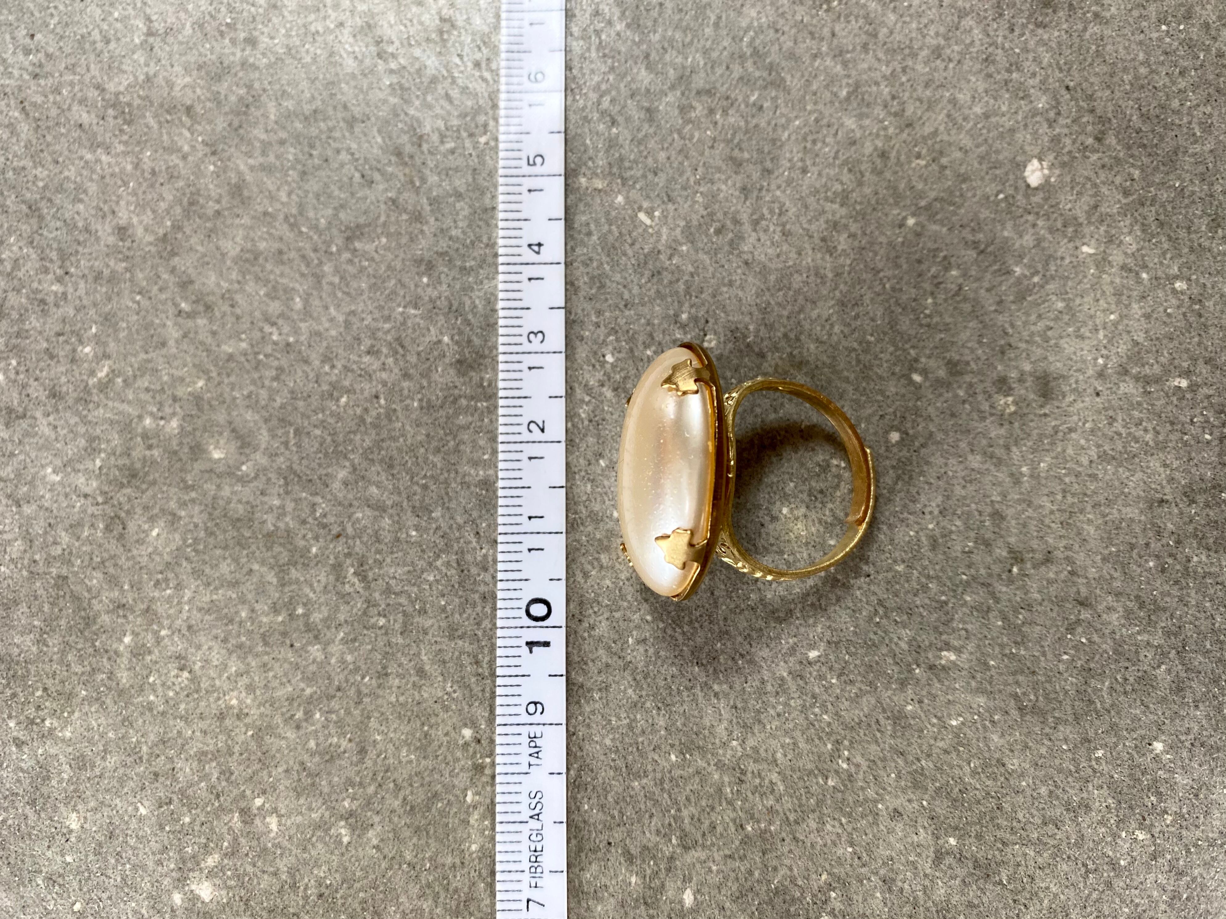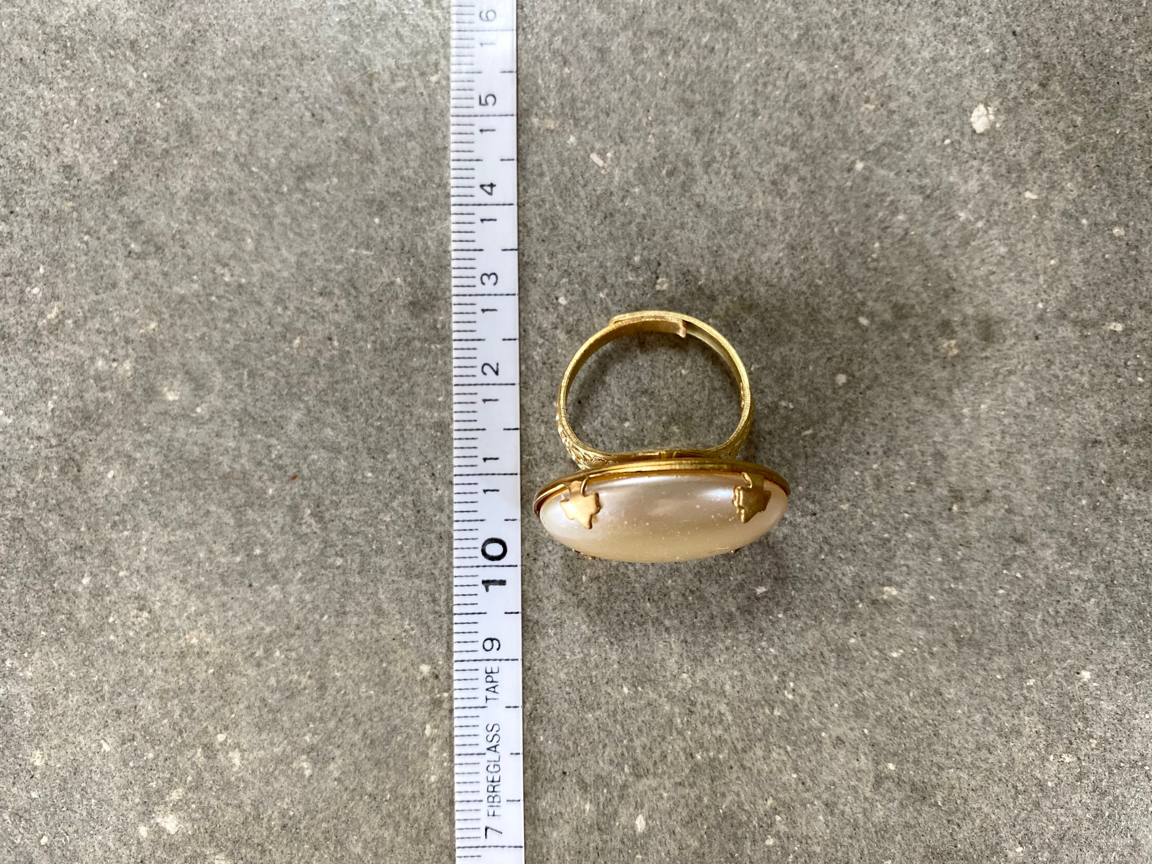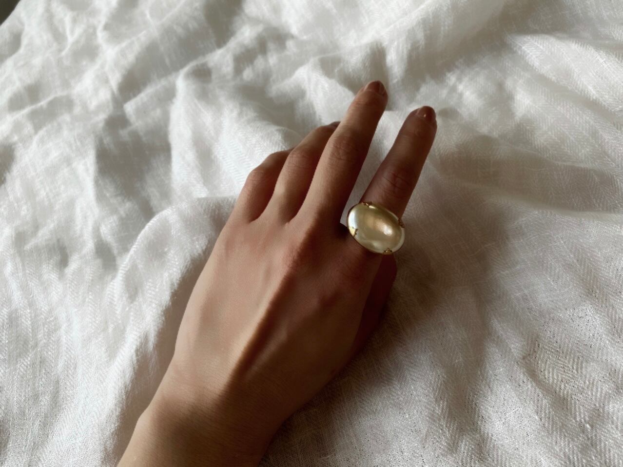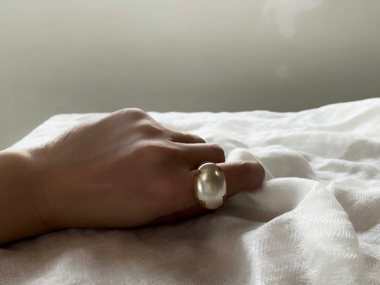 上品で深みのあるヴィンテージガラスパールを主役に、シンプルな一粒リングを作りました。