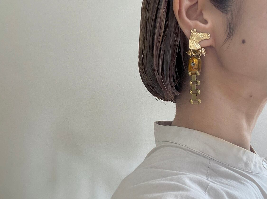 ヴィンテージパーツを組み合わせてアシンメトリーなピアスを作りました。
