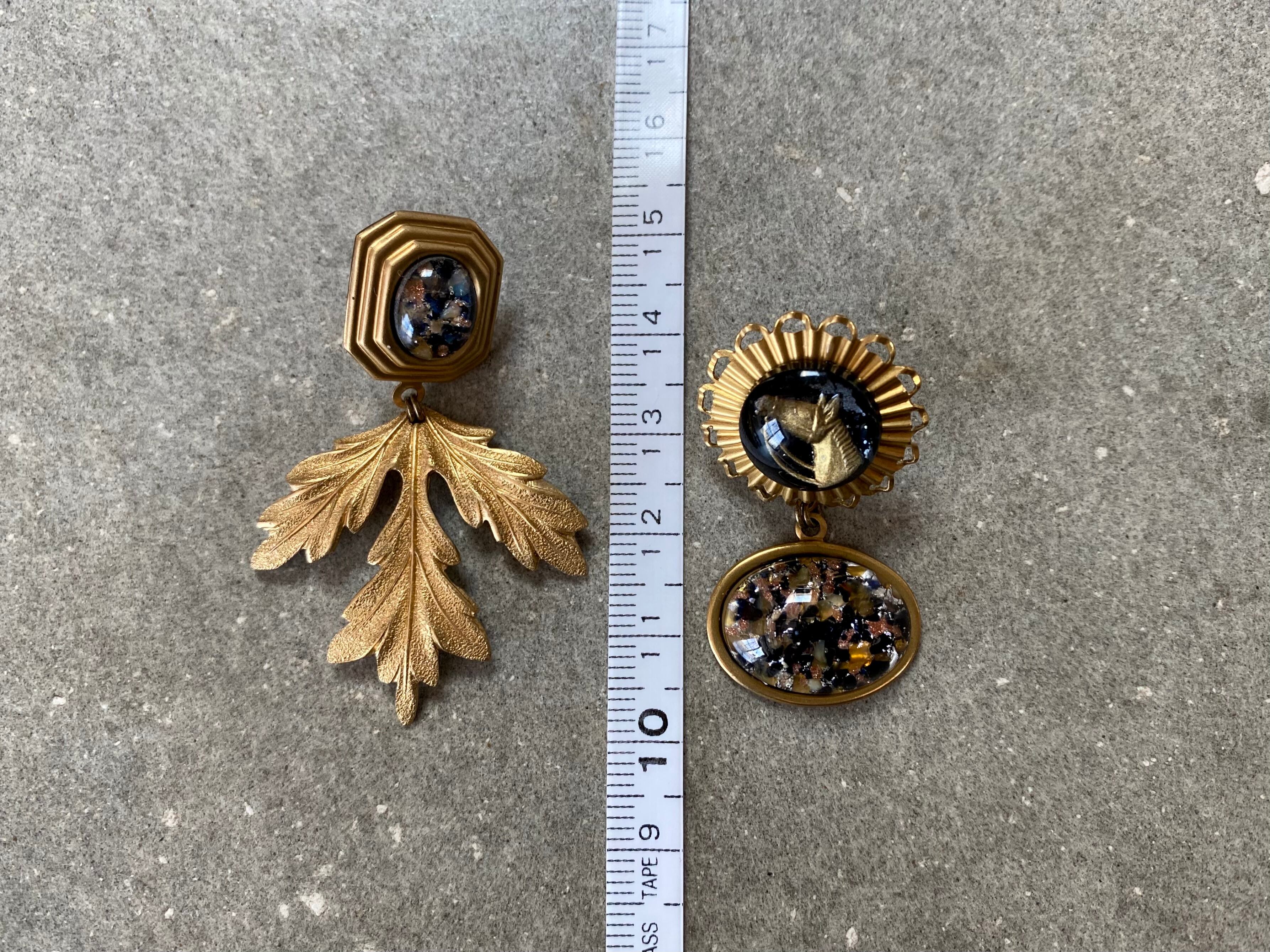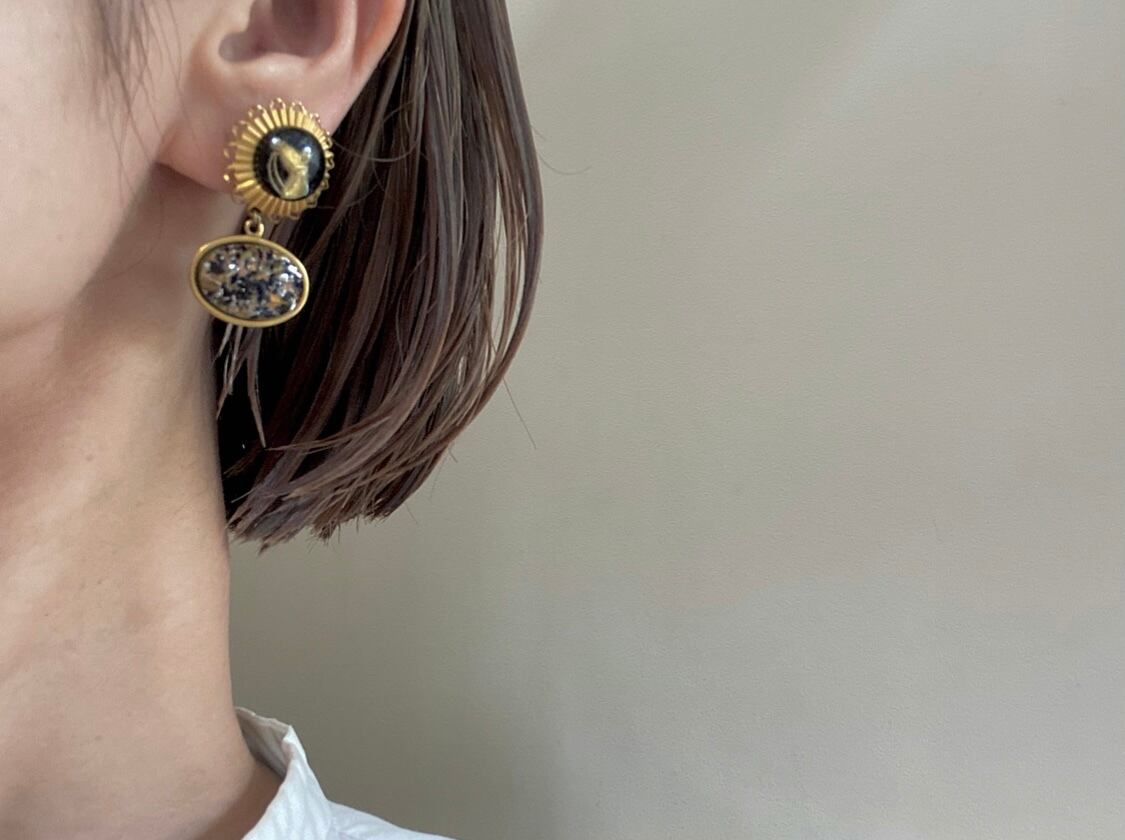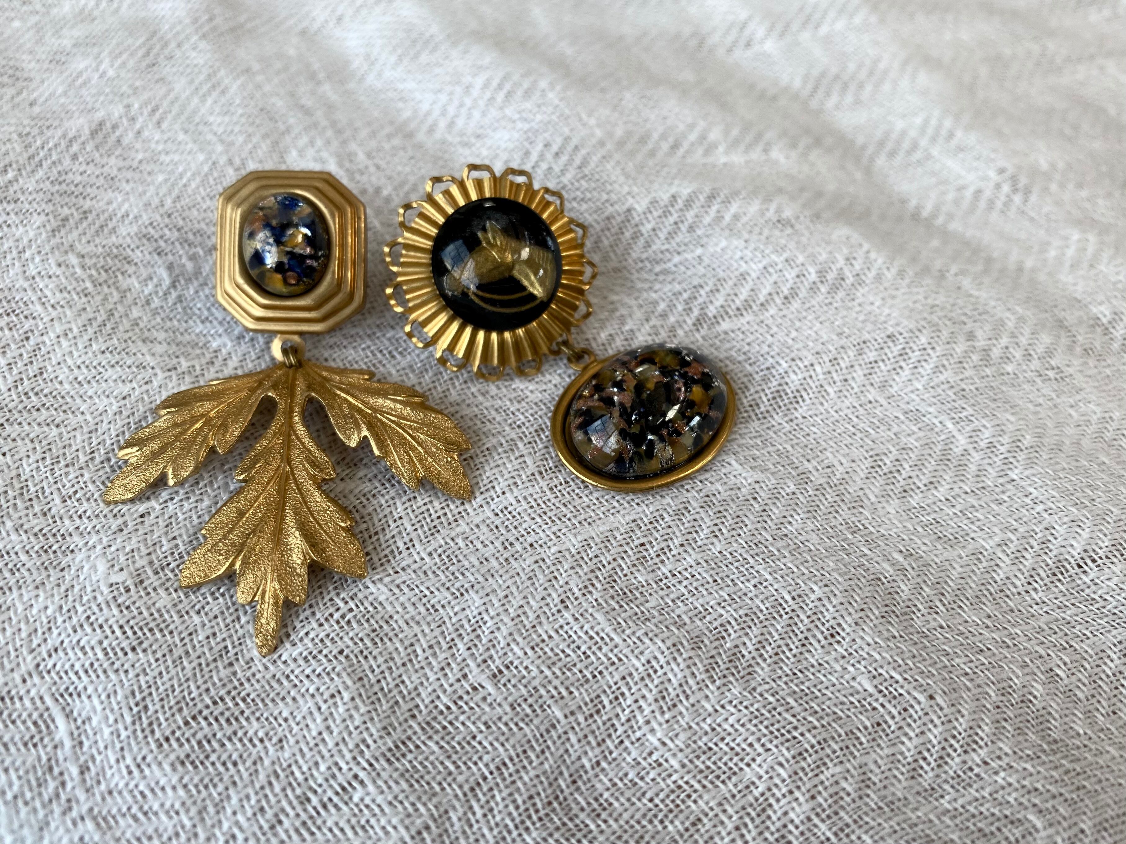 ヴィンテージパーツを組み合わせてアシンメトリーなピアスを作りました。