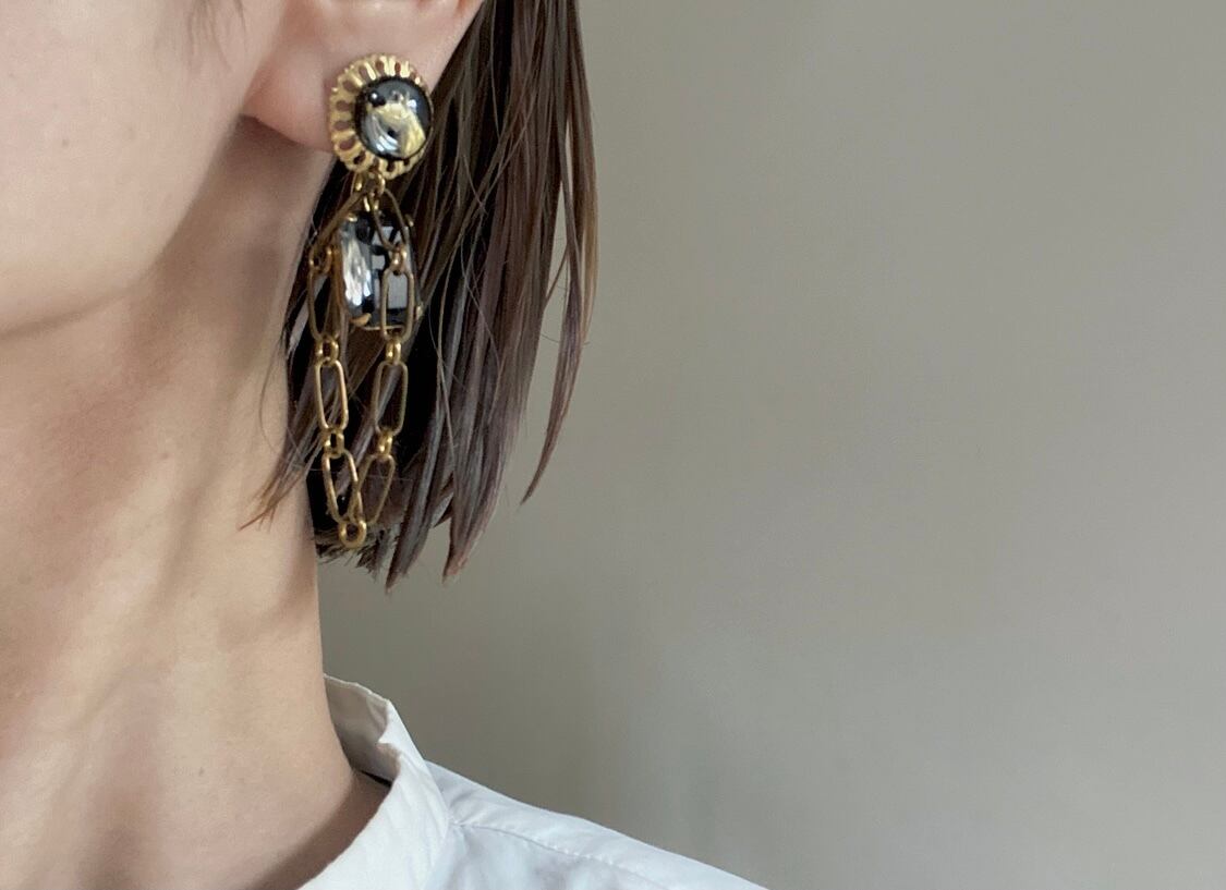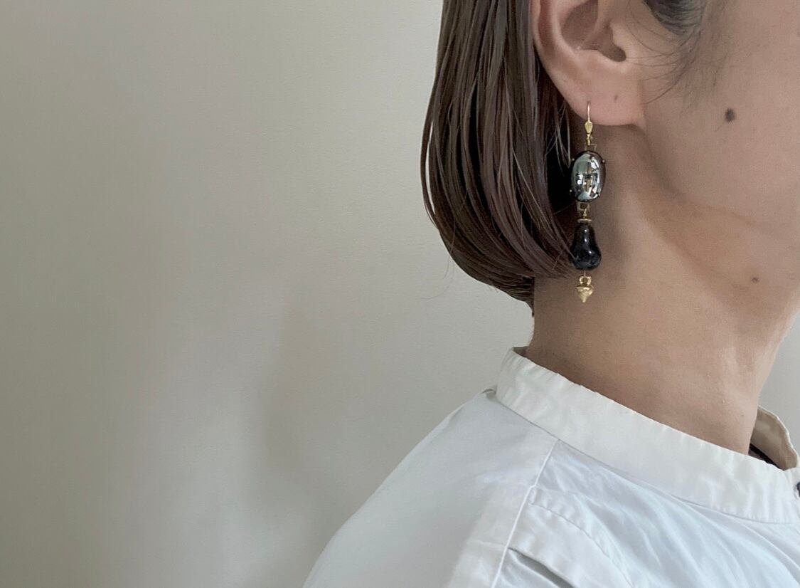 強めなパーツと優美なパーツをバランスよく合わせて、凛とした大人っぽい一品に仕上げました。デイリーからお呼ばれまで、幅広くお使い頂けるデザインです。