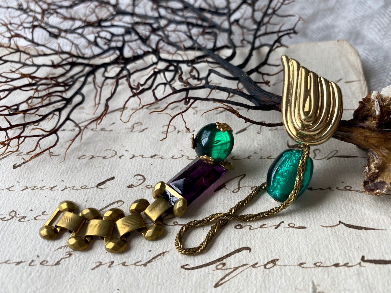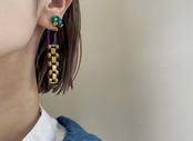 ヴィンテージパーツを組み合わせてアシンメトリーなピアスを作りました。